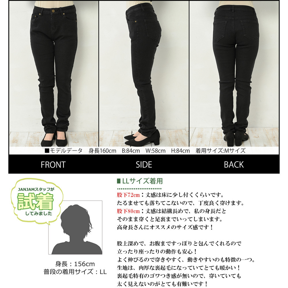 LL= ウエスト:78 ヒップ:102 前股上:28 後股上:39 渡り:28 裾周:31