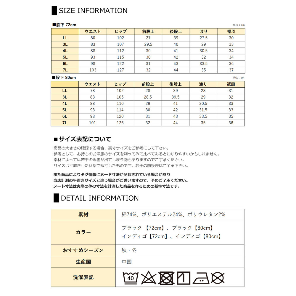 5L= ウエスト:93 ヒップ:115 前股上:30 後股上:42 渡り:32 裾周:34