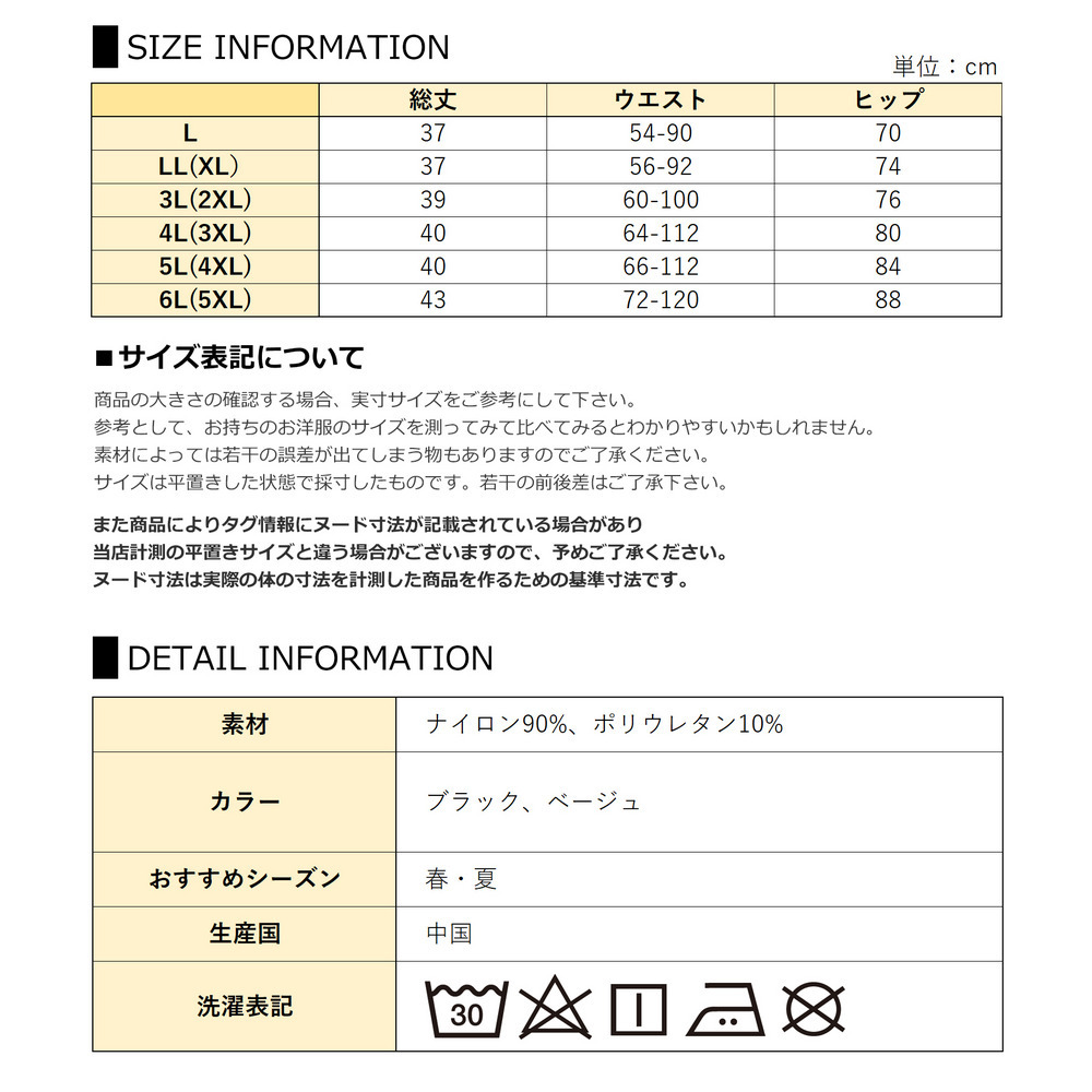 サイズ表記 L LL(XL) 3L(2XL) 4L(3XL) 5L(4XL) 6L(5XL) 総丈 37cm 37cm 39cm 40cm 40cm 43cm ウエスト 54~90cm 56~92cm 60~100cm 64~112cm 66~112cm 72~120cm ヒップ 70cm 74cm 76cm 80cm 84cm 88cm