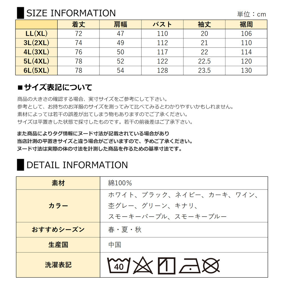 サイズ表記 LL 3L 4L 5L 6L 着丈 72cm 74cm 76cm 78cm 78cm 肩幅 47cm 49cm 50cm 52cm 54cm バスト 110cm 112cm 117cm 122cm 128cm 袖丈 20cm 21cm 22cm 22.5cm 23.5cm 裾周 106cm 110cm 114cm 120cm 130cm