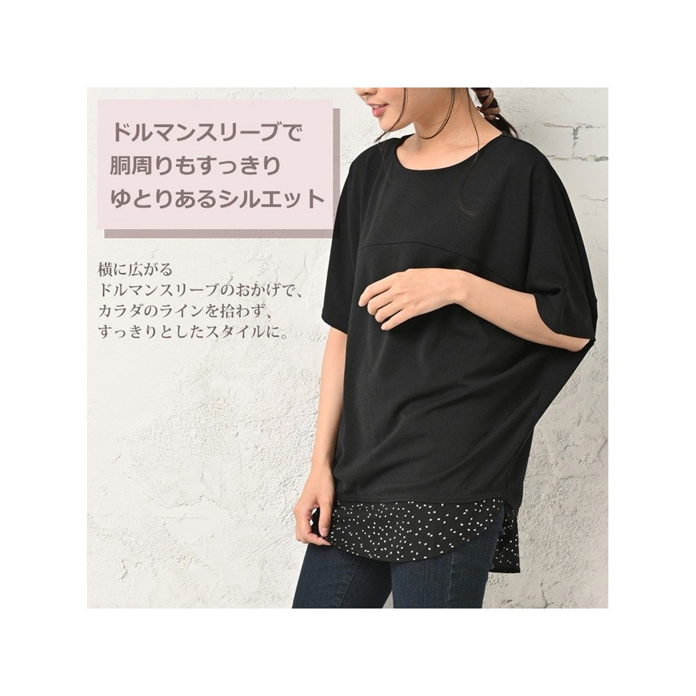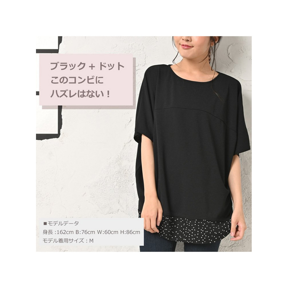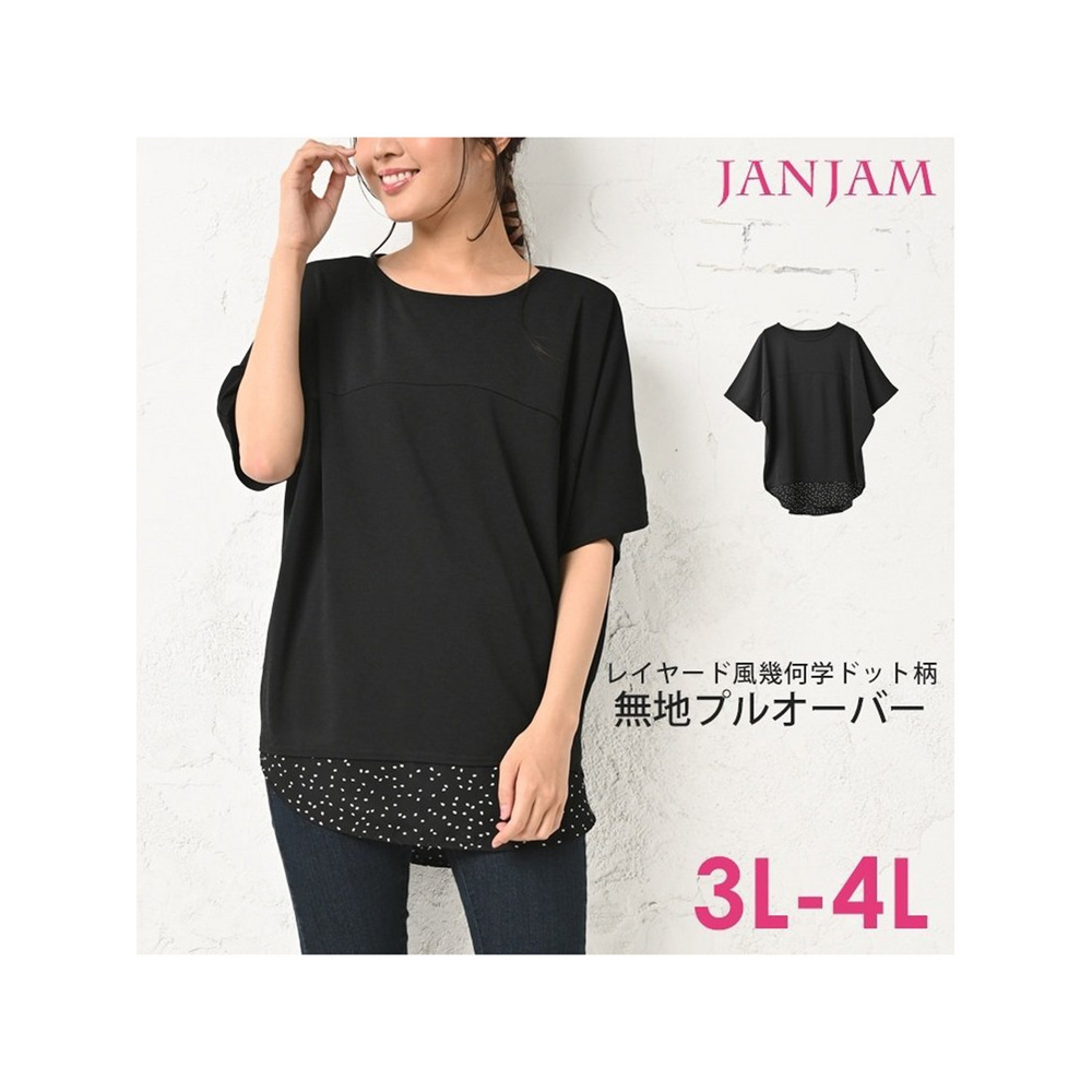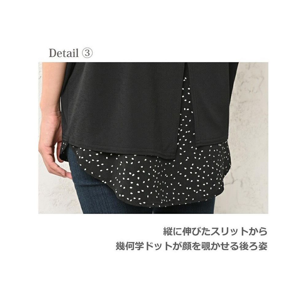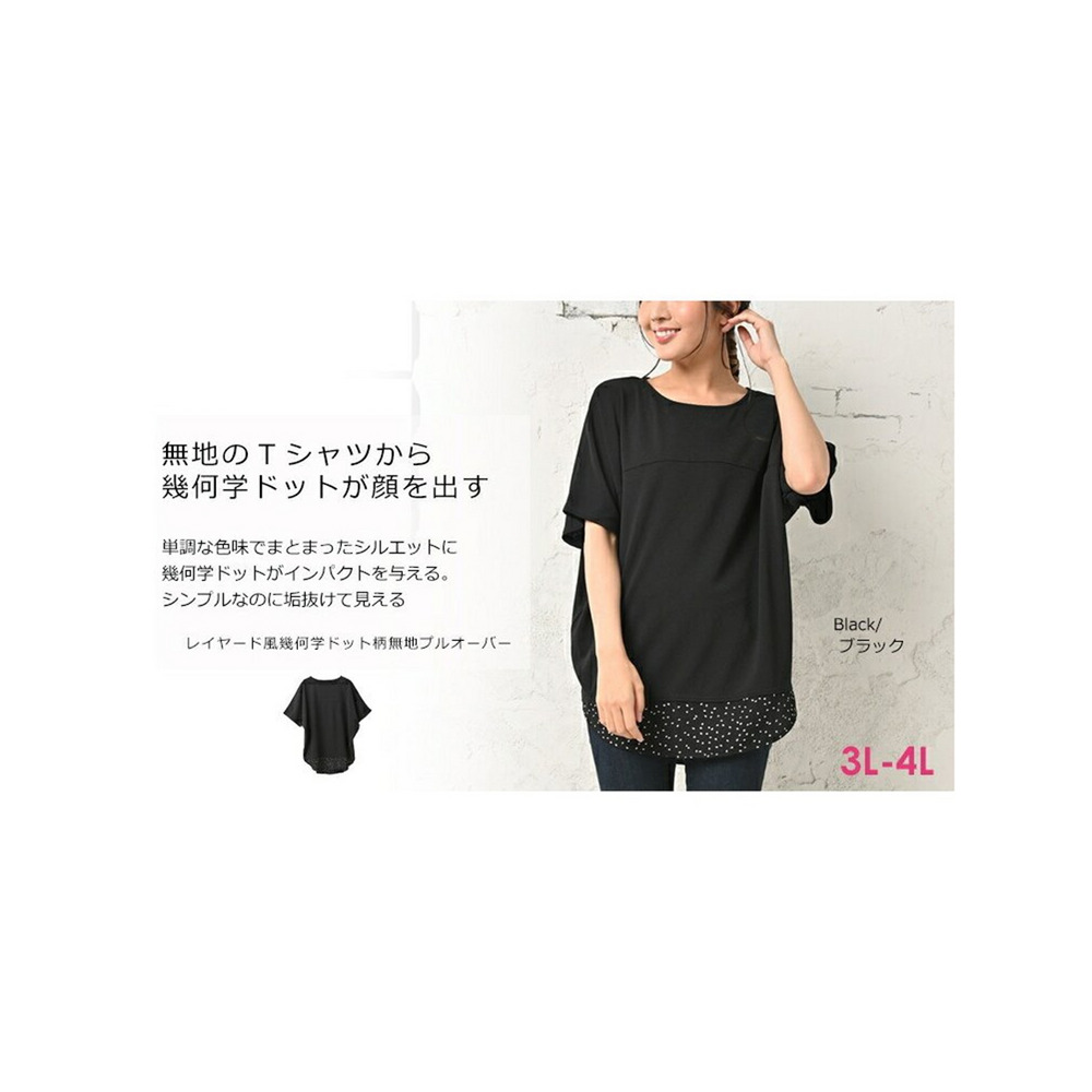 体型をカバーしつつお洒落も楽しむ。重ね着風幾何学ドット柄×無地プルオーバー 大きいサイズ レディース