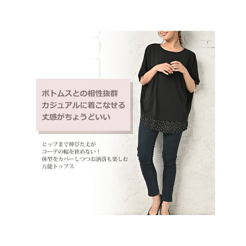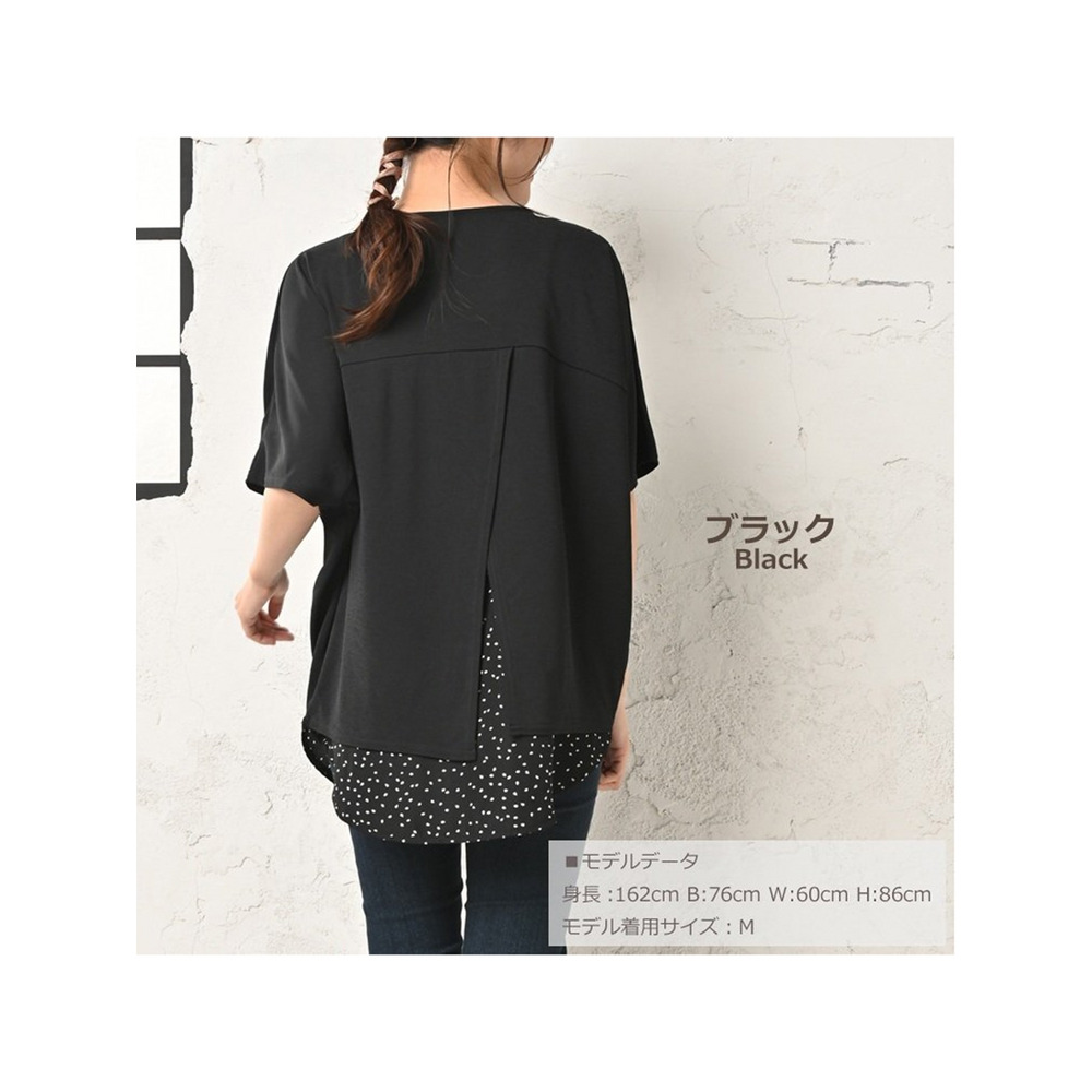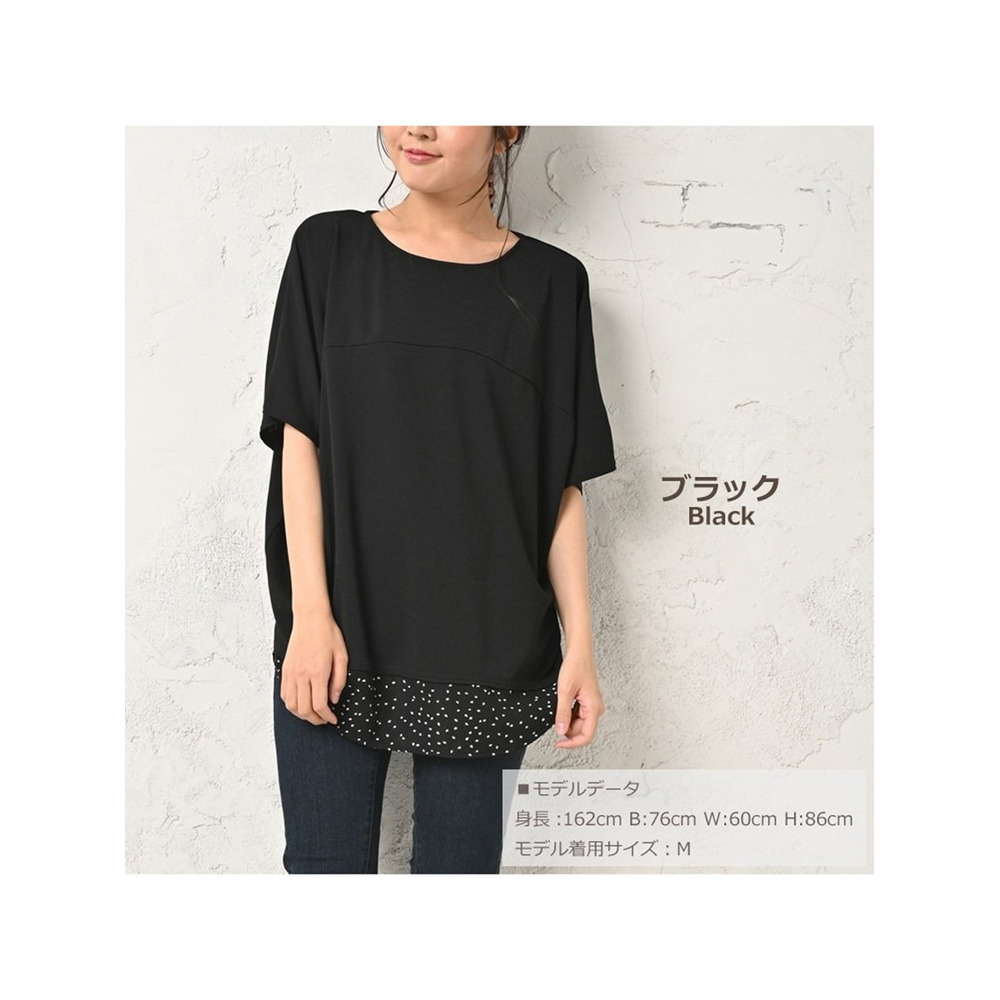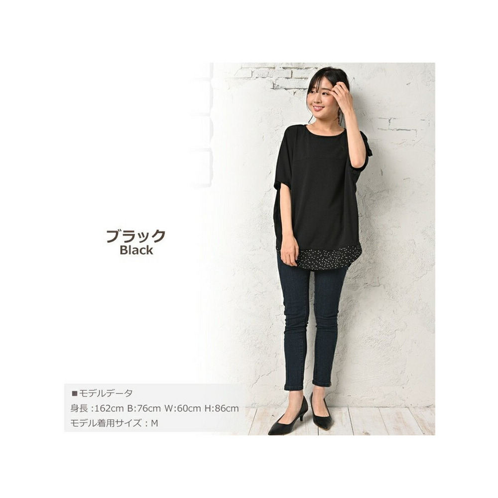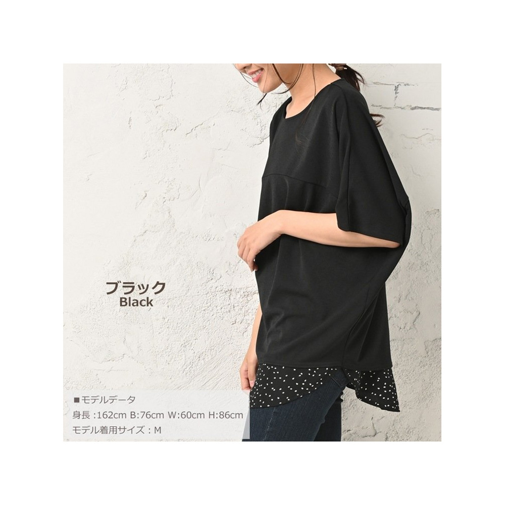 体型をカバーしつつお洒落も楽しむ。重ね着風幾何学ドット柄×無地プルオーバー 大きいサイズ レディース