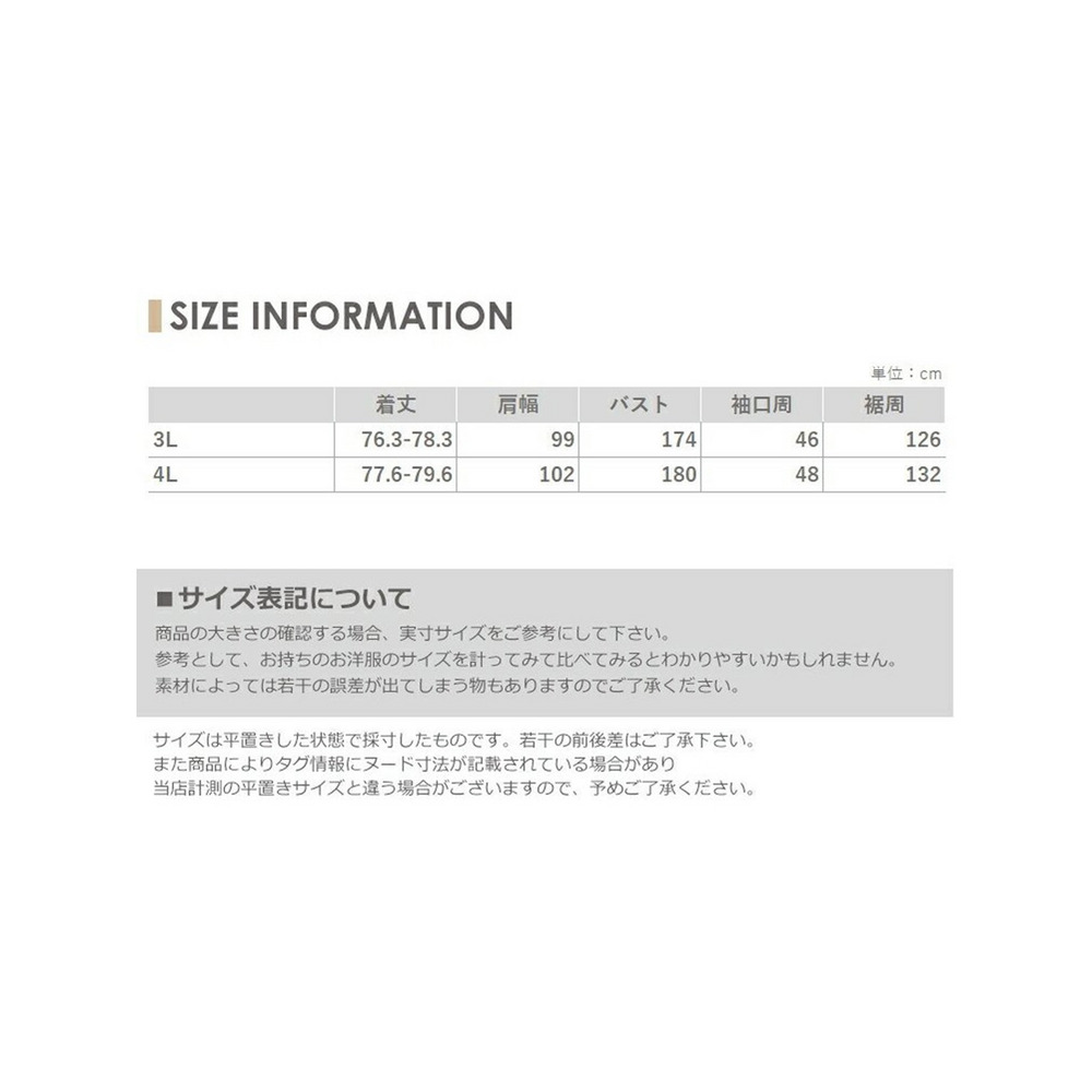 サイズ表記 3L(2XL) 着丈 76.3~78.3cm 肩幅 99cm バスト 174cm 袖口周 46cm 裾周 126cm