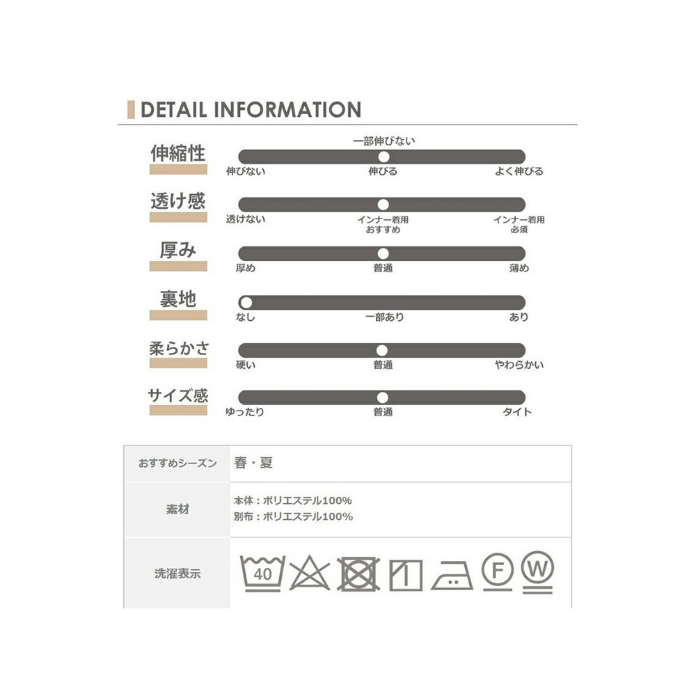 | 素材 | 本体:ポリエステル100% 別布:ポリエステル100% ■備考 伸縮性/伸びない(一部伸びる) 透け感/少し透ける 。インナー着用おすすめ。 厚み/普通 裏地/なし 硬さ/普通 モデル着用/Mサイズ |