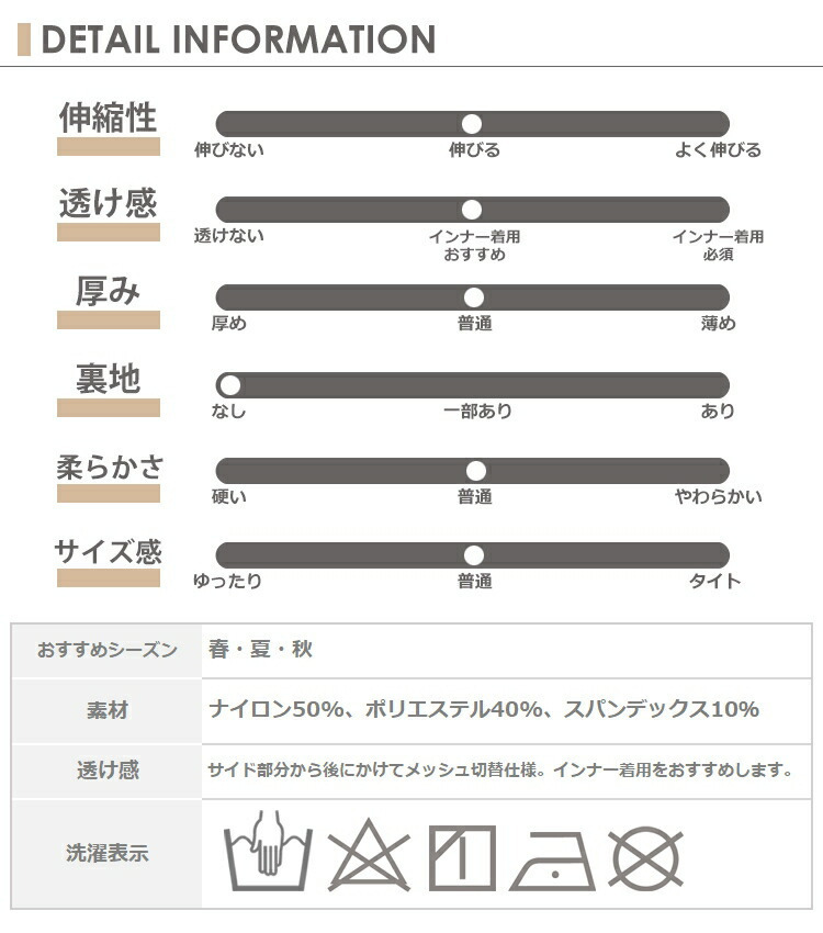| 素材 | ナイロン50%、ポリエステル40%、スパンデックス10% ■備考 伸縮/伸びる 透け感/透ける(メッシュ部分透ける。インナー着用おすすめ) 生地の厚み/普通 裏地/なし 硬さ/普通 モデル着用/Lサイズ |