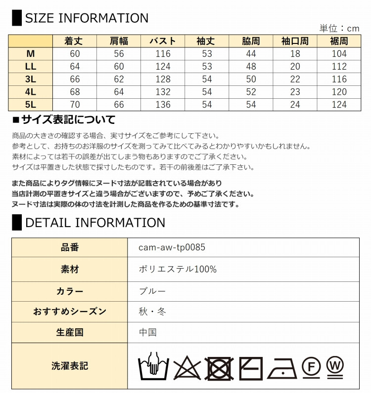 サイズ表記 LL 3L 4L 5L 着丈 64cm 66cm 68cm 70cm 肩幅 60cm 62cm 64cm 66cm バスト 124cm 128cm 132cm 136cm 袖丈 53cm 54cm 54cm 54cm 脇周 48cm 50cm 52cm 54cm 袖口周 20cm 22cm 23cm 24cm 裾周 112cm 116cm 120cm 124cm