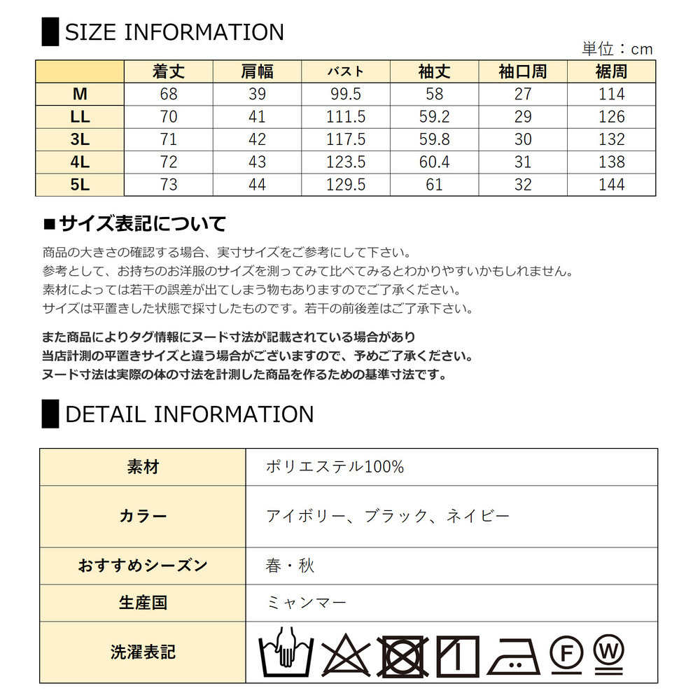 サイズ表記 LL 3L 4L 5L 着丈 70cm 71cm 72cm 73cm 肩幅 41cm 42cm 43cm 44cm バスト 111.5cm 117.5cm 123.5cm 129.5cm 袖丈 59.2cm 59.8cm 60.4cm 61cm 袖口周 29cm 30cm 31cm 32cm 裾周 126cm 132cm 138cm 144cm