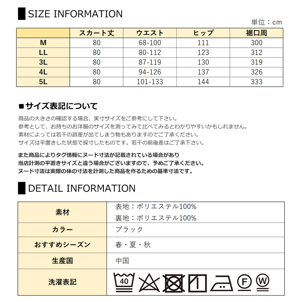 サイズ表記 LL 4L 5L スカート丈 80cm 80cm 80cm ウエスト 80~112cm 94~126cm 101~133cm ヒップ 123cm 137cm 144cm 裾口周 312cm 326cm 333cm