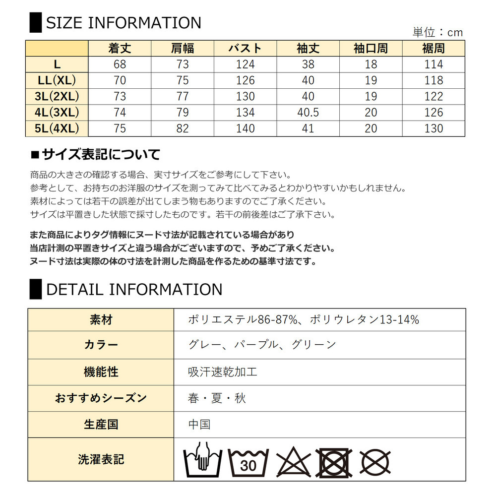 サイズ表記 L LL 3L 4L 5L 着丈 68cm 70cm 73cm 74cm 75cm 肩幅 73cm 75cm 77cm 79cm 82cm バスト 124cm 126cm 130cm 134cm 140cm 袖丈 38cm 40cm 40cm 40.5cm 41cm 袖口周 18cm 19cm 19cm 20cm 20cm 裾周 114cm 118cm 122cm 126cm 130cm