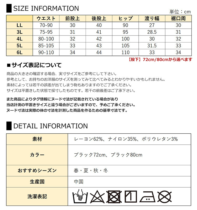 サイズ表記 LL 3L 4L 5L 6L ウエスト 70~90cm 75~95cm 80~100cm 85~105cm 90~110cm 前股上 30cm 31cm 32cm 33cm 34cm 後股上 40cm 41cm 42cm 43cm 44cm ヒップ 90cm 95cm 100cm 105cm 110cm 渡り幅 27cm 28.5cm 30cm 31.5cm 33cm 裾口周 30cm 31cm 32cm 33cm 34cm