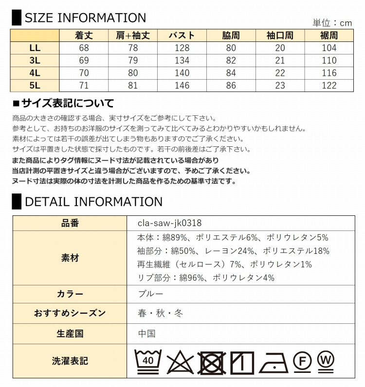 素材 本体:綿89%、ポリエステル6%、ポリウレタン5% 袖部分:綿50%、レーヨン24%、ポリエステル18%       再生繊維(セルロース)7%、ポリウレタン1% リブ部分:綿96%、ポリウレタン4% ■備考 伸縮性/伸びる 透け感/透けない 厚み/普通 裏地/なし 硬さ/普通 モデル着用/LLサイズ