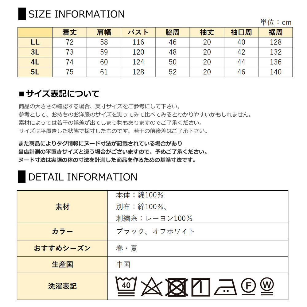 サイズ表記 LL 3L 4L 5L 着丈 72cm 73cm 74cm 75cm 肩幅 58cm 59cm 60cm 61cm バスト 116cm 120cm 124cm 128cm 脇周 46cm 48cm 50cm 52cm 袖丈 20cm 20cm 20cm 20cm 袖口周 40cm 42cm 44cm 46cm 裾周 128cm 132cm 136cm 140cm