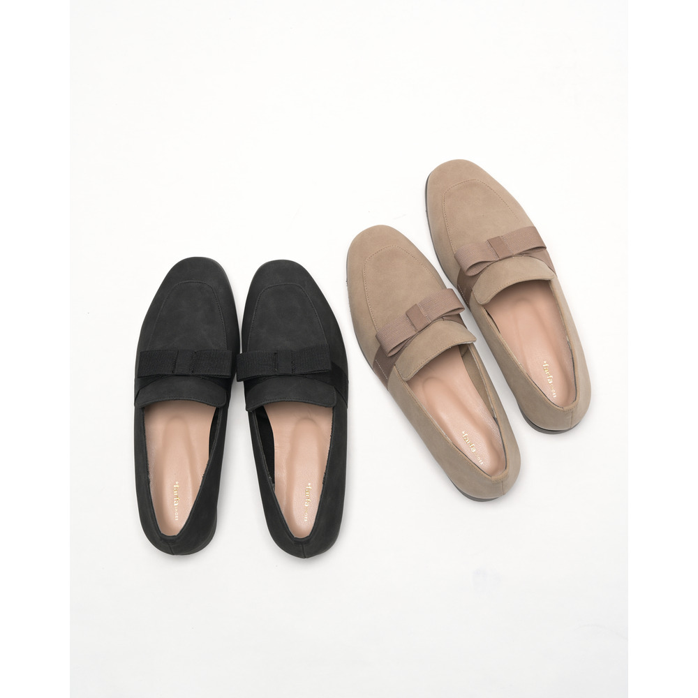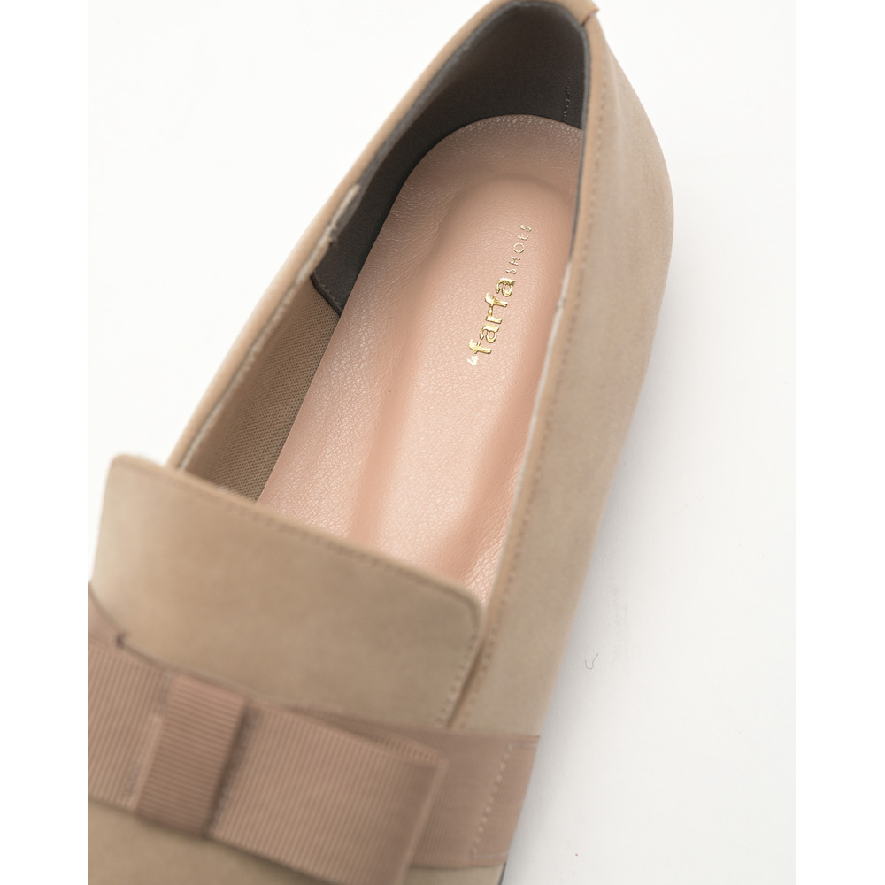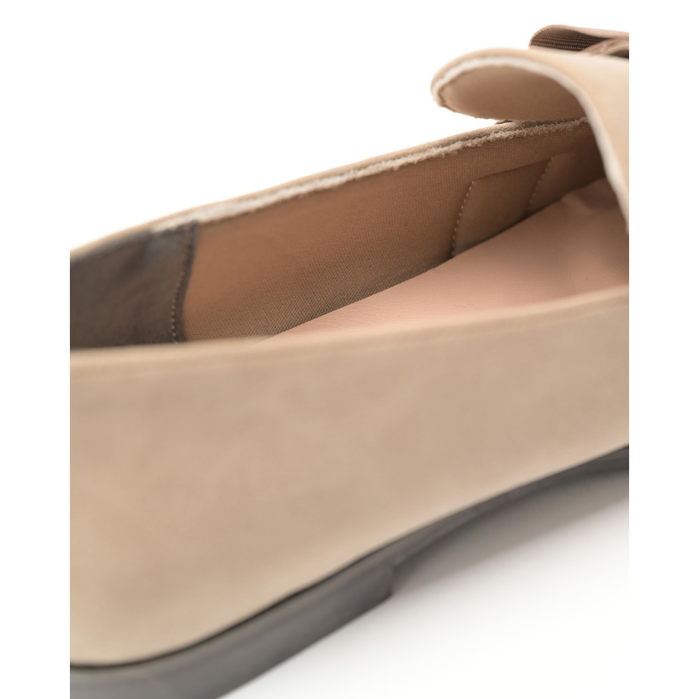 踵の形状で靴擦れしやすい方のために、踵は柔らかい作りで踏んでも履けるバブーシュデザインに。