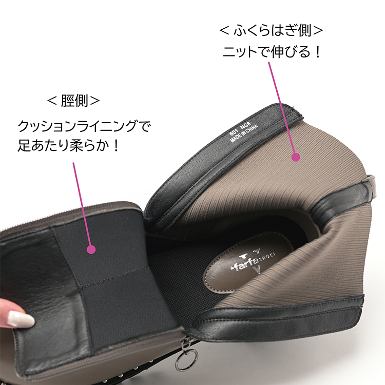 しゃがんだり、椅子に座るだけでも食い込んでくるブーツってあるから、筒部分の素材って本当に重要。夕方むくんできても安心です。