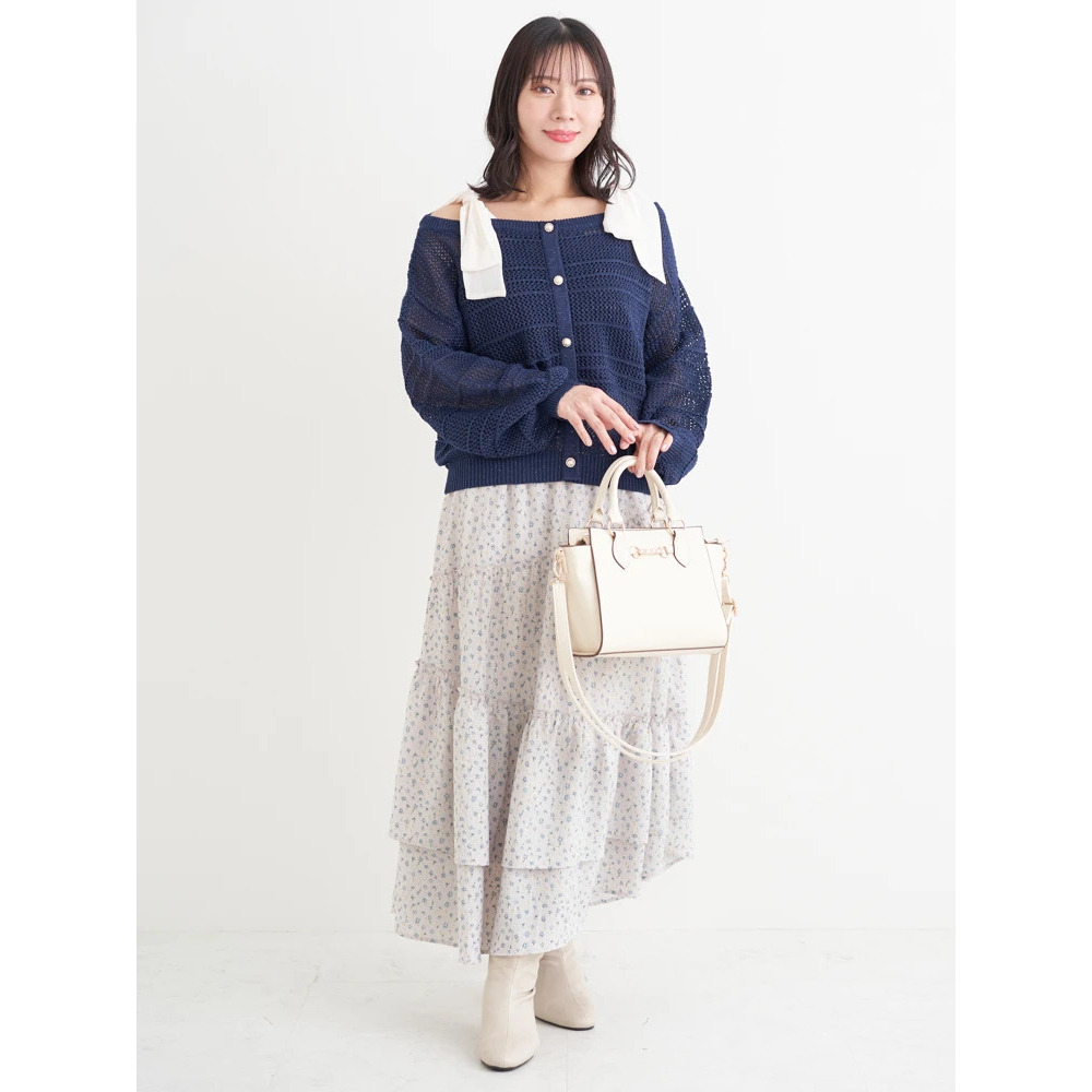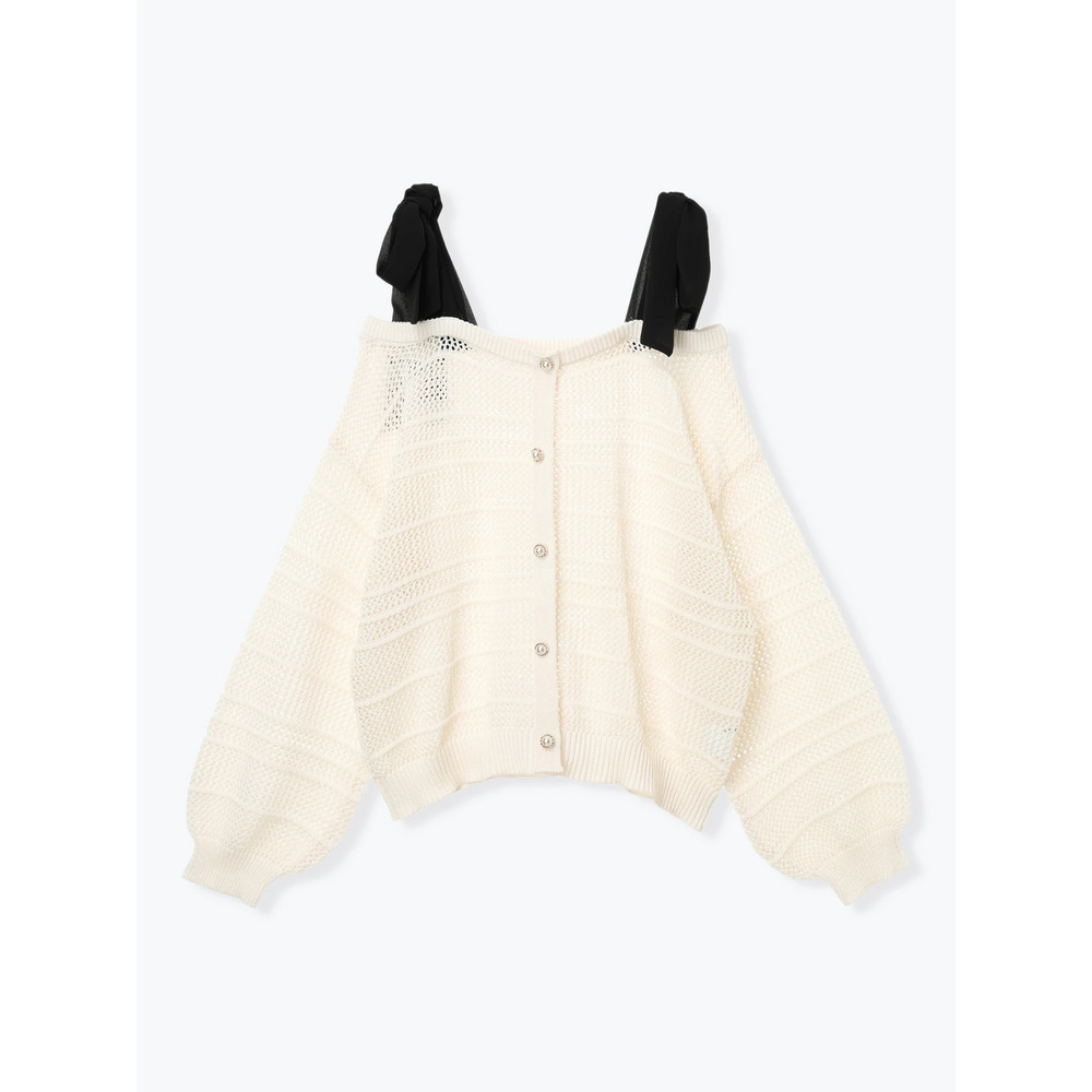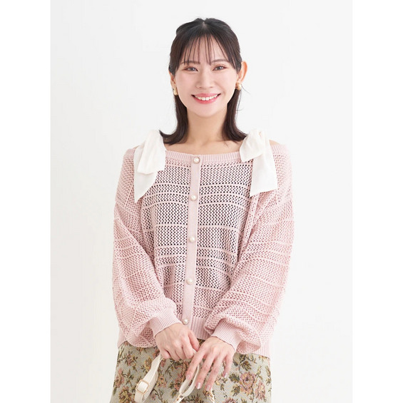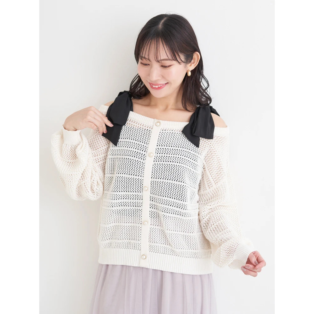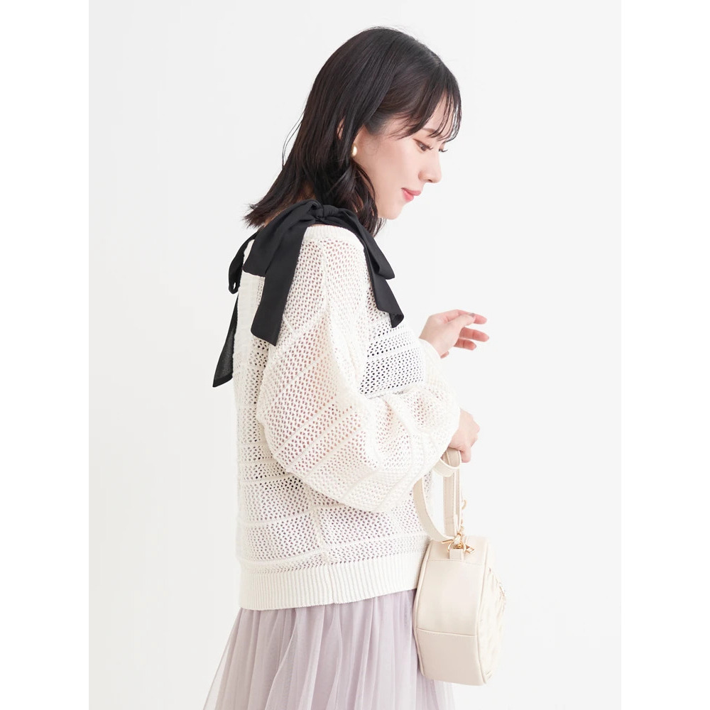 ・肩周りの華奢見せも叶えながら小顔効果まで発揮するショルダーリボンデザイン。