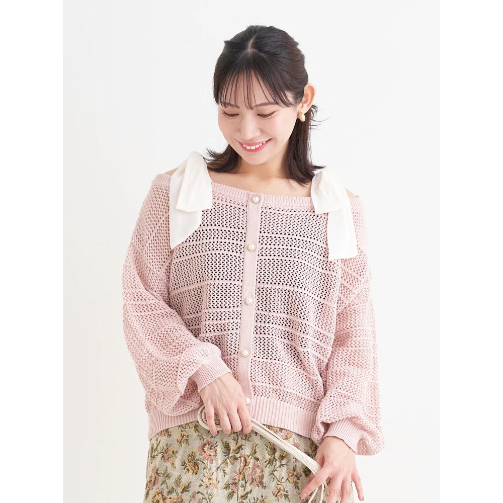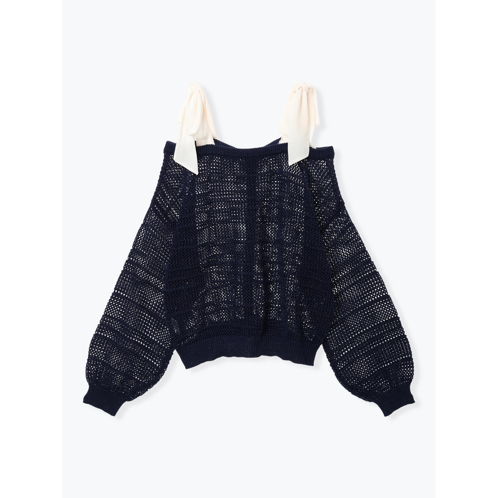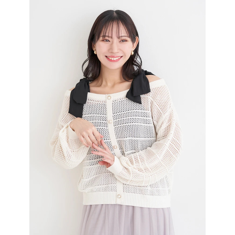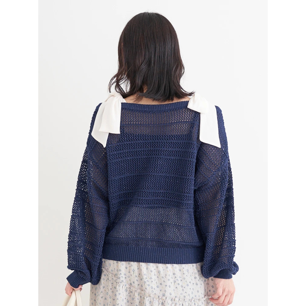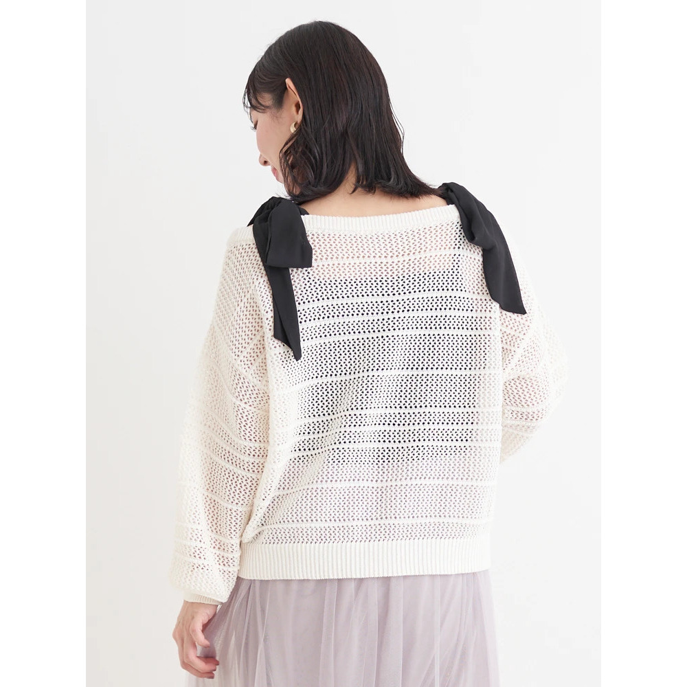 【WEB限定】ショルダーリボンラメ入りオフショルニットトップス