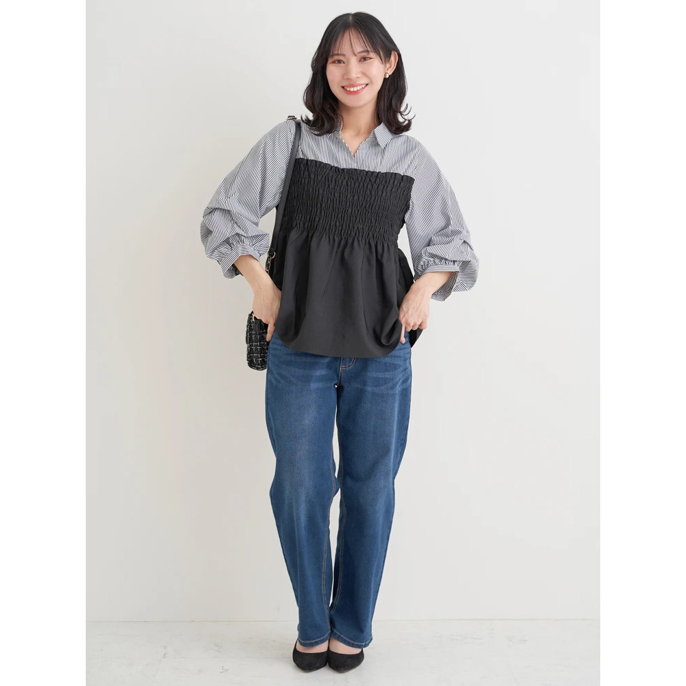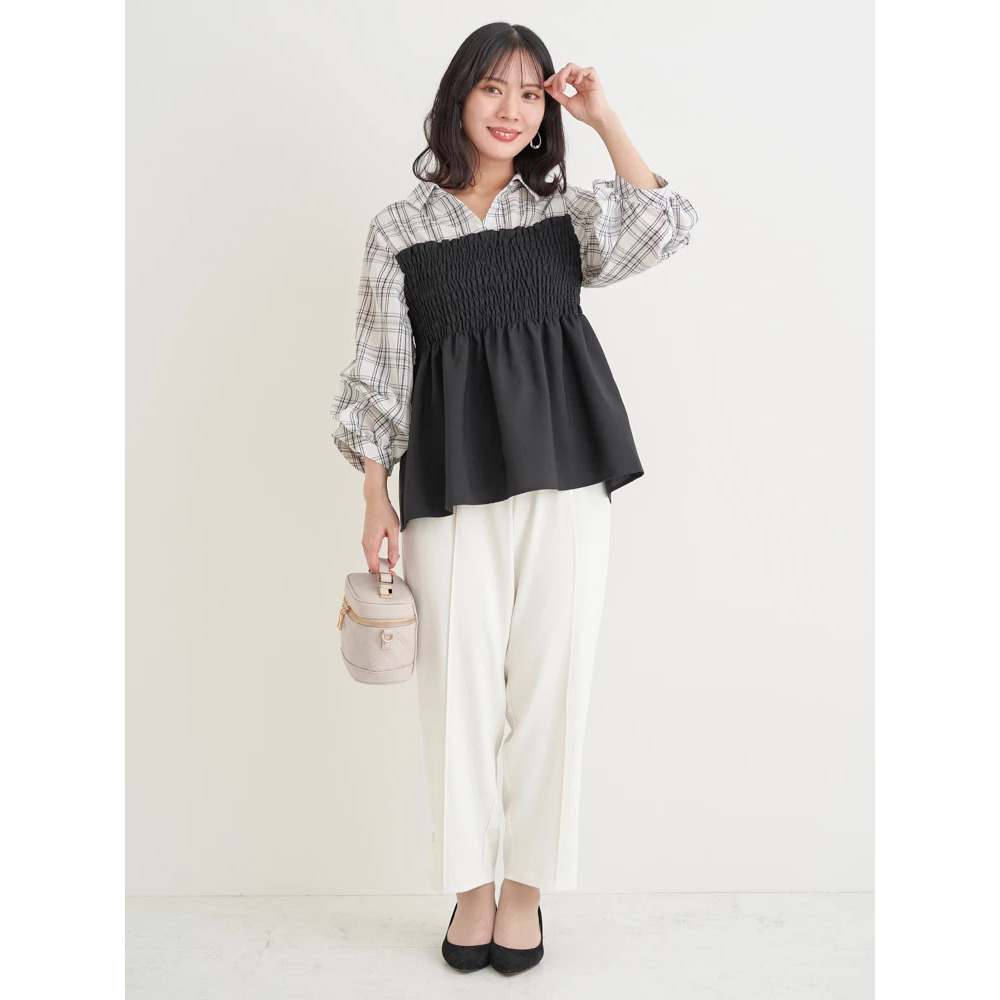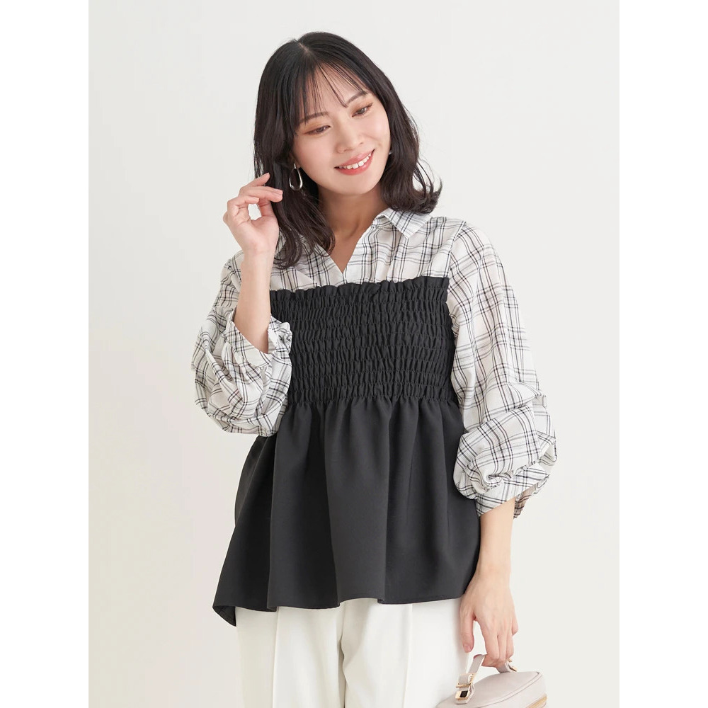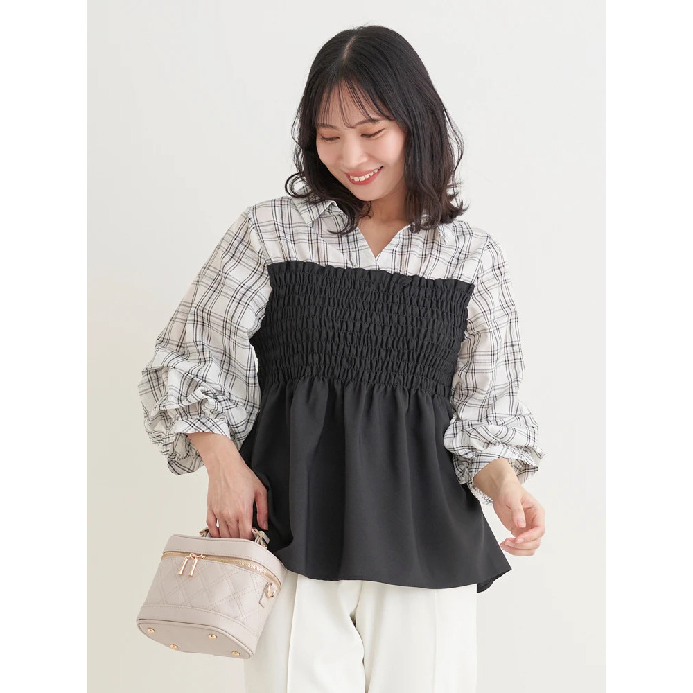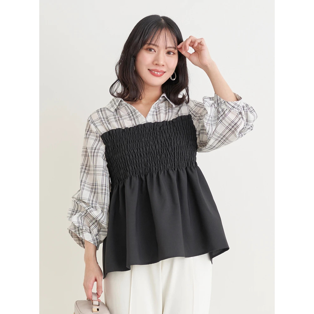 | 素材 | 【無地・ストライプ柄】[身頃上部・袖] ポリエステル100%[ビスチェ部分] ポリエステル100%【チェック柄】[身頃上部・袖] ポリエステル60%綿40%[ビスチェ部分] ポリエステル100% |