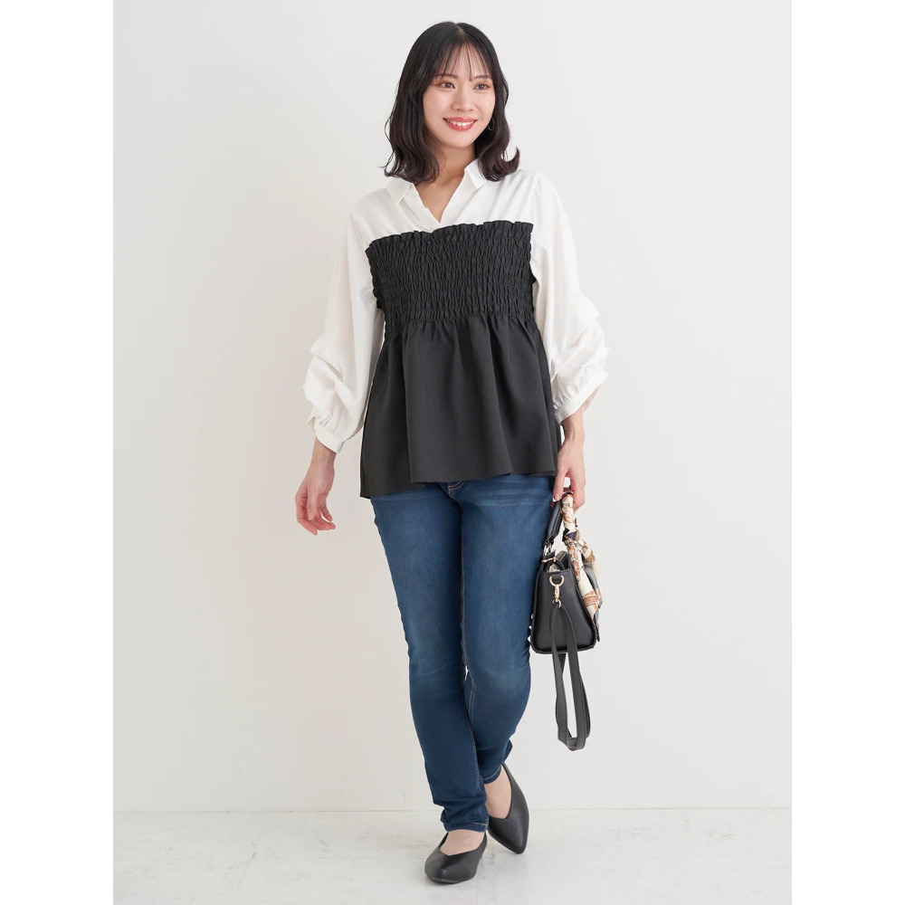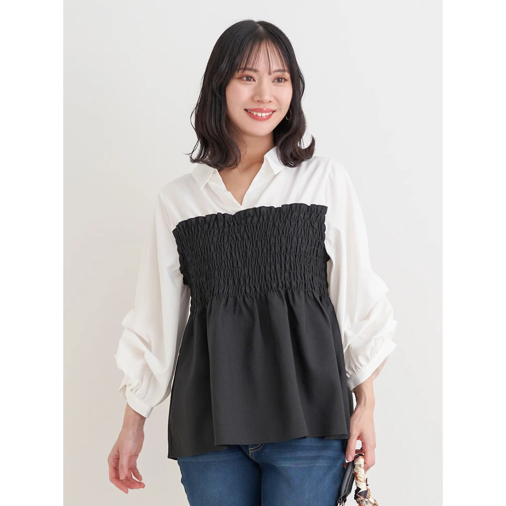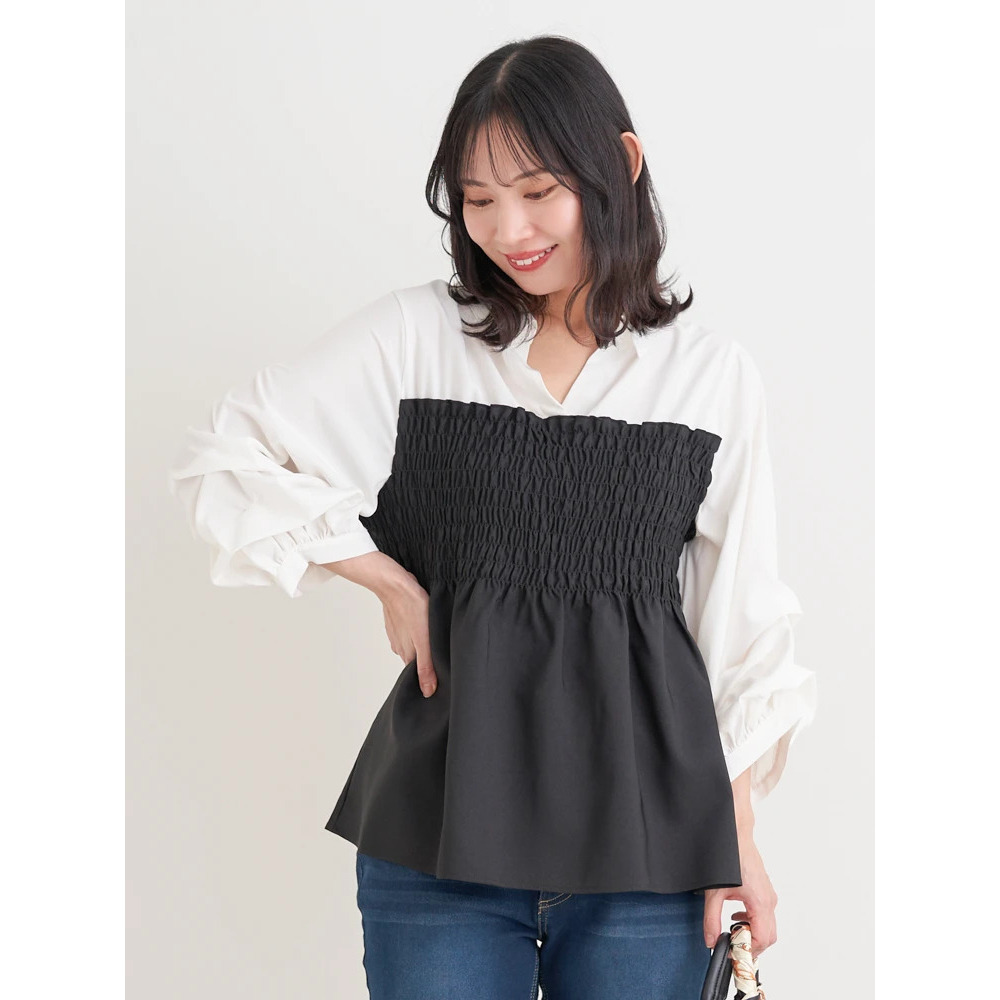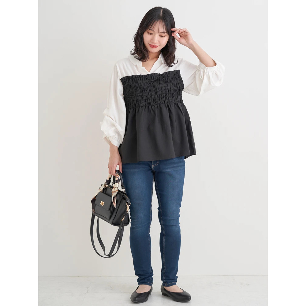 ・胸元のシャーリングで引き締め、フレア感のあるシルエットでお腹周りをカバーしてくれる細見えアイテム。