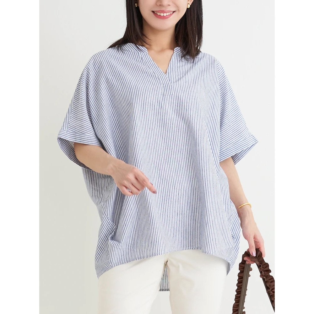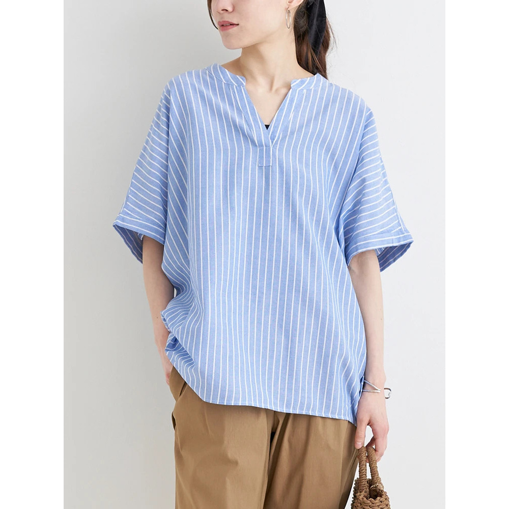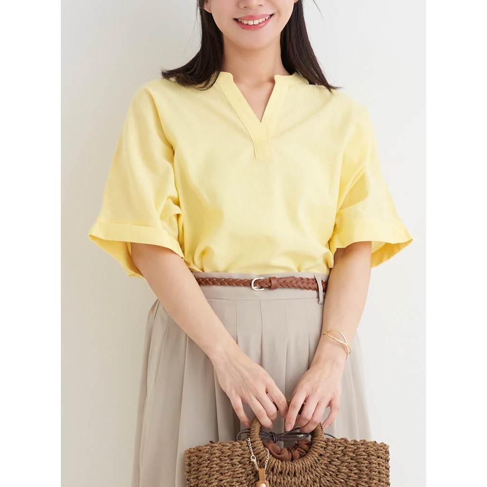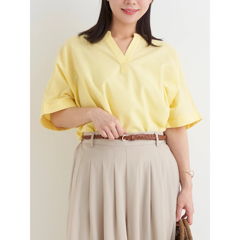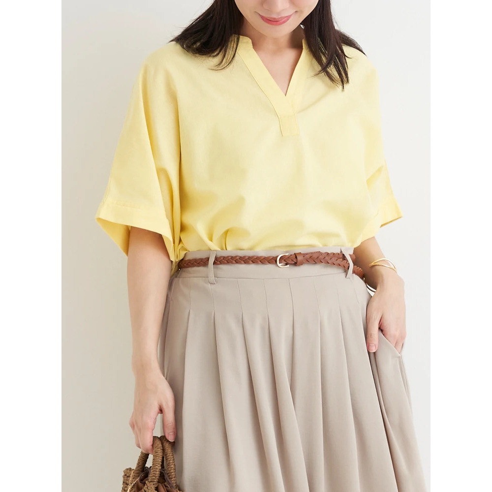 【涼風リネン】スキッパーネックバンドカラーブラウス