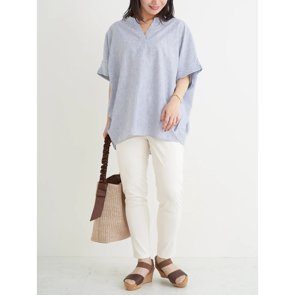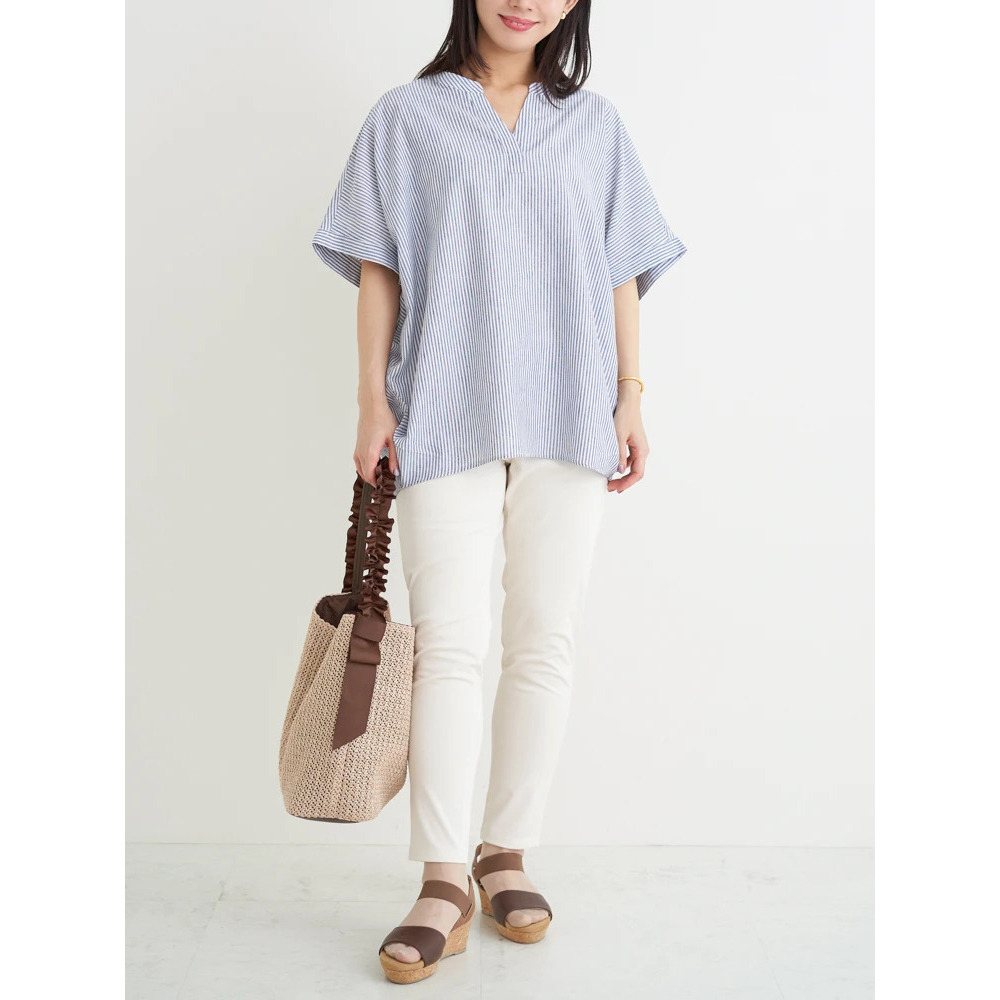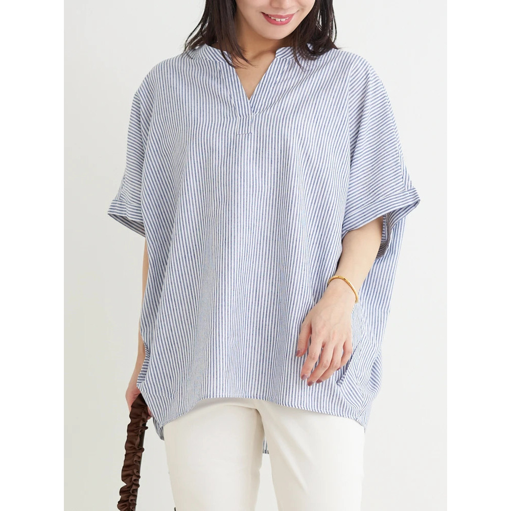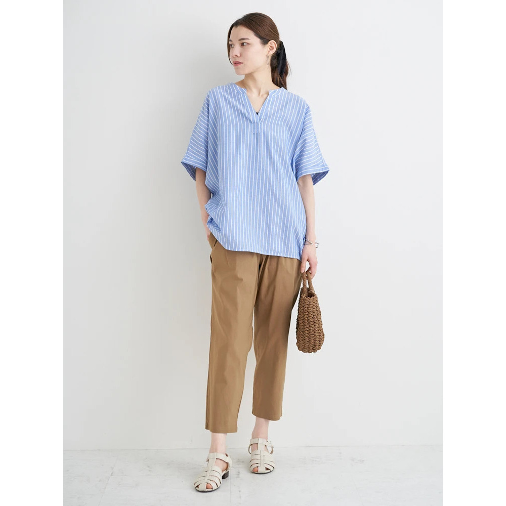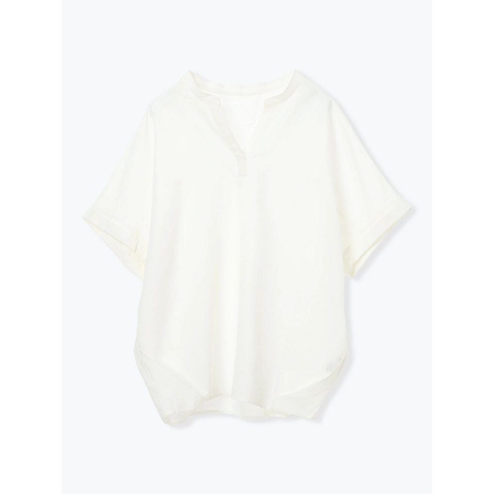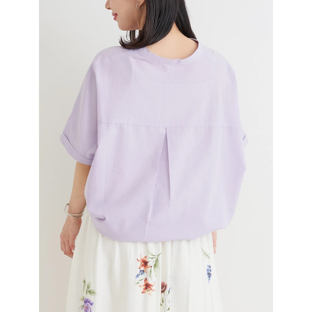 【涼風リネン】スキッパーネックバンドカラーブラウス