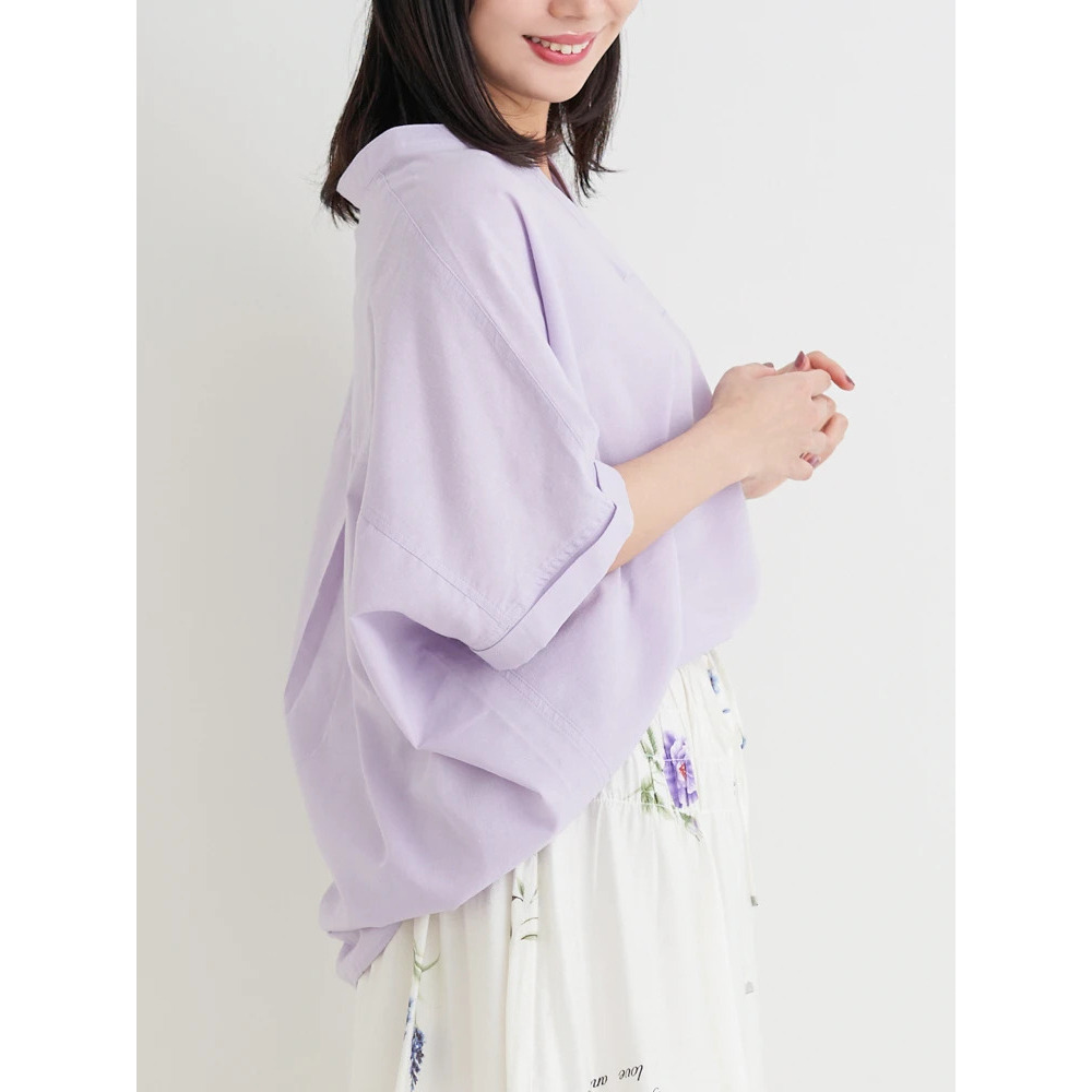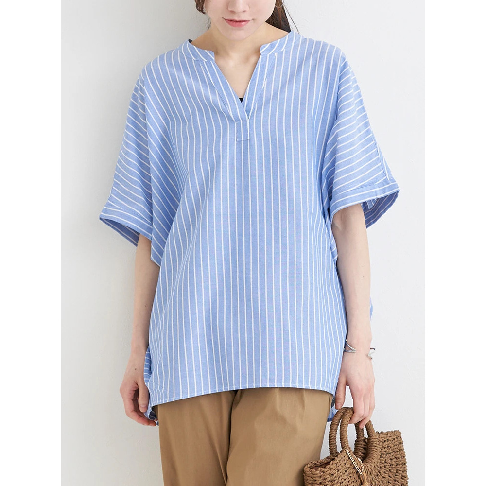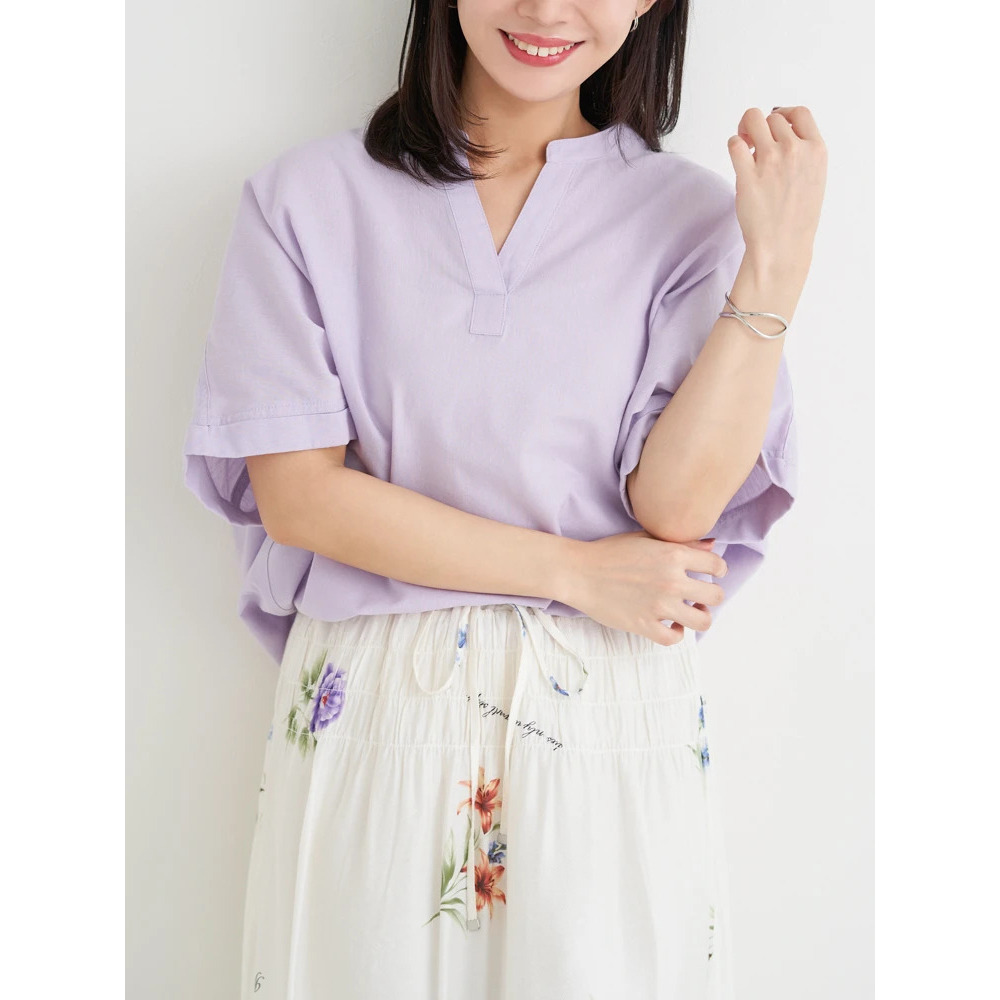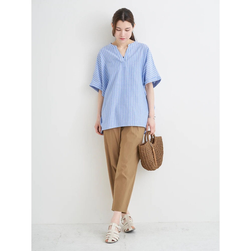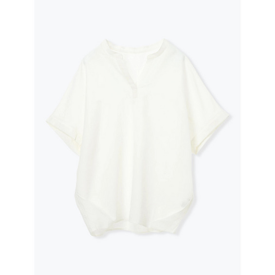 【涼風リネン】スキッパーネックバンドカラーブラウス
