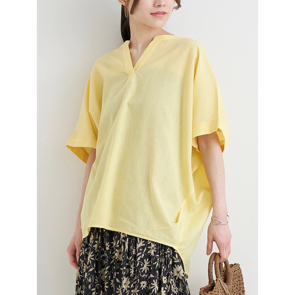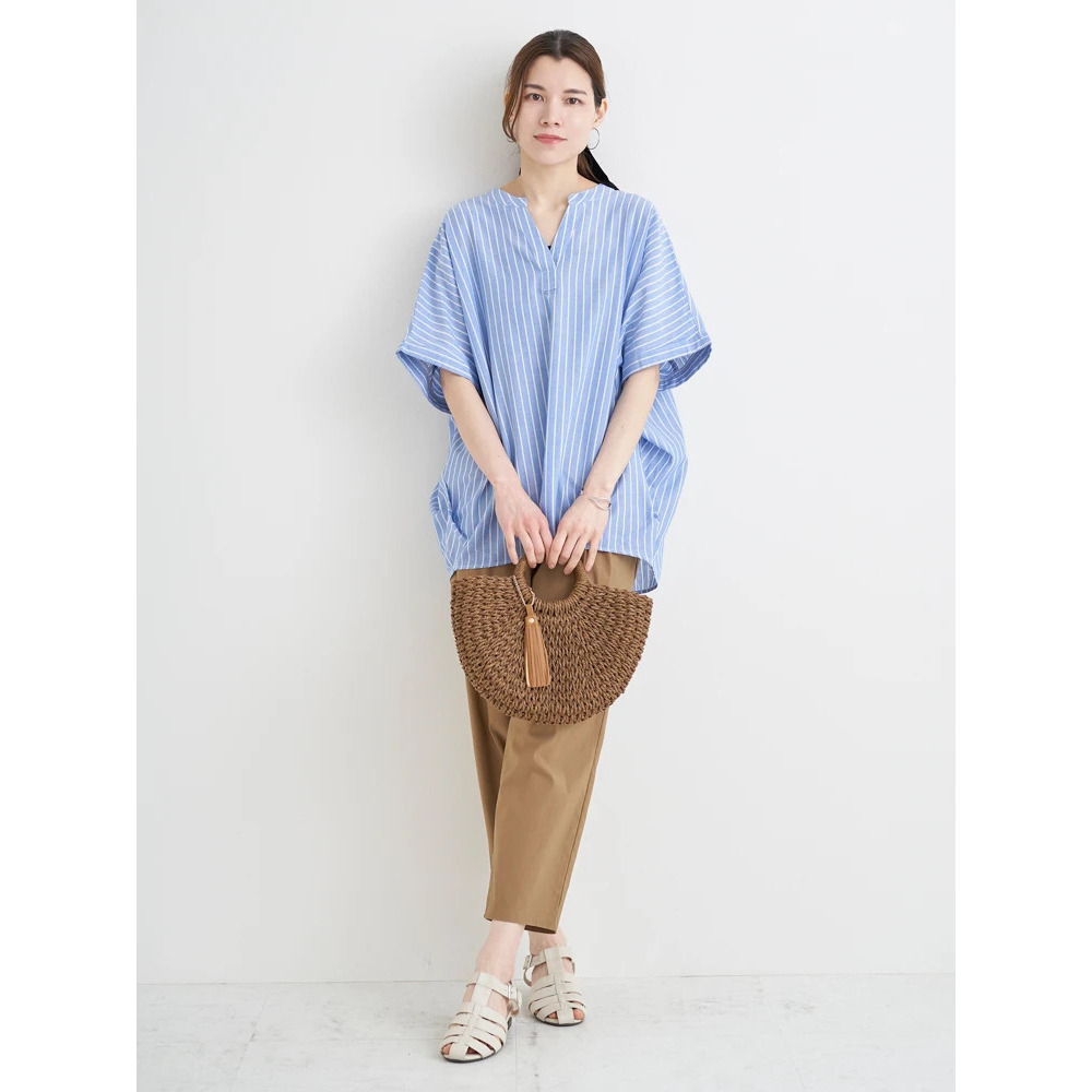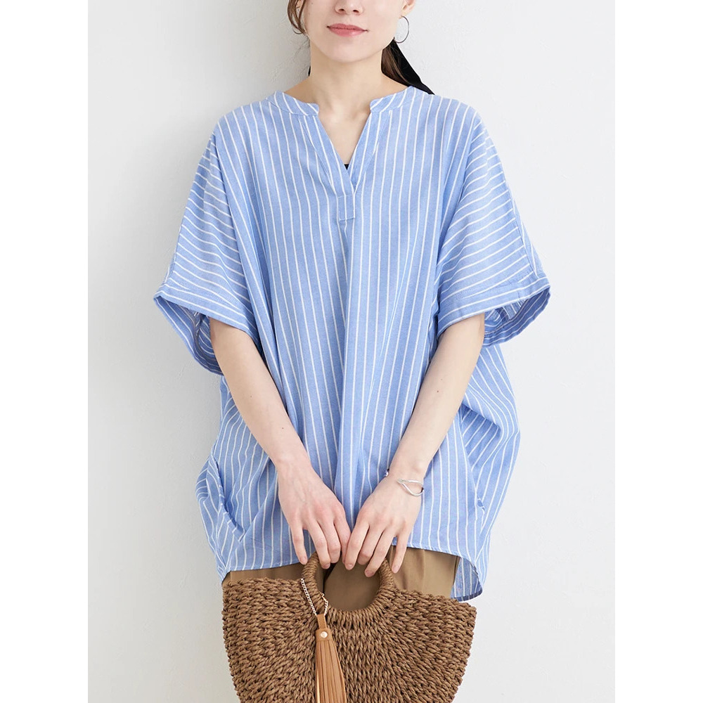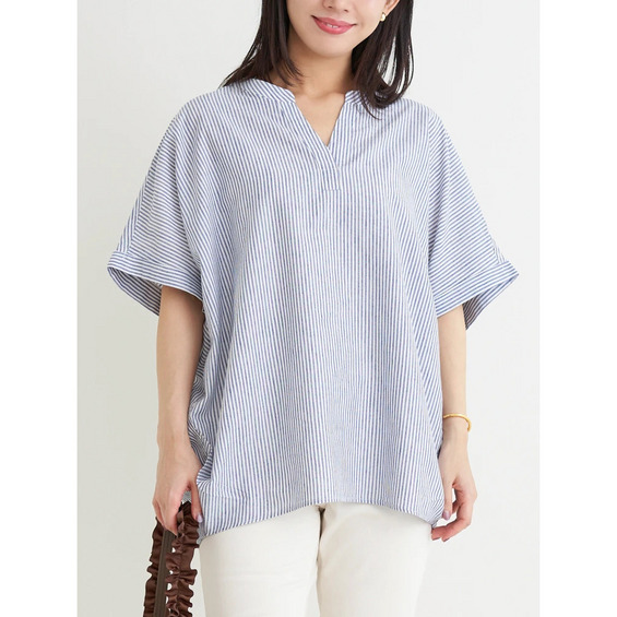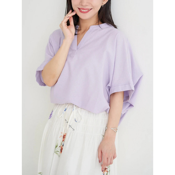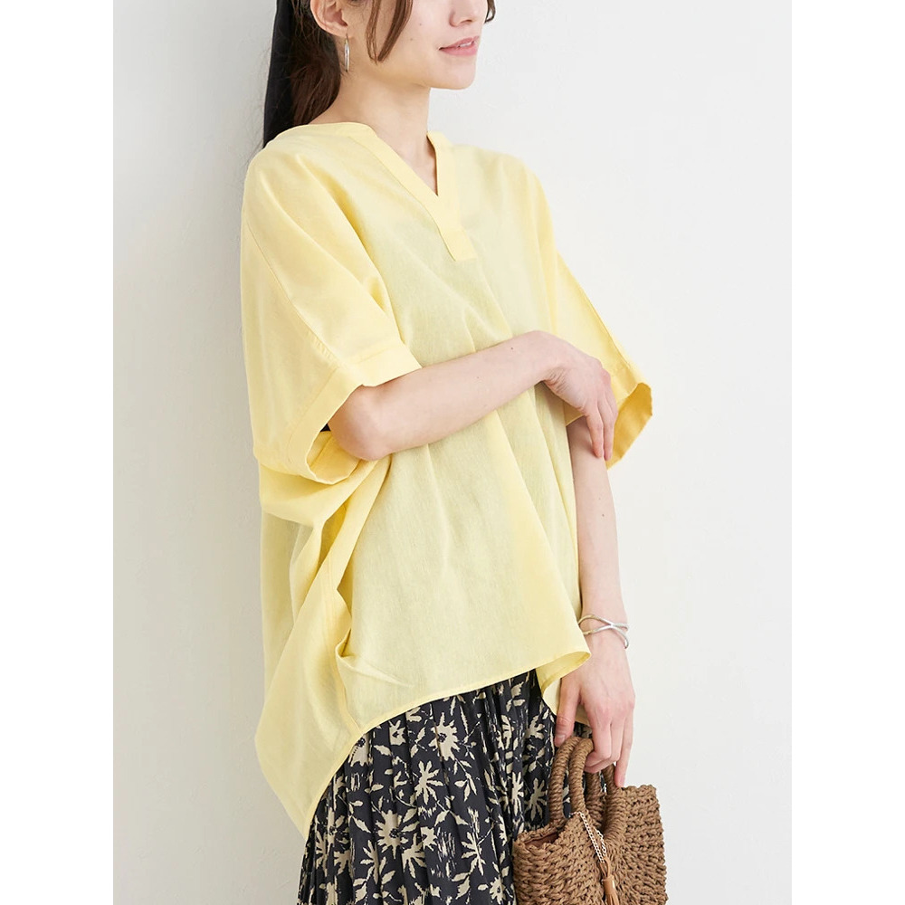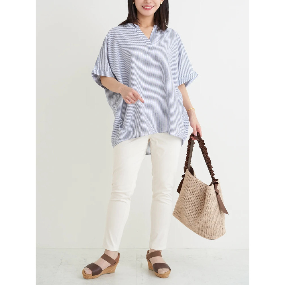 【涼風リネン】スキッパーネックバンドカラーブラウス