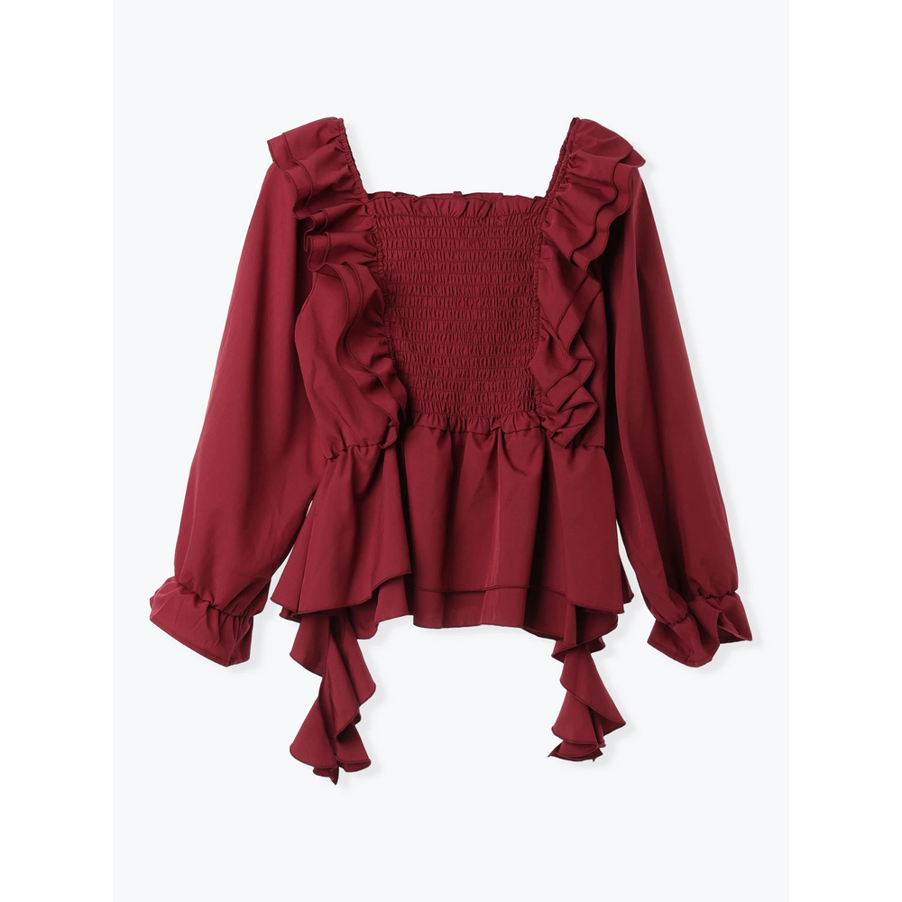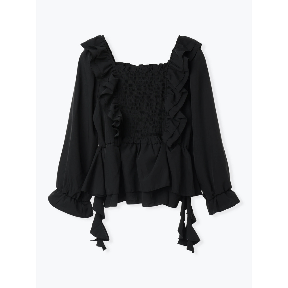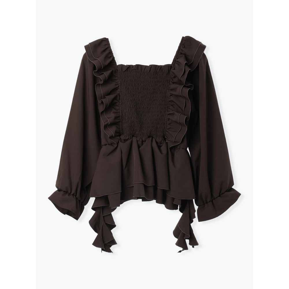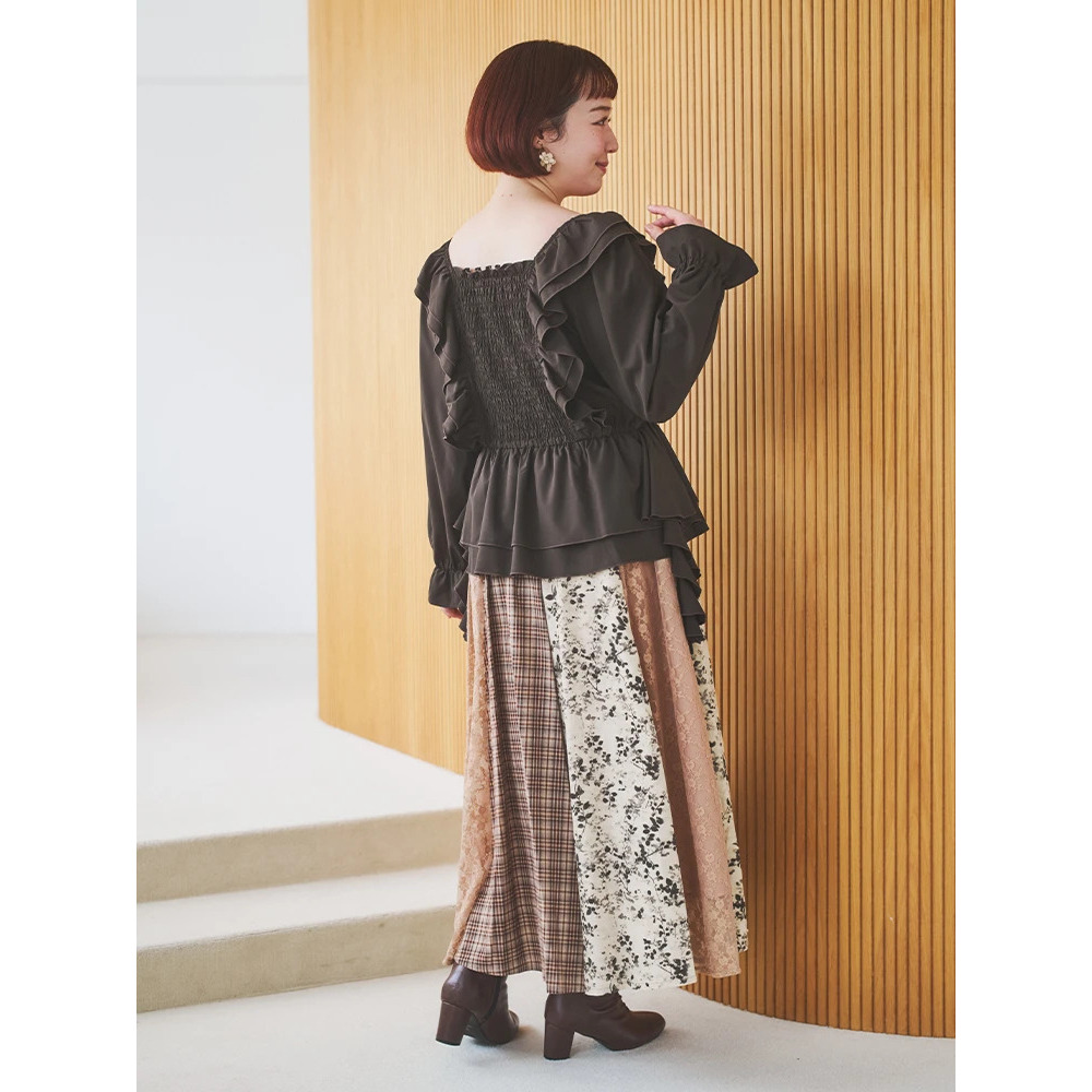 ・胸元と背面はシャーリング仕様になっており、フィット感のある着心地。