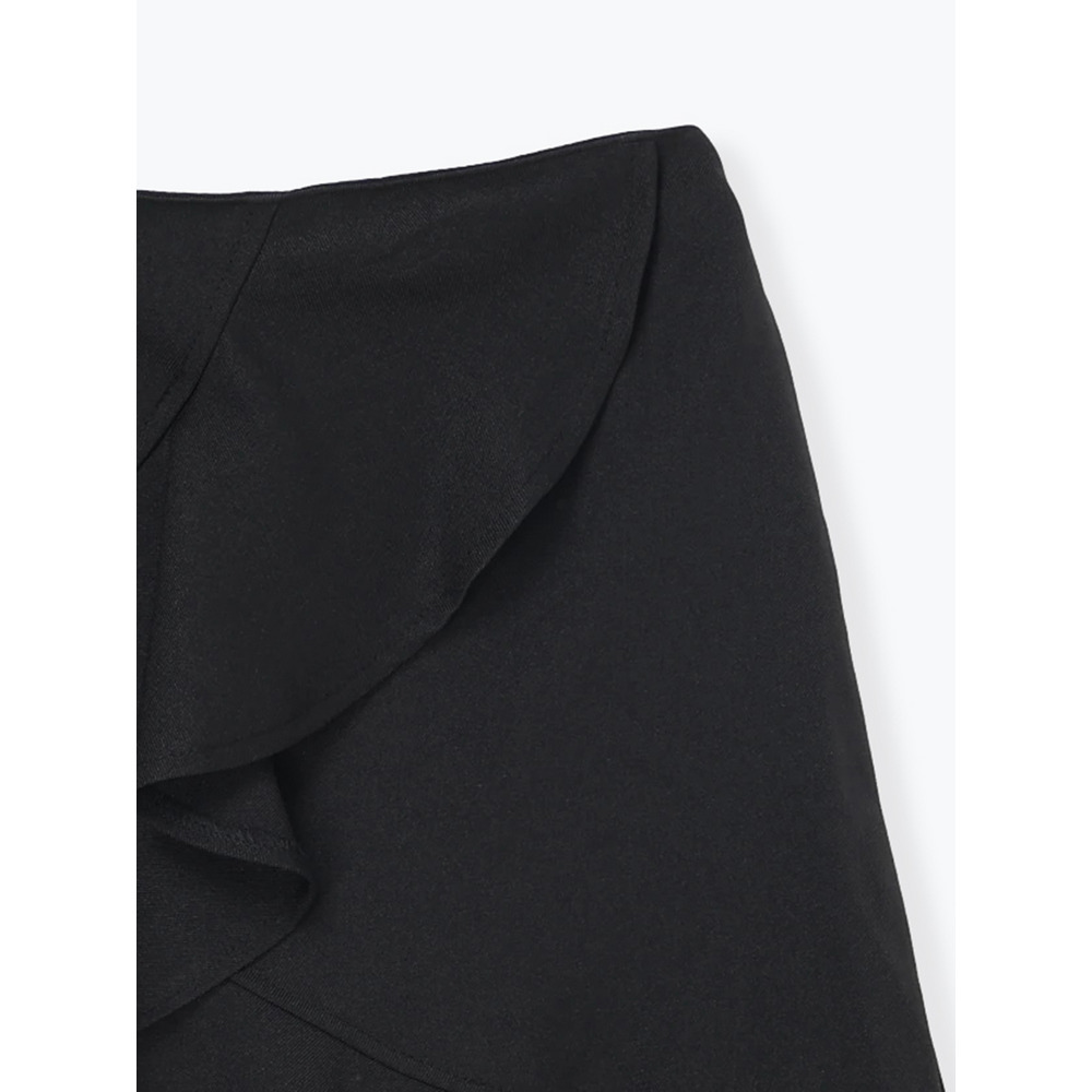 ・アシメに配したラッフルで肉感カバー