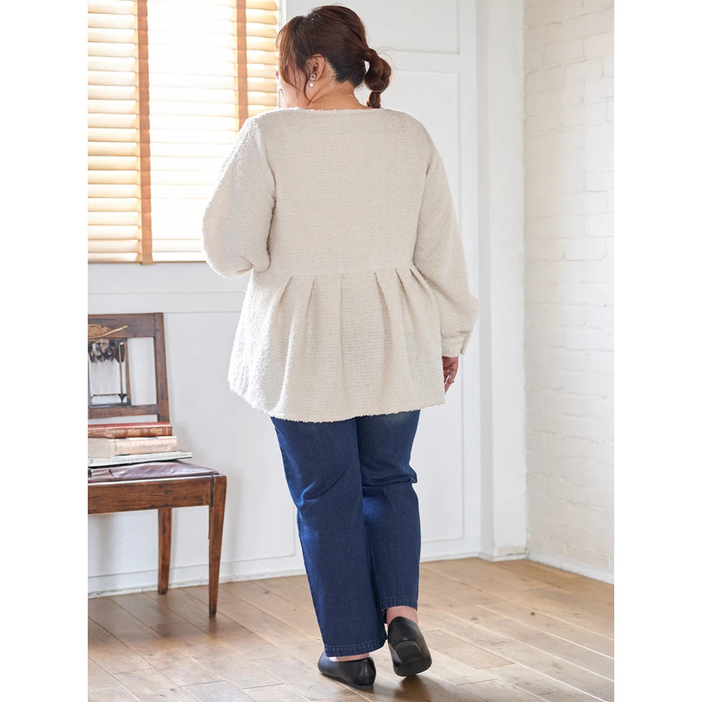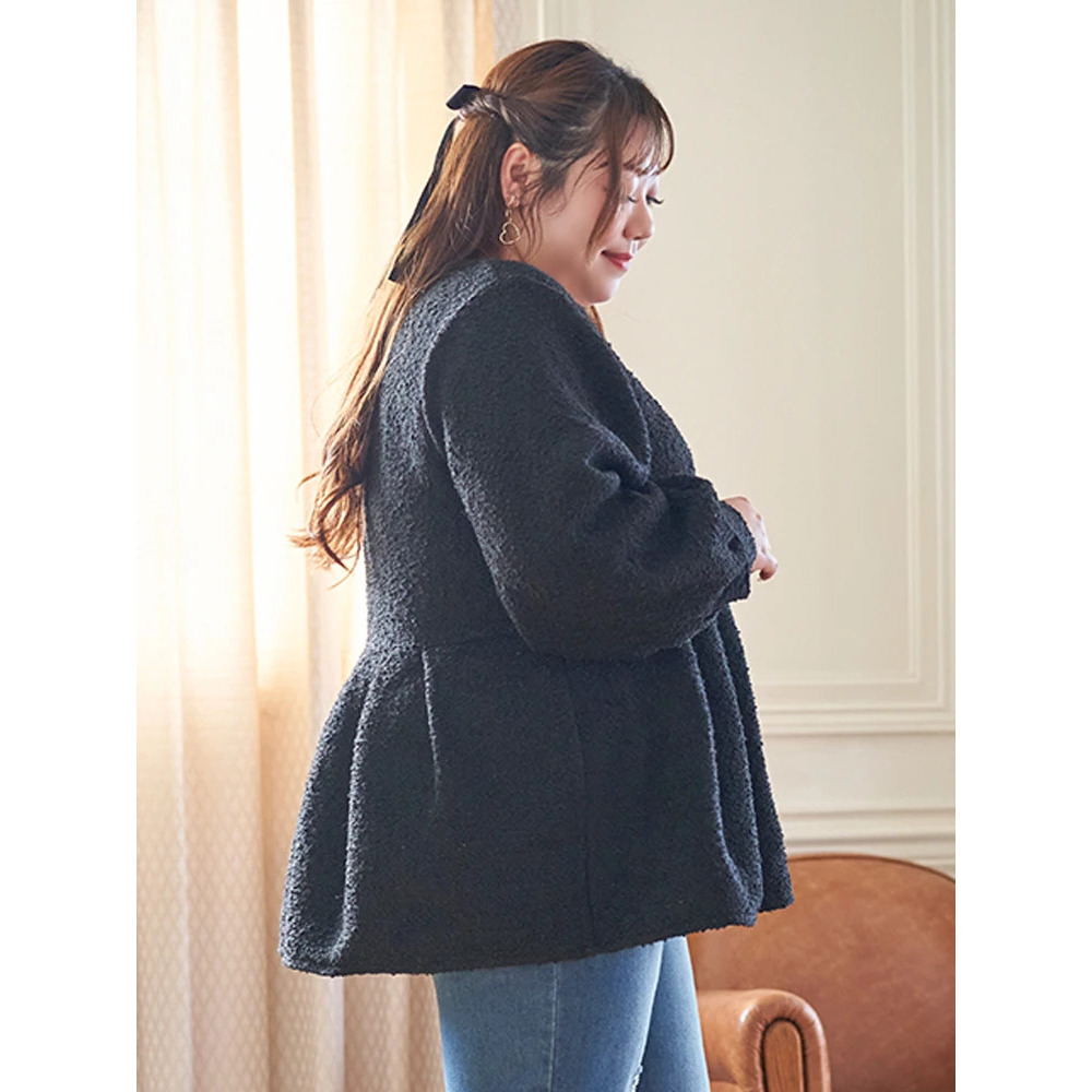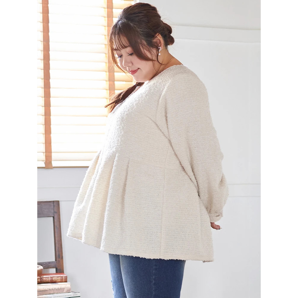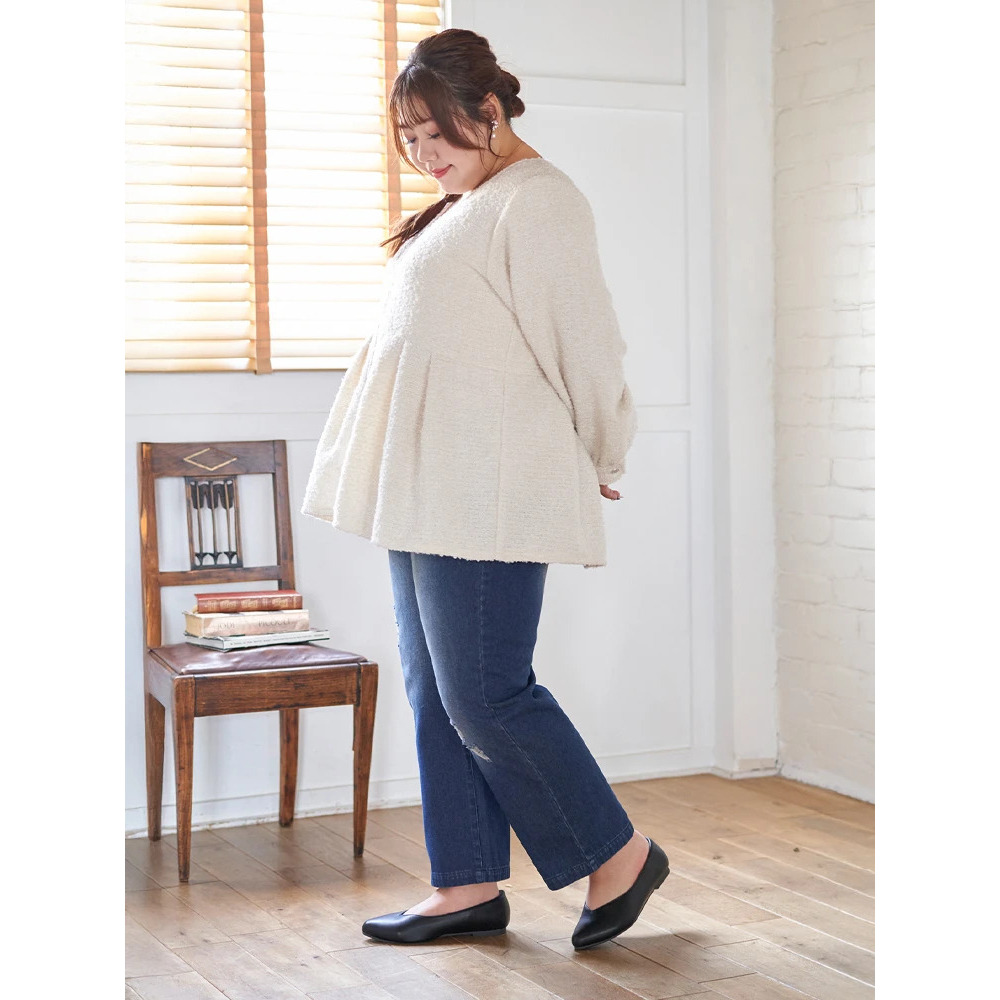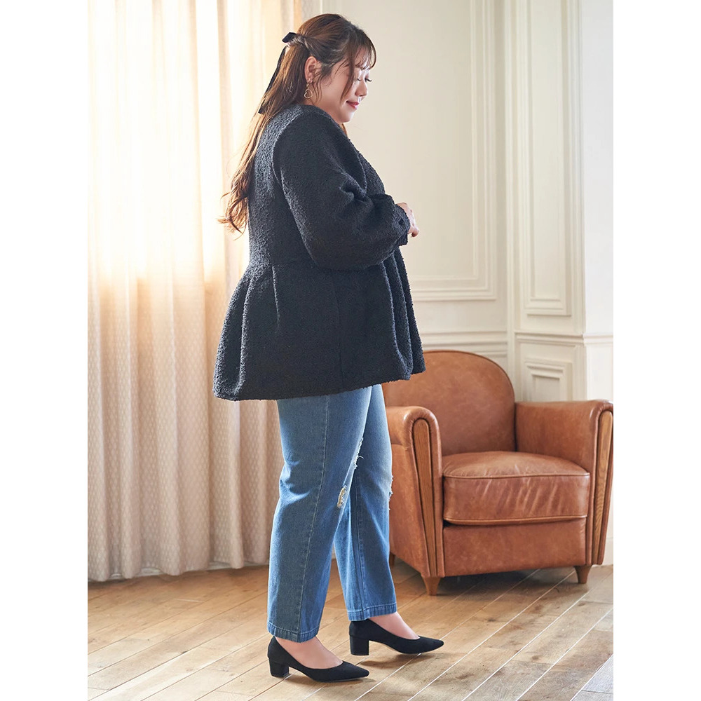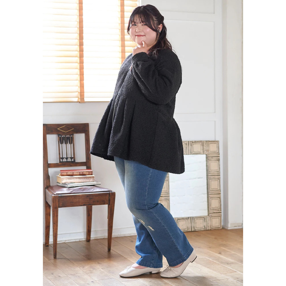 腰回りのハリ感やお腹をカバーするペプラムデザインで、気になる部分を可愛くカモフラ♪通勤着にもピッタリの 度よいキチンと感がうれしい!高見え必至なブークレ地仕立て。