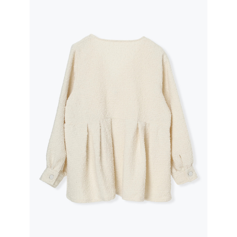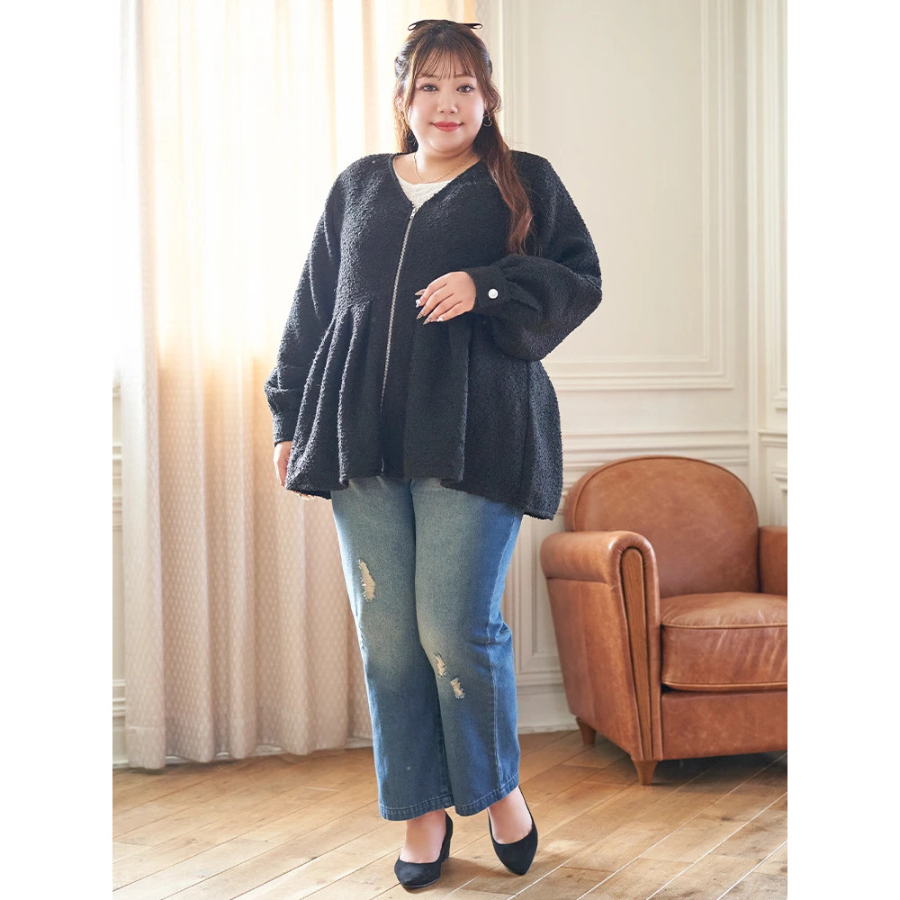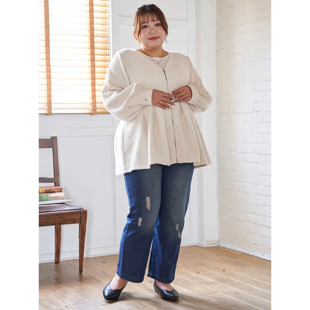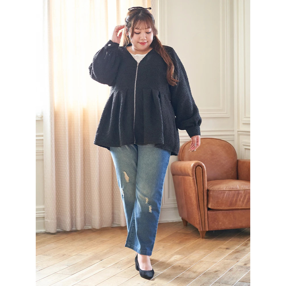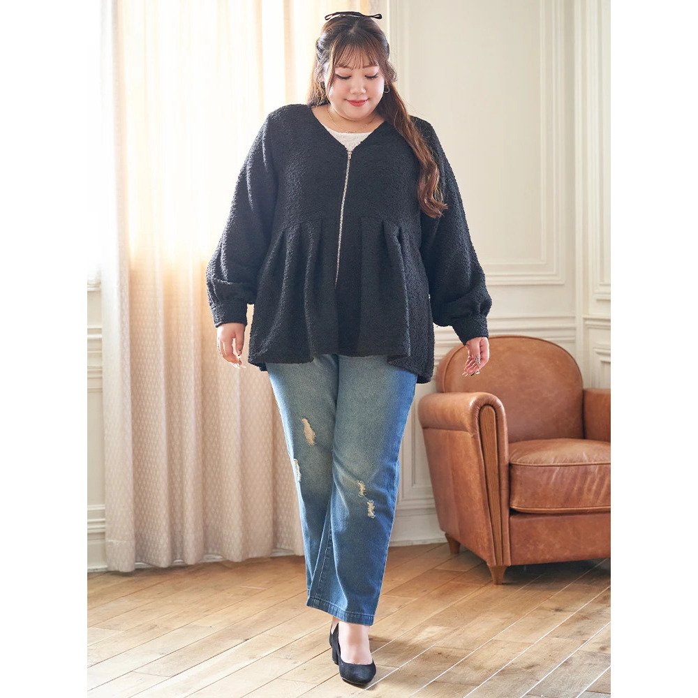 腰回りのハリ感やお腹をカバーするペプラムデザインで、気になる部分を可愛くカモフラ♪通勤着にもピッタリの 度よいキチンと感がうれしい!高見え必至なブークレ地仕立て。
