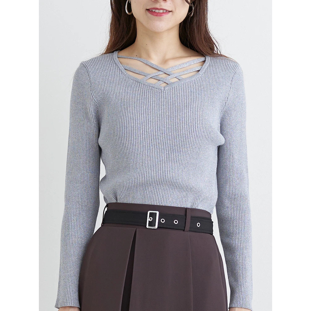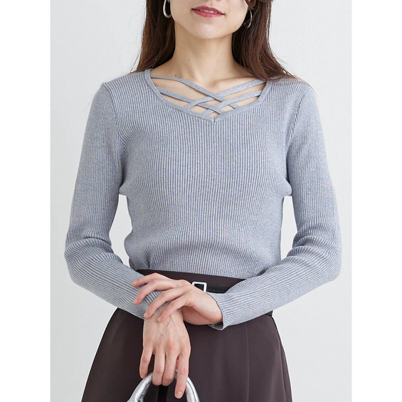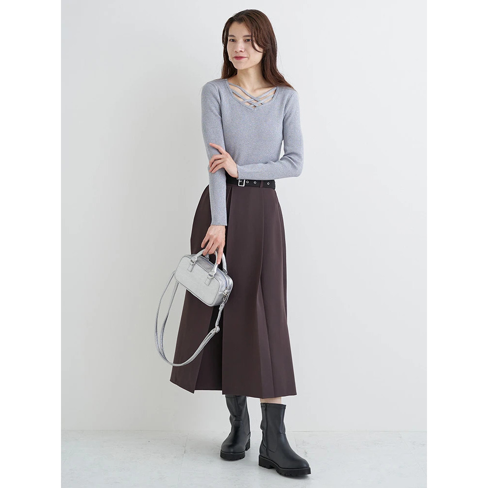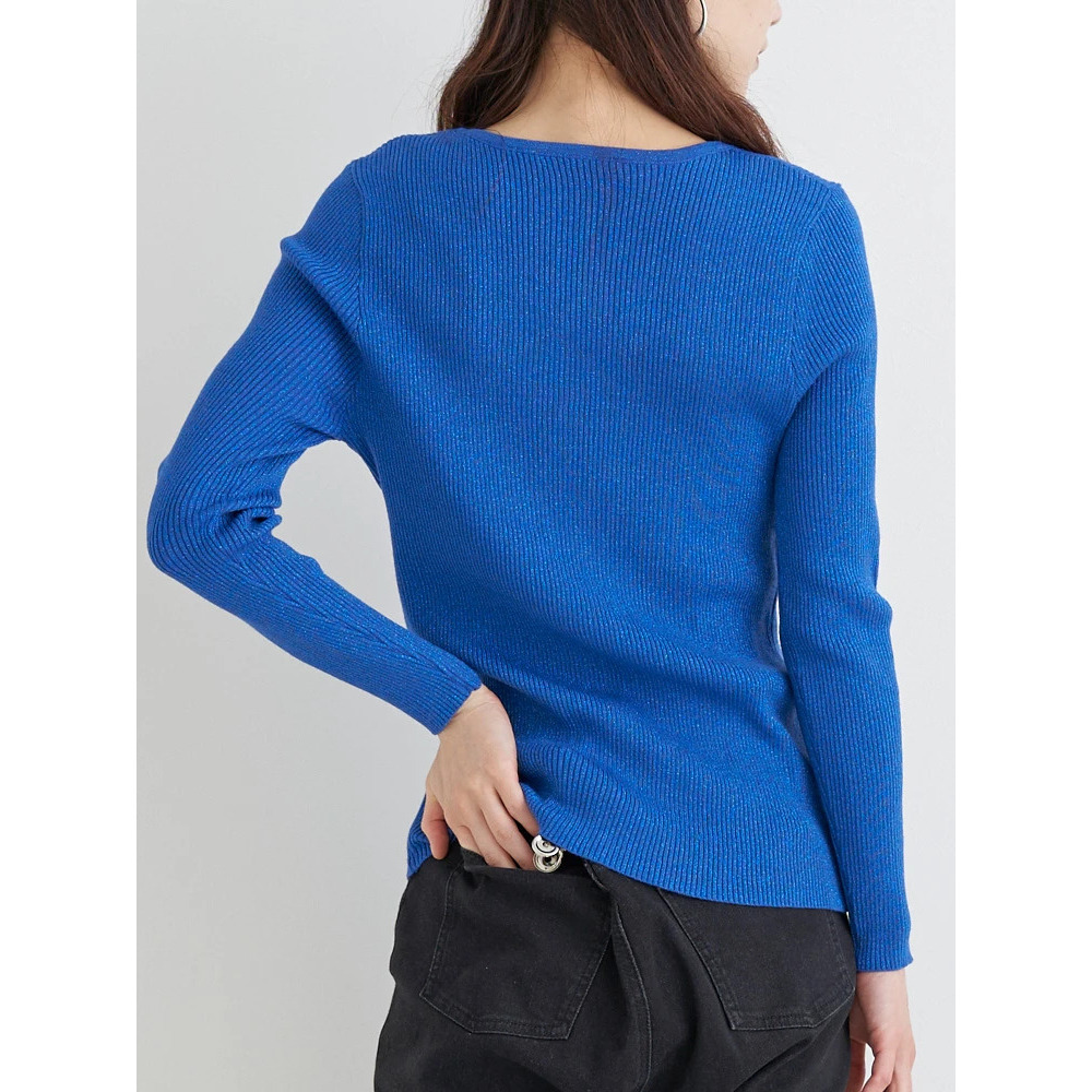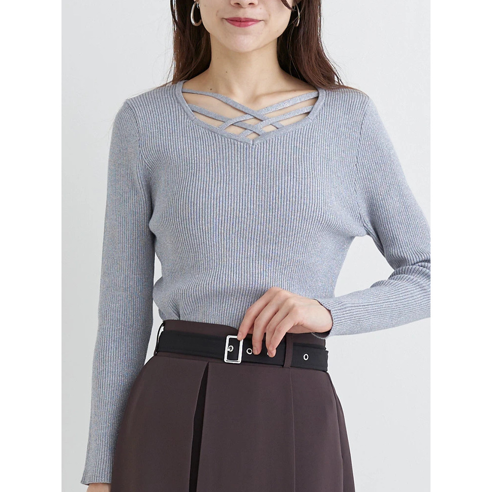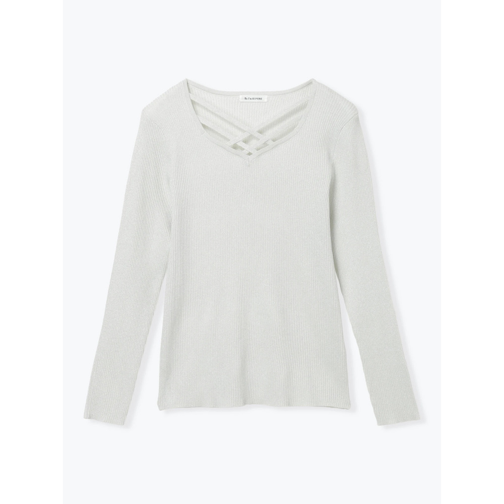 ・ラメ入りのリブニット素材で仕立てられ、上品な煌めきがフェミニン度を高めてくれる。