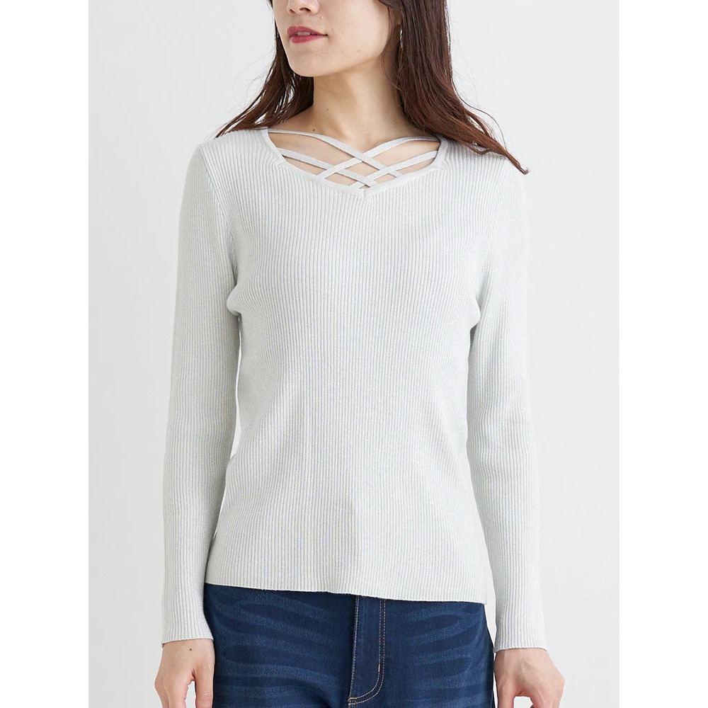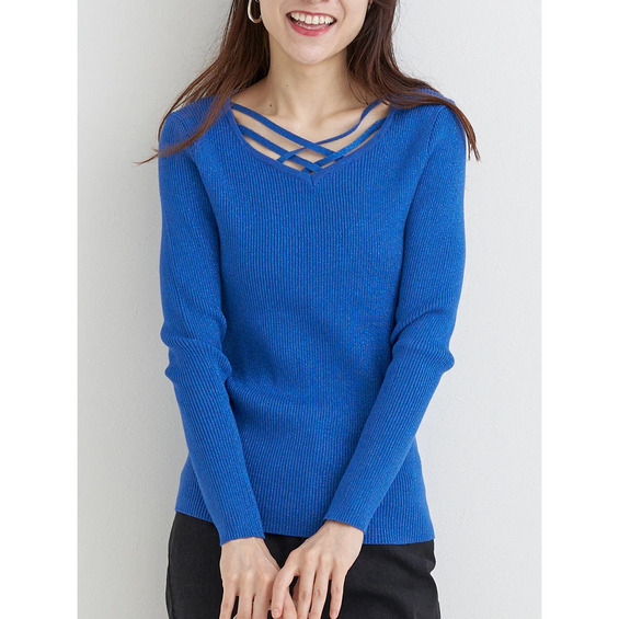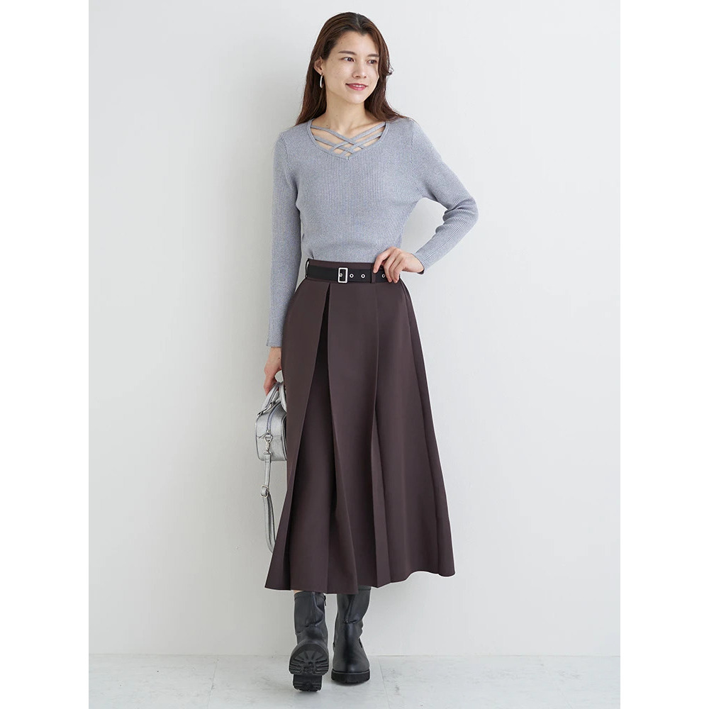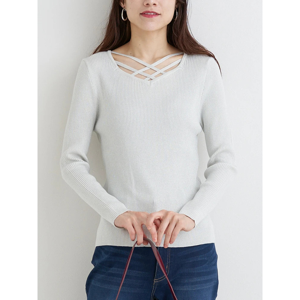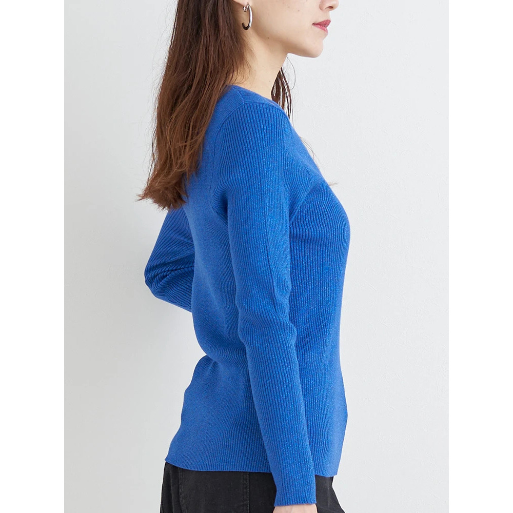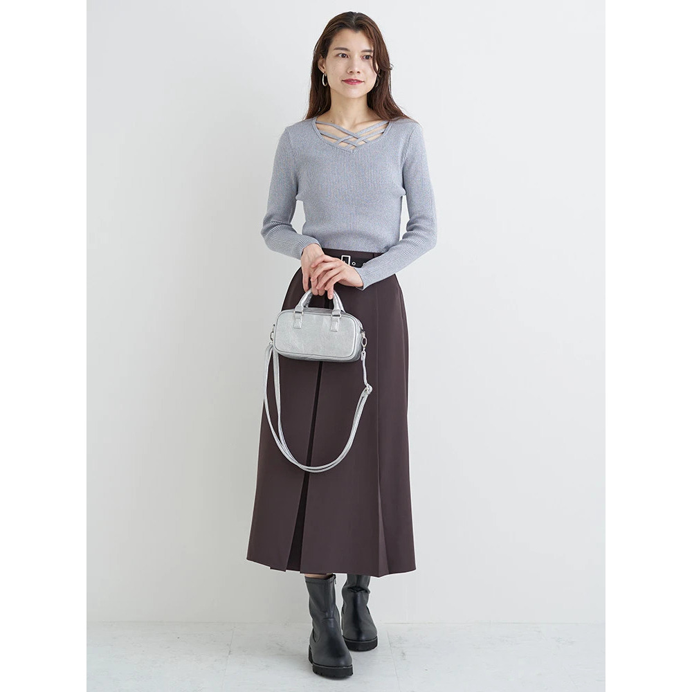 ・ラメ入りのリブニット素材で仕立てられ、上品な煌めきがフェミニン度を高めてくれる。