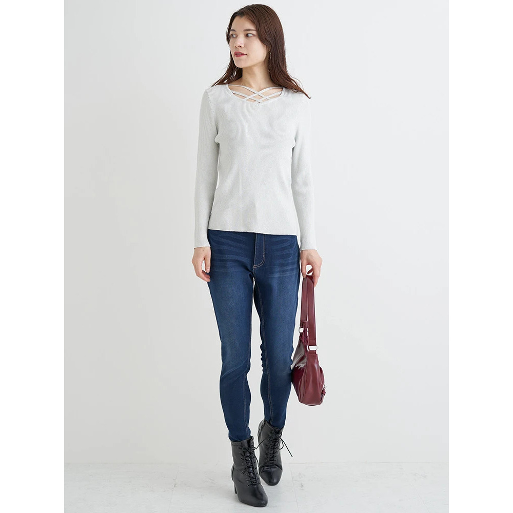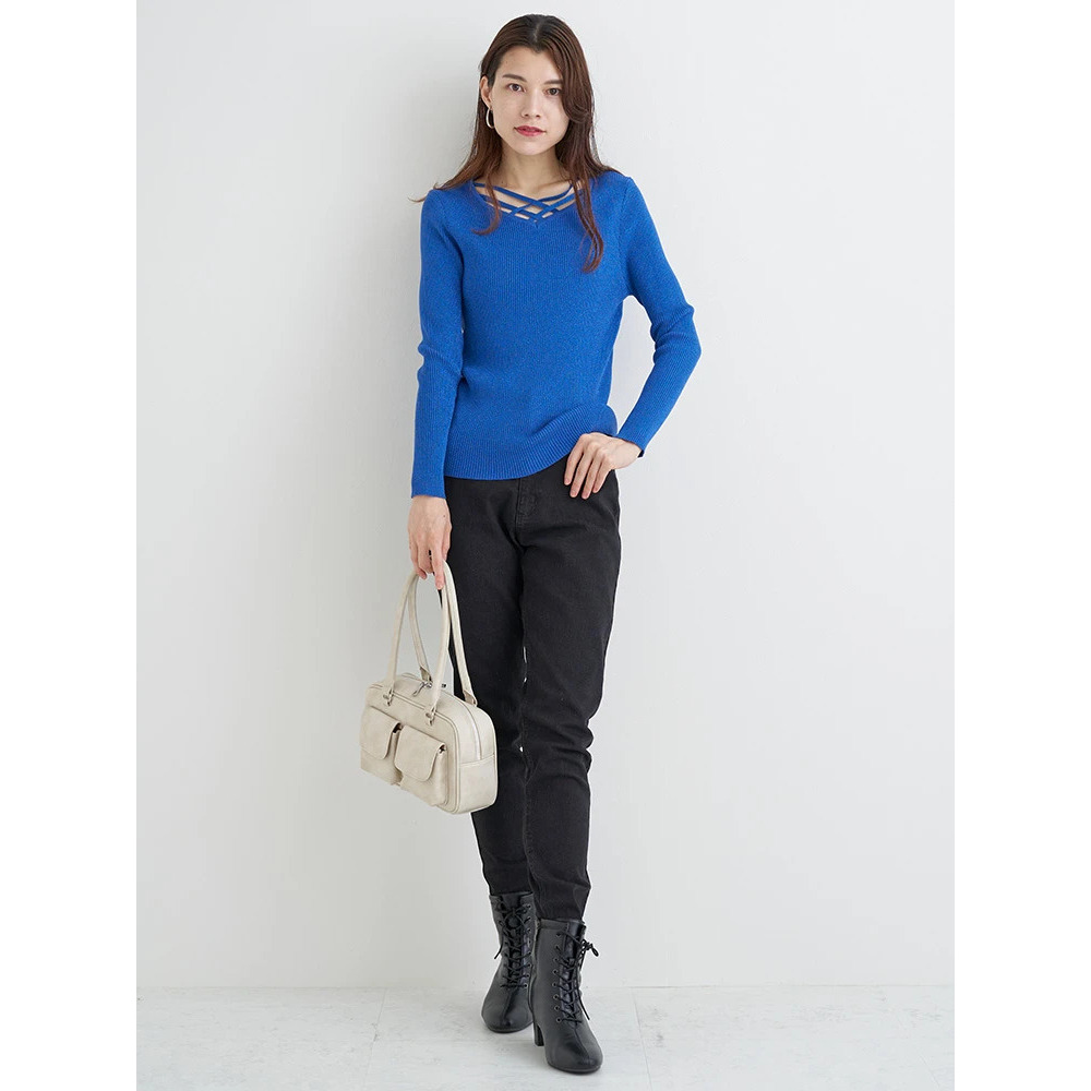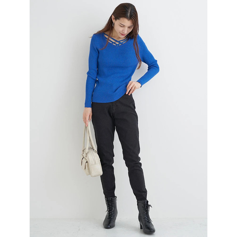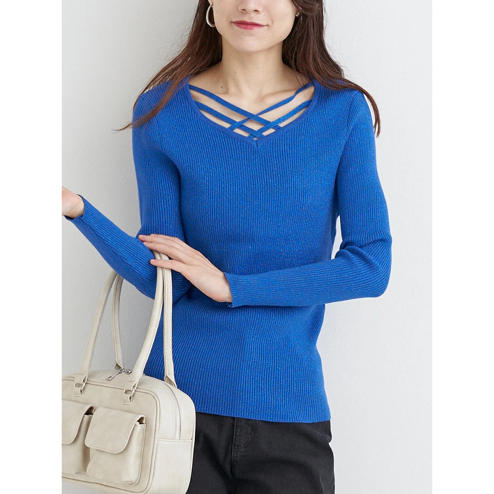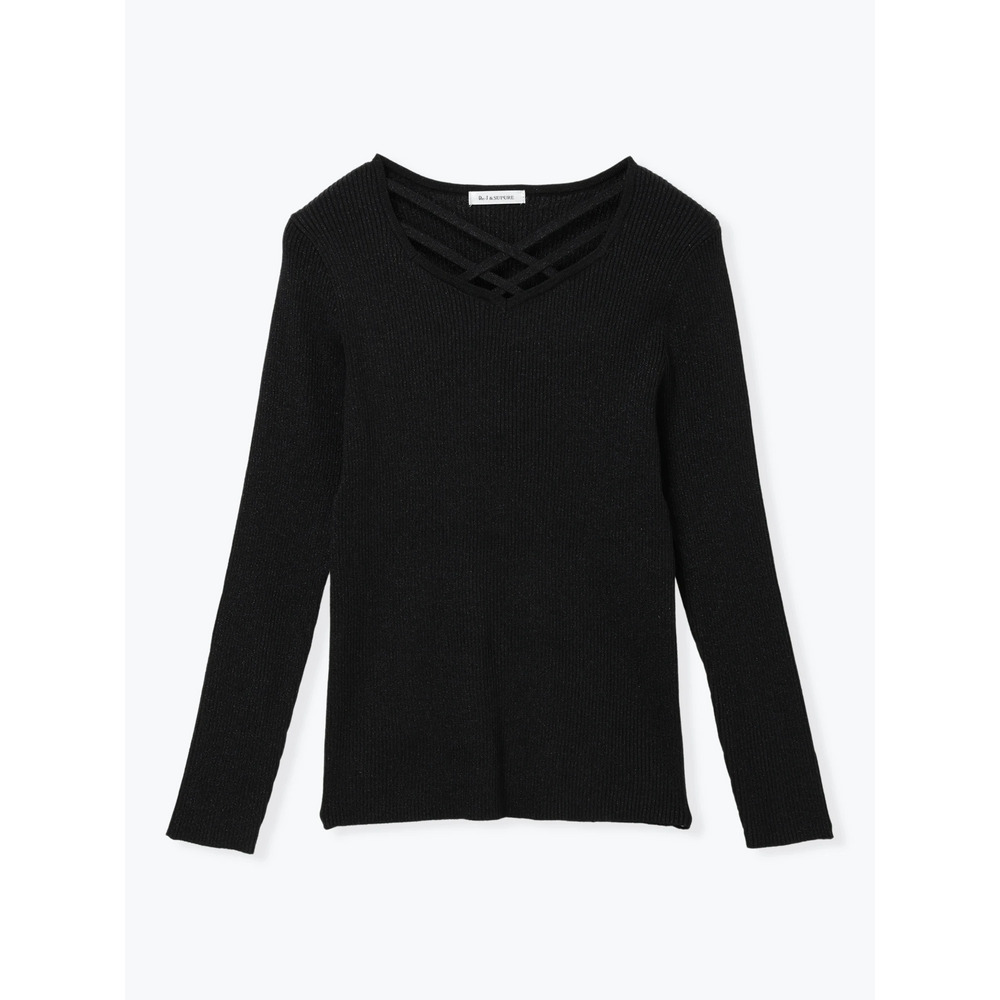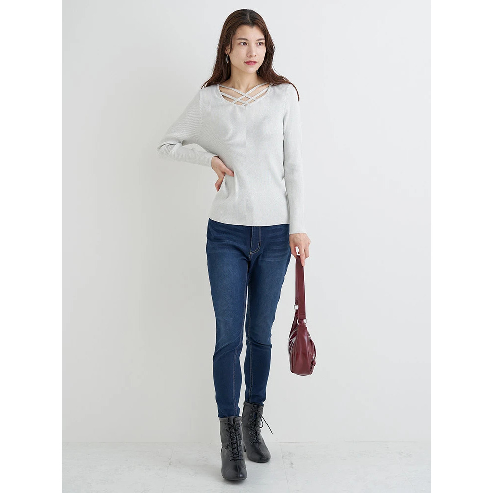 ・ラメ入りのリブニット素材で仕立てられ、上品な煌めきがフェミニン度を高めてくれる。