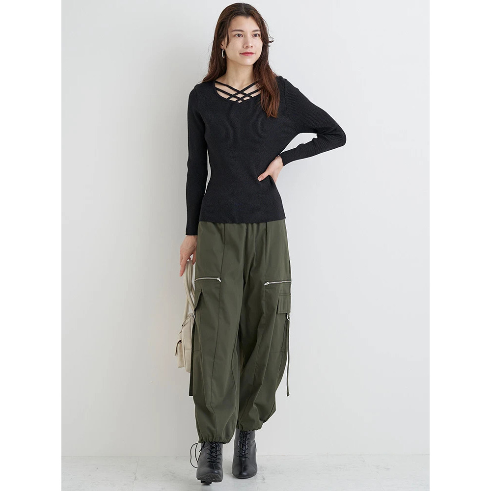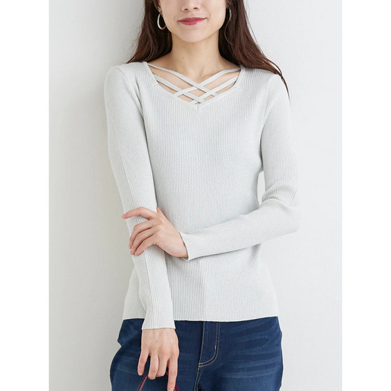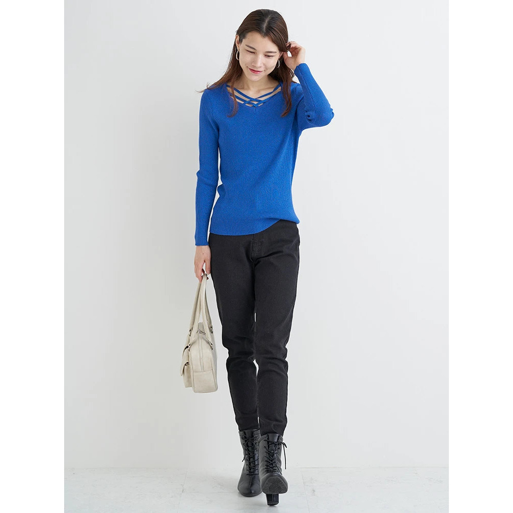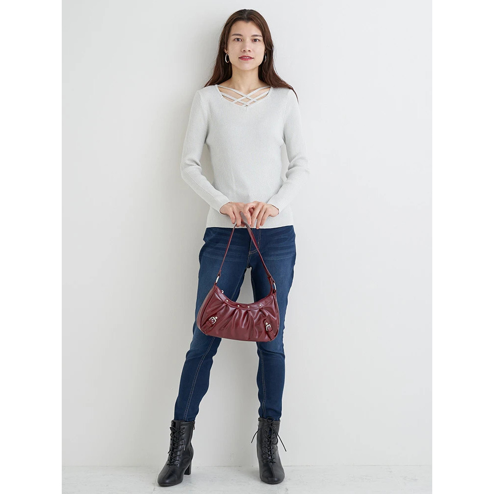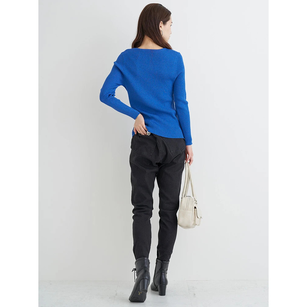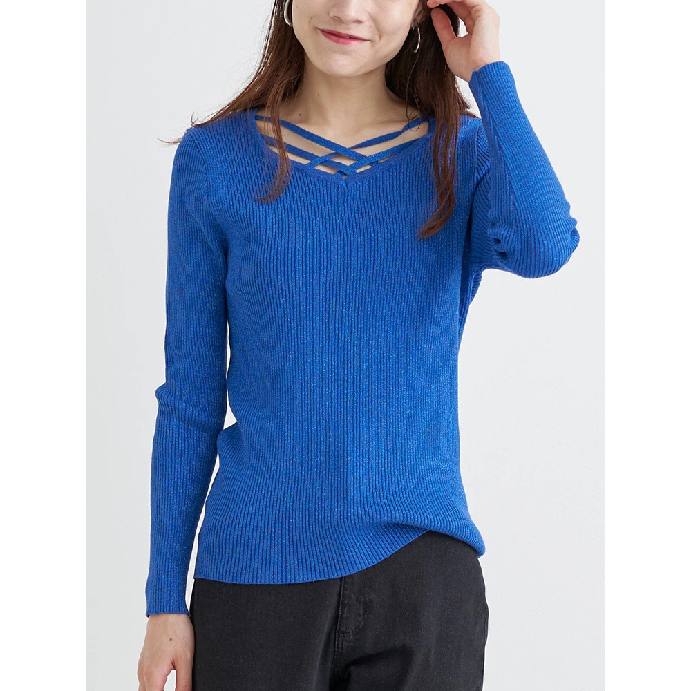 ・ラメ入りのリブニット素材で仕立てられ、上品な煌めきがフェミニン度を高めてくれる。