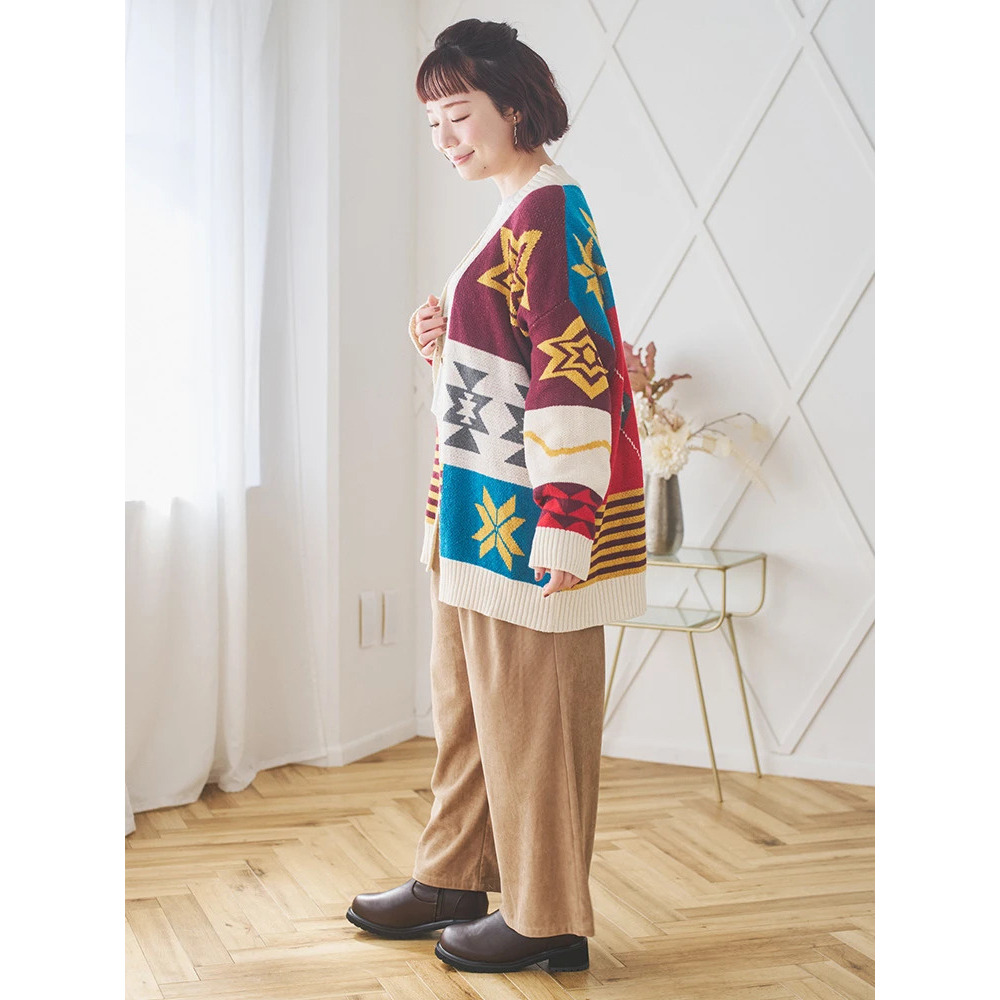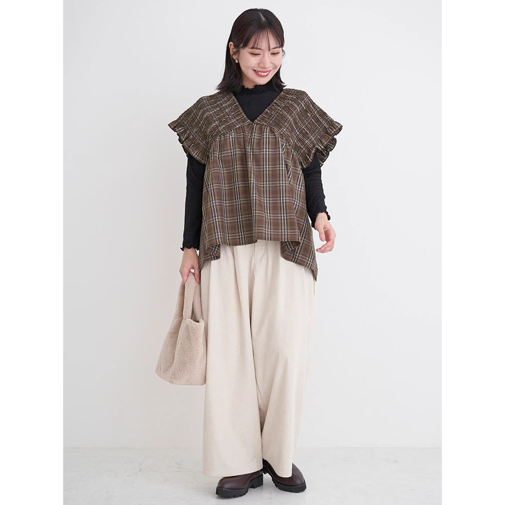 フリルブラウス×カーディガン×バレエシューズで軽やかに。コーデュロイの温もりと甘めのトップスがバランスよく調和します◎