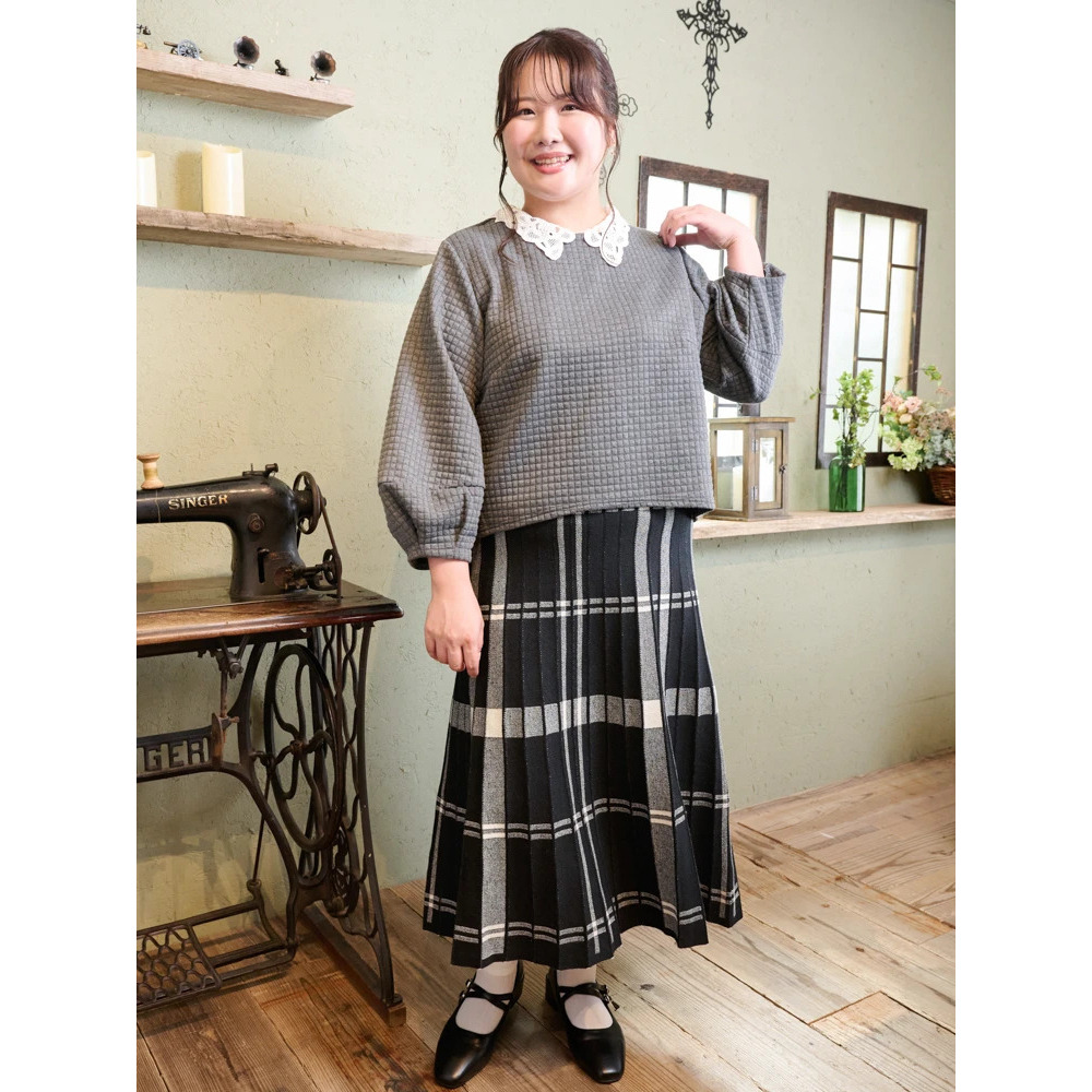 レース襟付きで、チェック柄のタイトスカートを合わせてトラッドな着こなしに♪