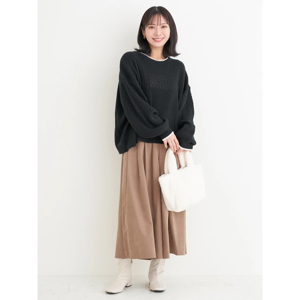 ・トップスはケーブルなどの柄がパッチワーク風に切り替えられた編地がコーディネートのアクセントに!