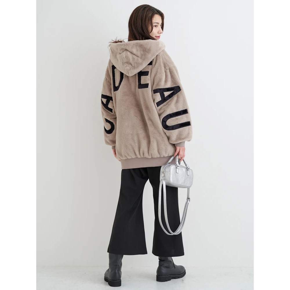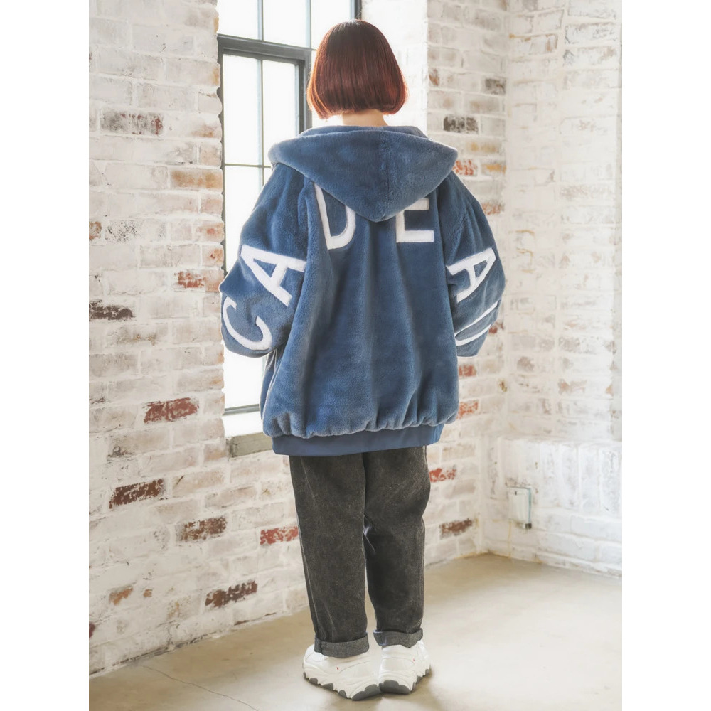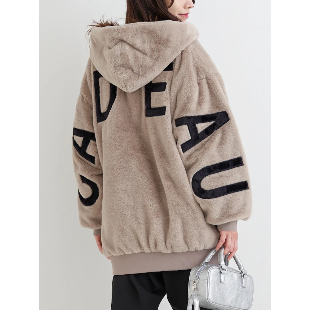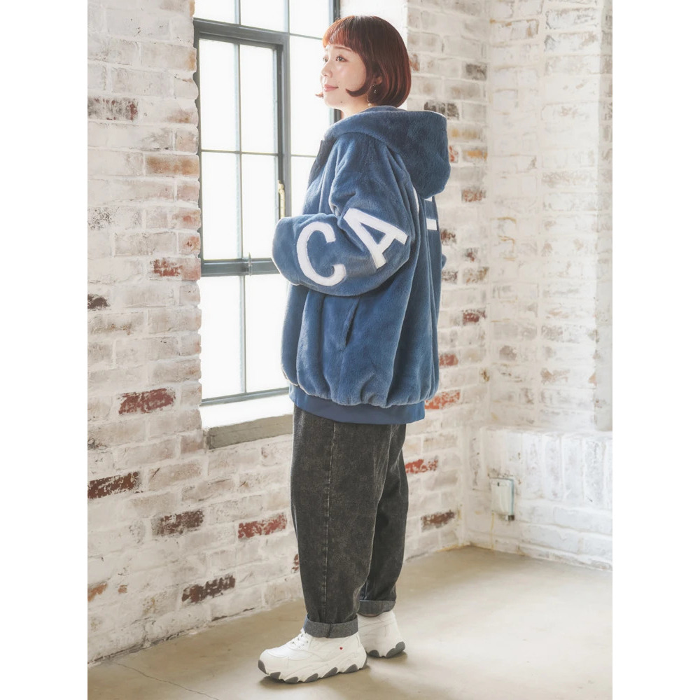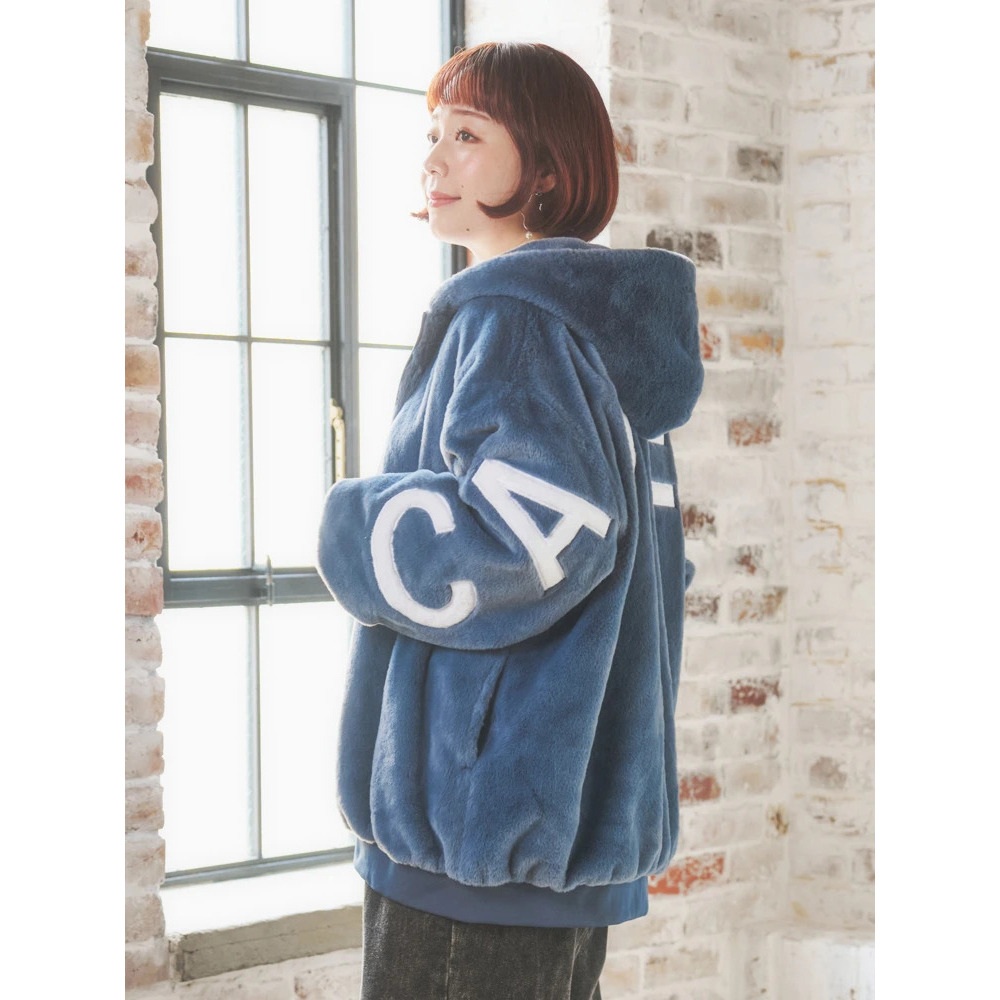 ストリートムードを醸す、バックロゴ入りのフェイクファーブルゾン。