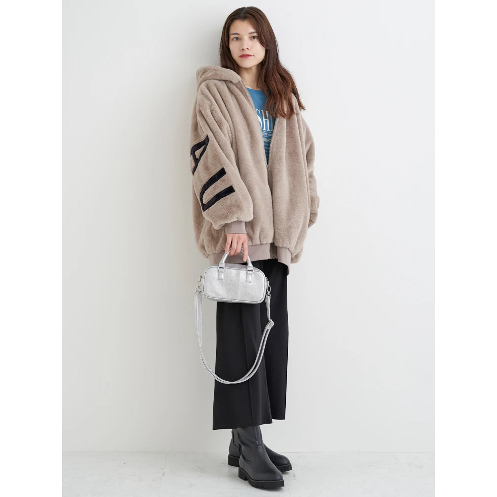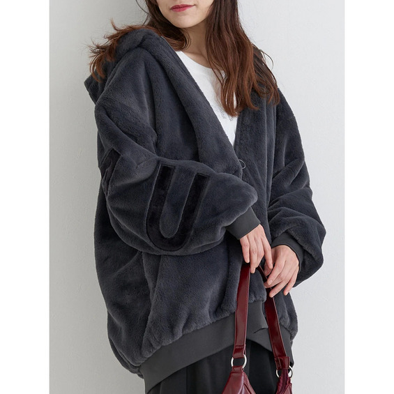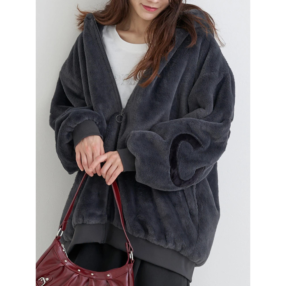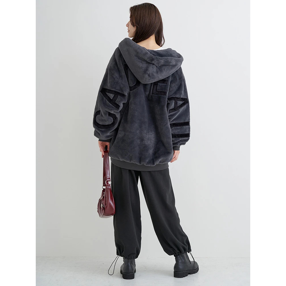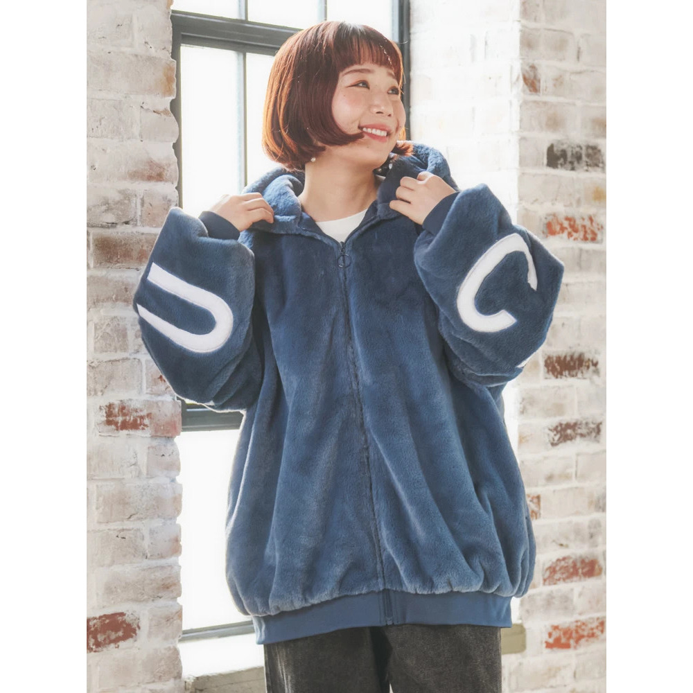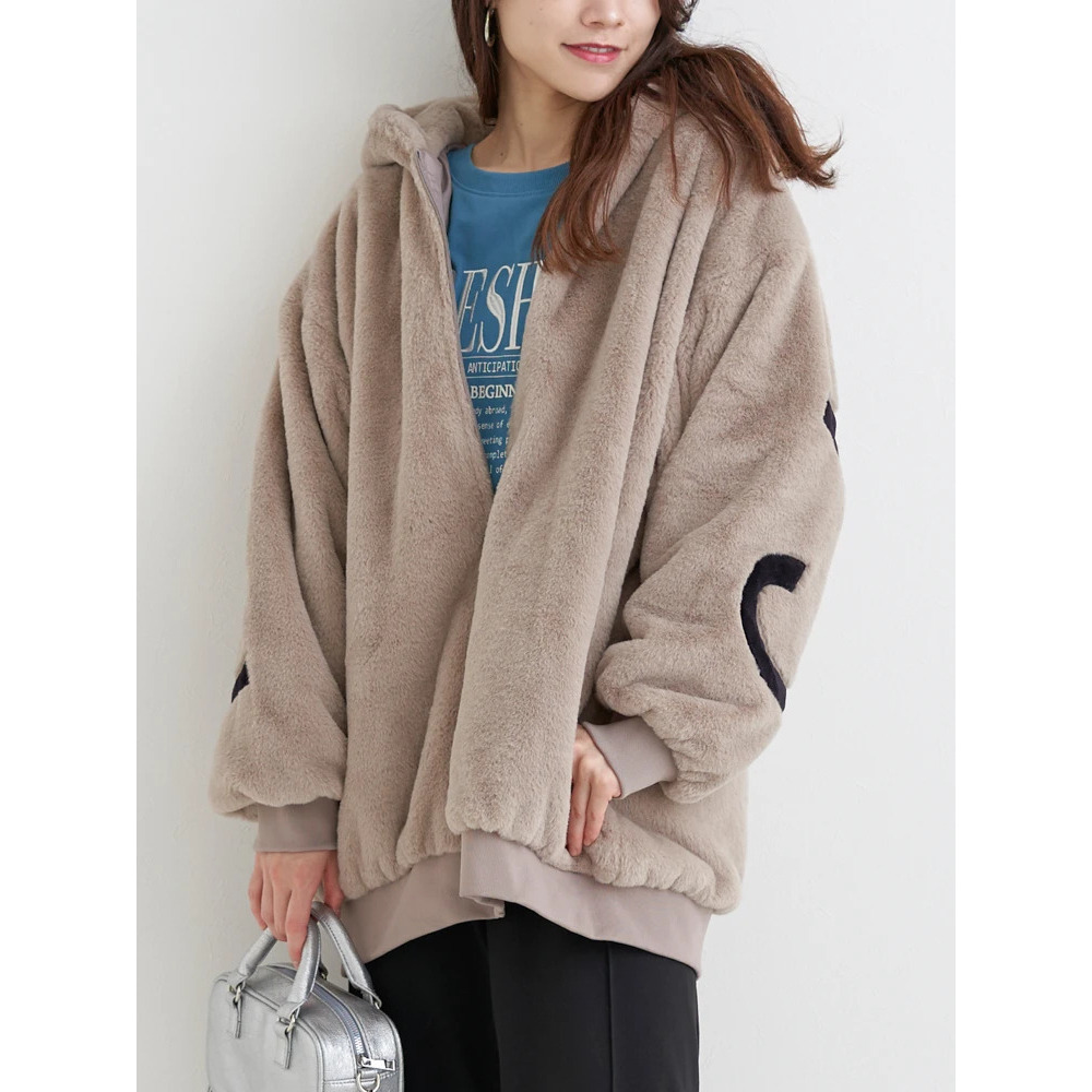 ストリートムードを醸す、バックロゴ入りのフェイクファーブルゾン。