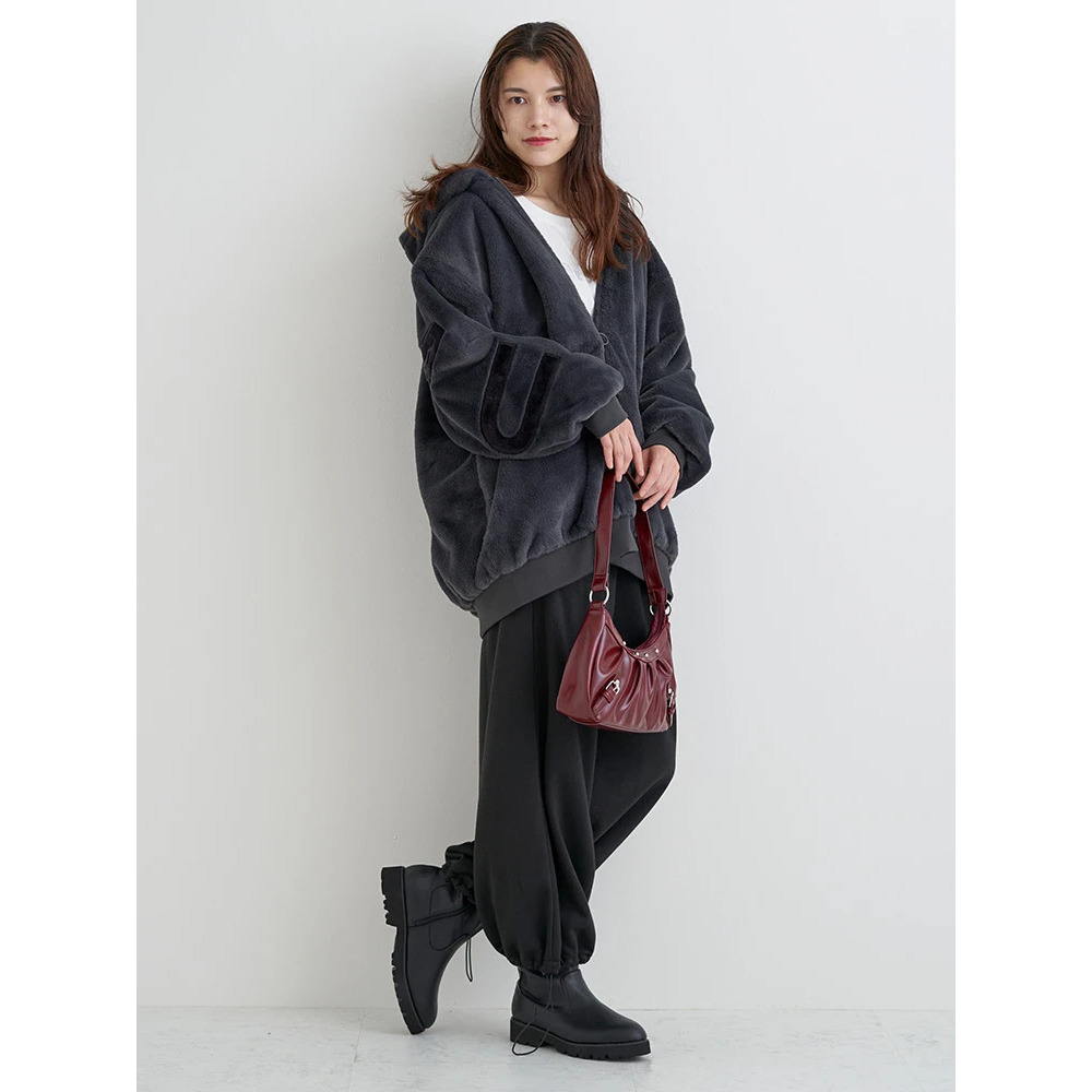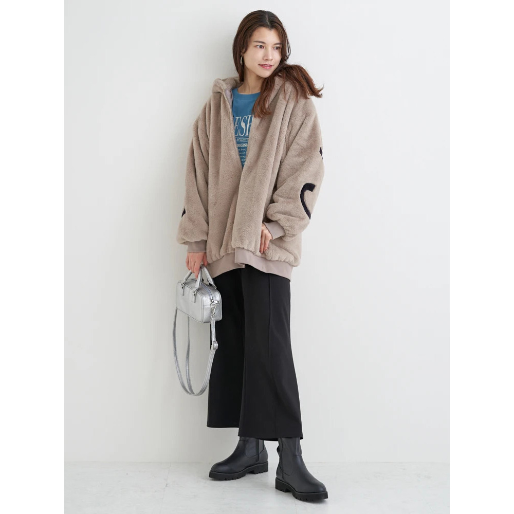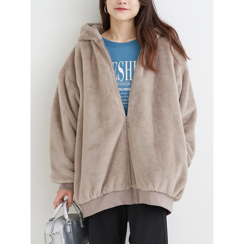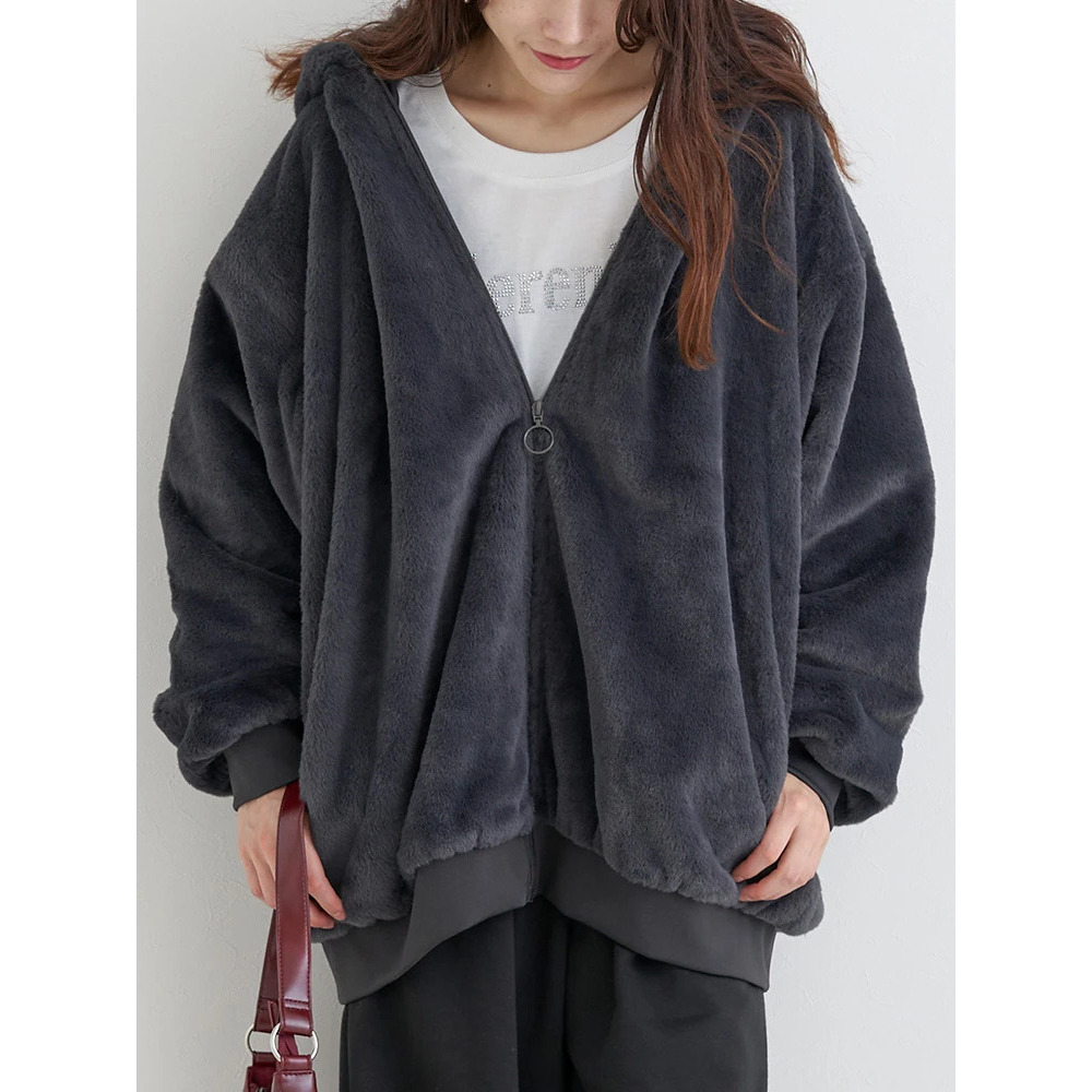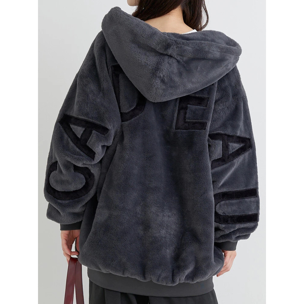 ストリートムードを醸す、バックロゴ入りのフェイクファーブルゾン。
