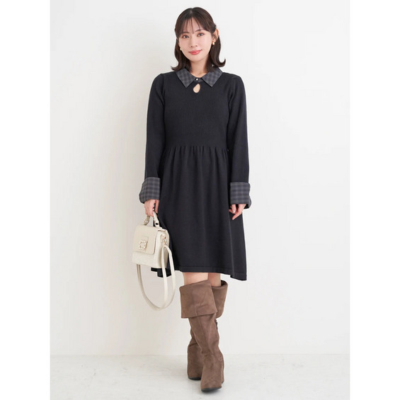 チェックシャツをINしているようなデザインがガーリーなニットワンピース。