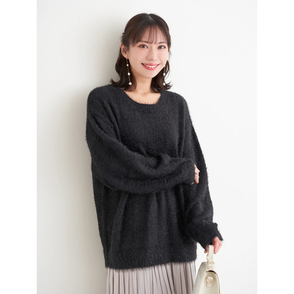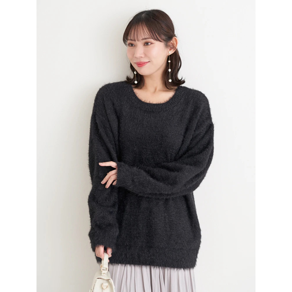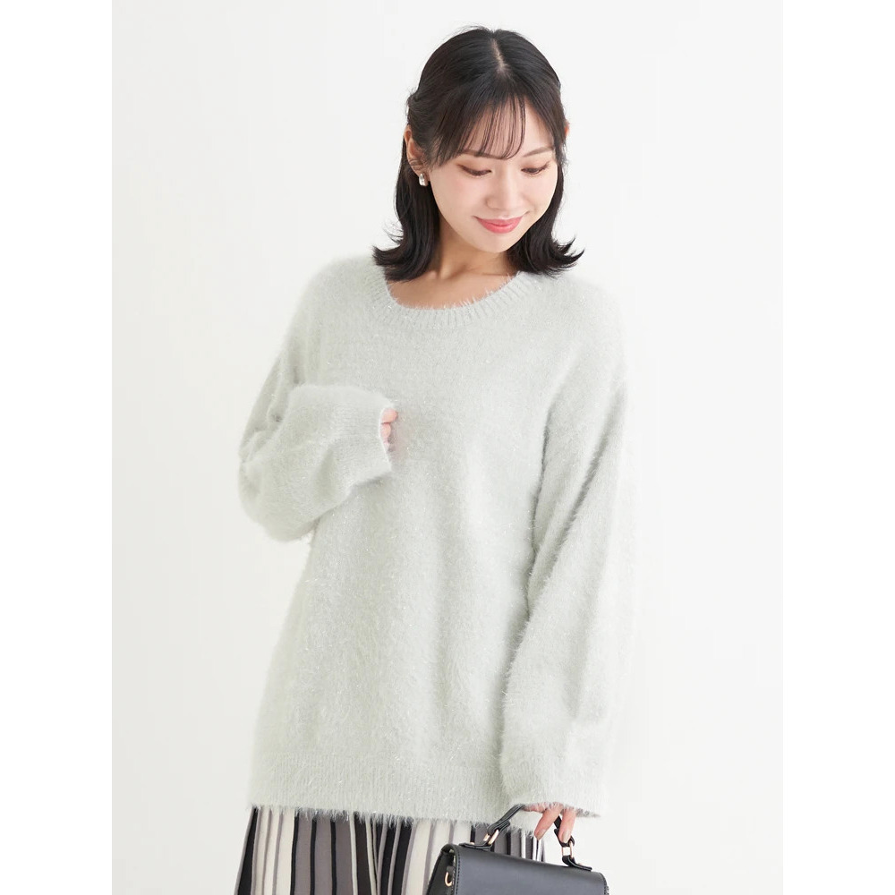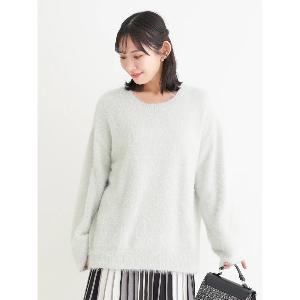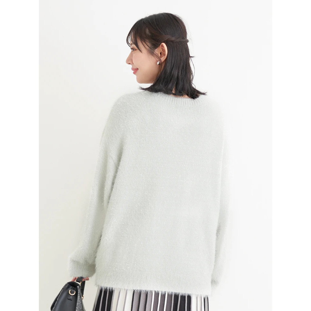 キラキラと輝くラメ糸入りのフェザーニット素材。