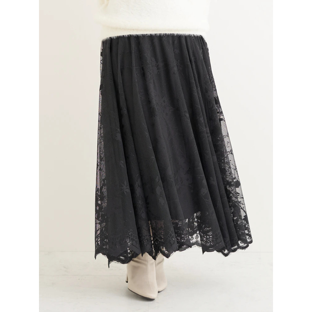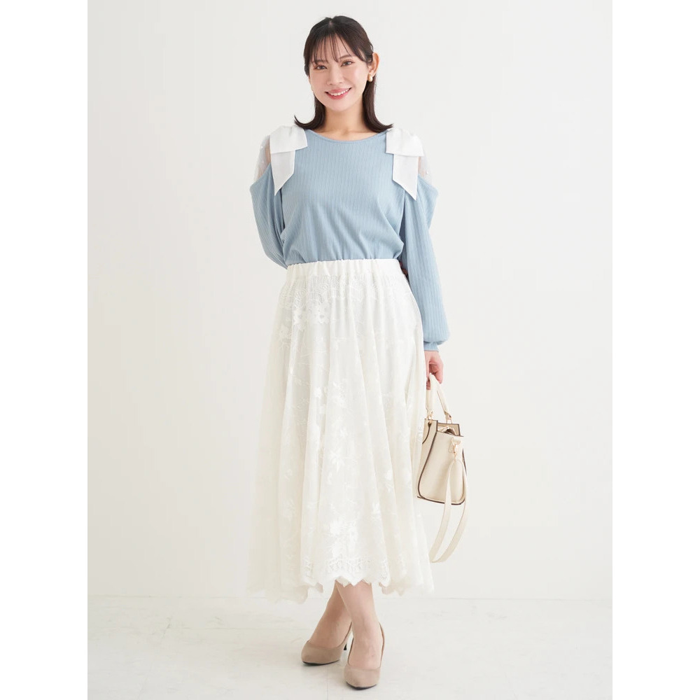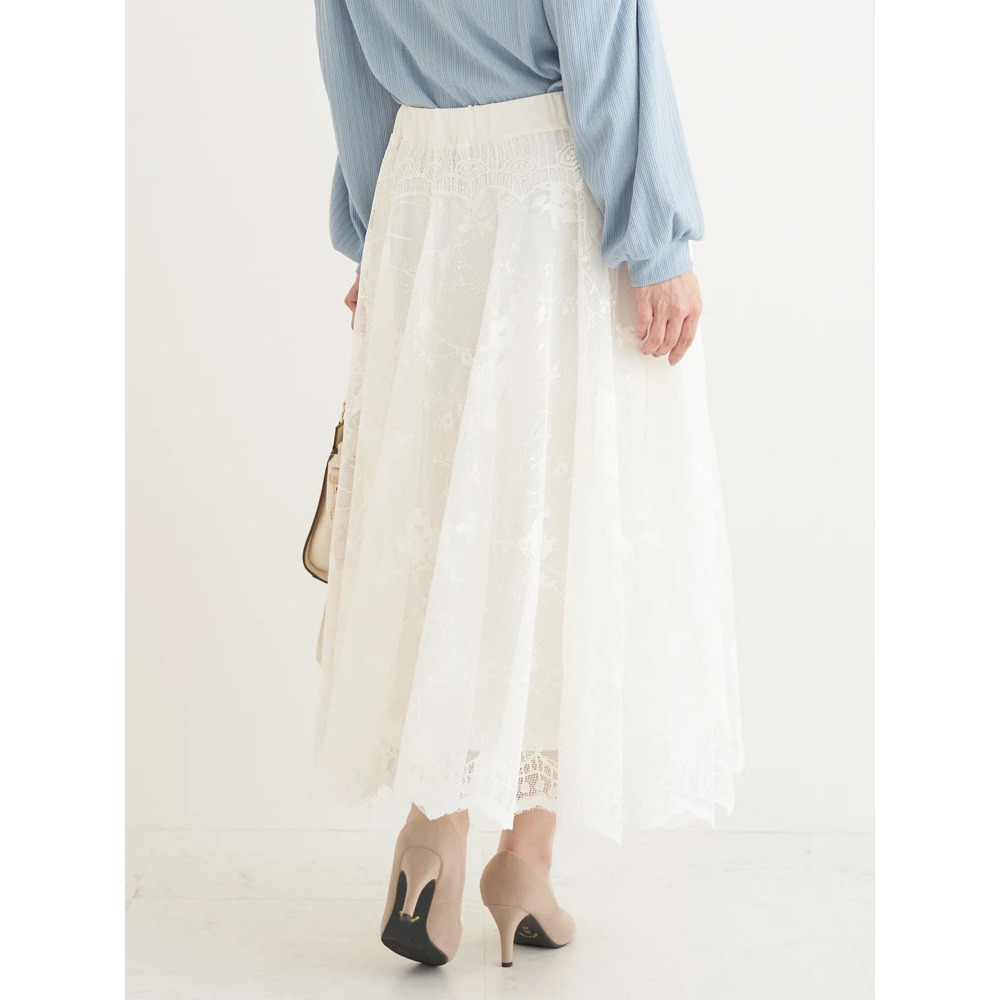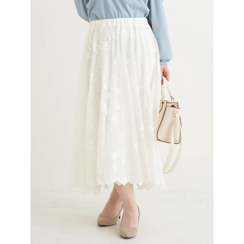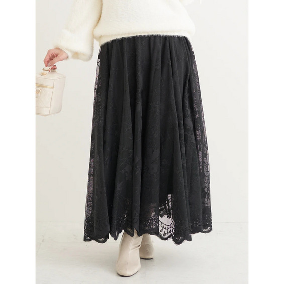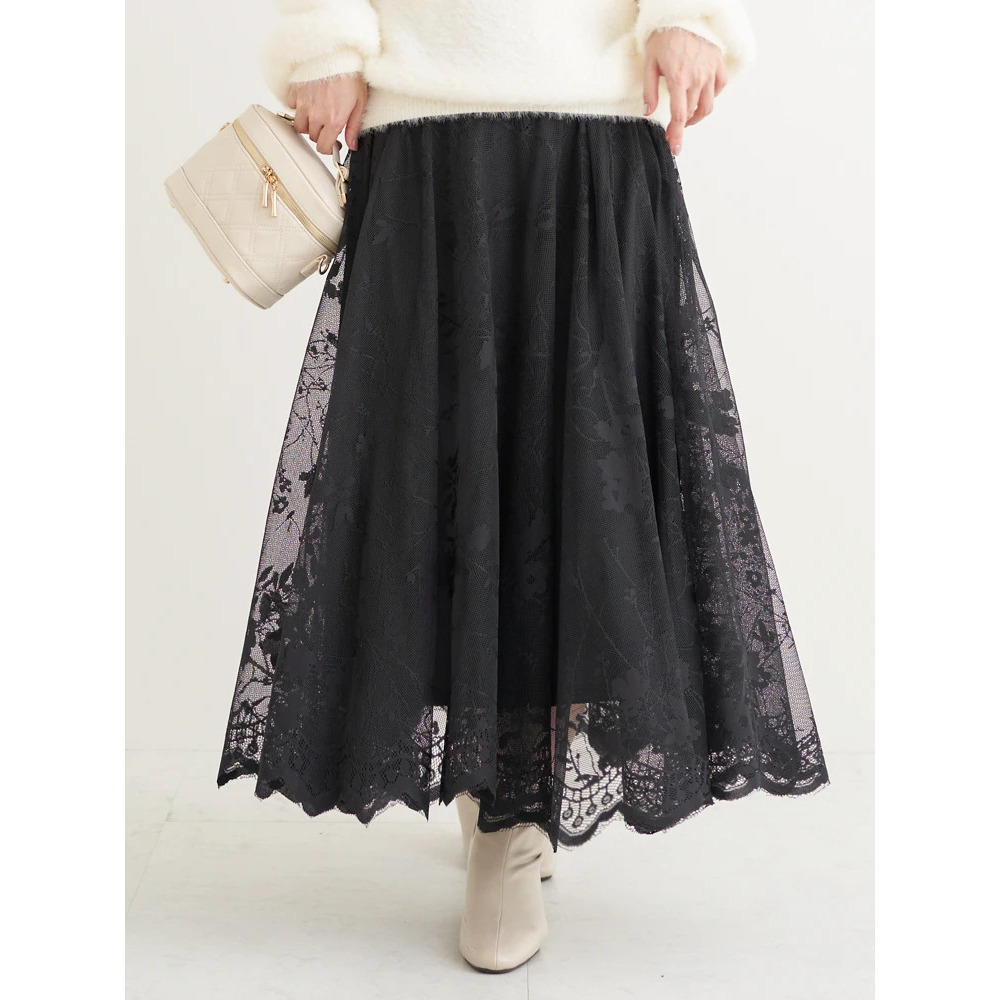 シンプルなトップス合わせでも華やかに決まるフェミニンムードたっぷりなスカートです。