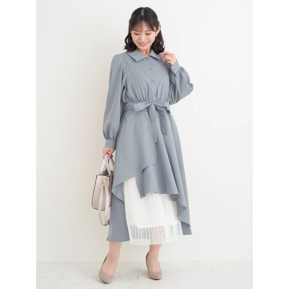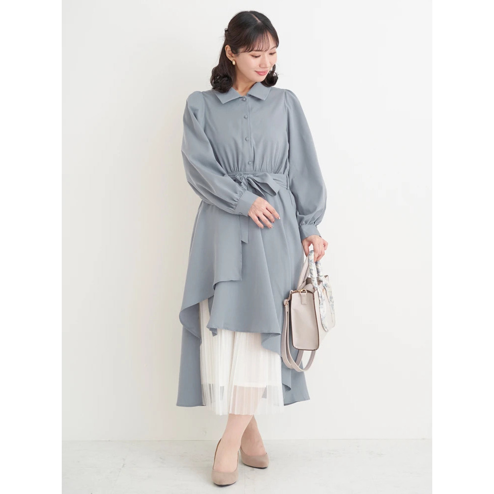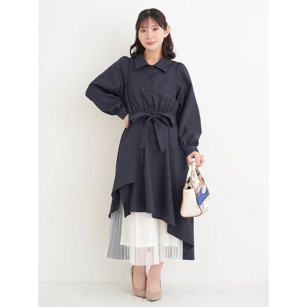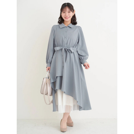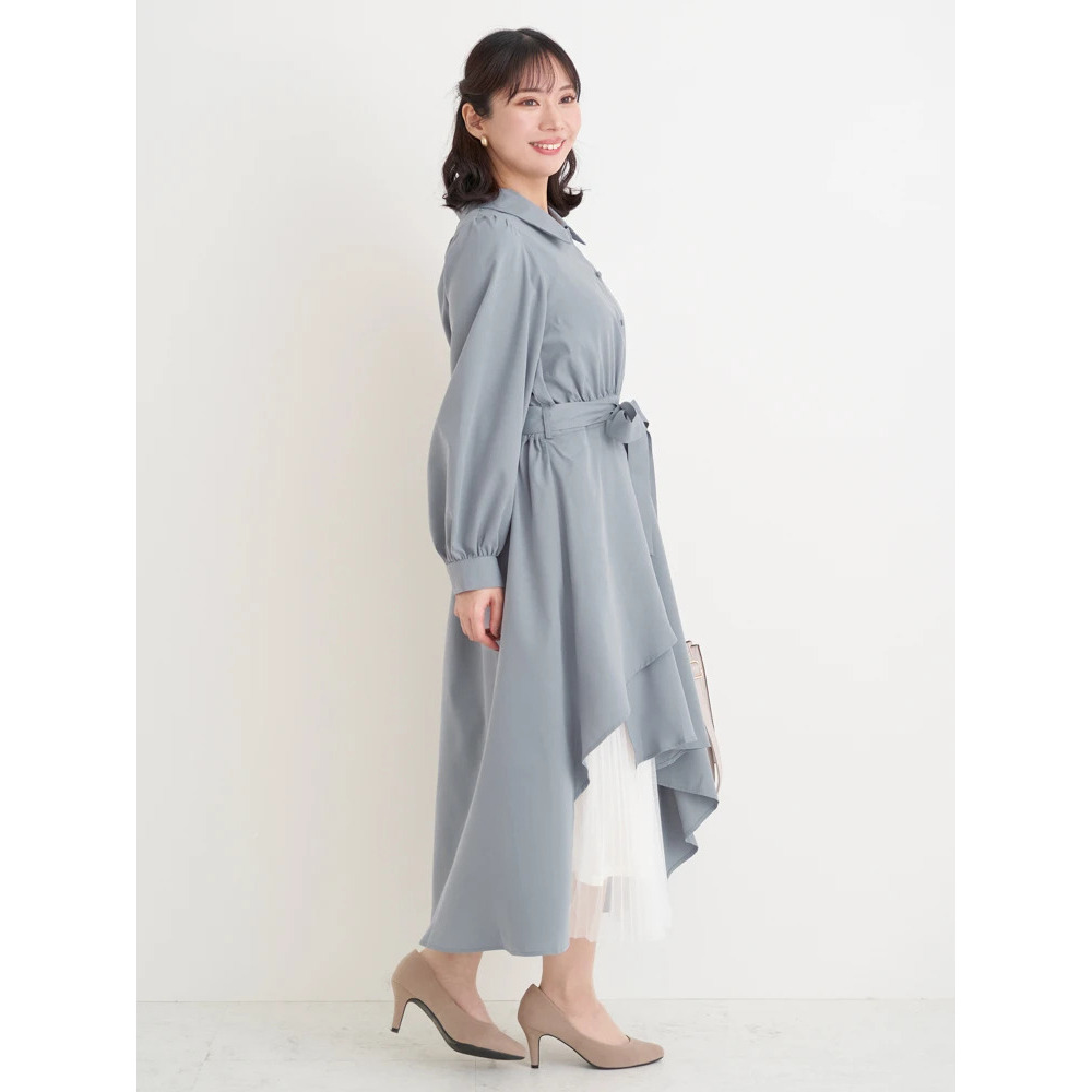 裾チュールアシメ切り替えシャツワンピース