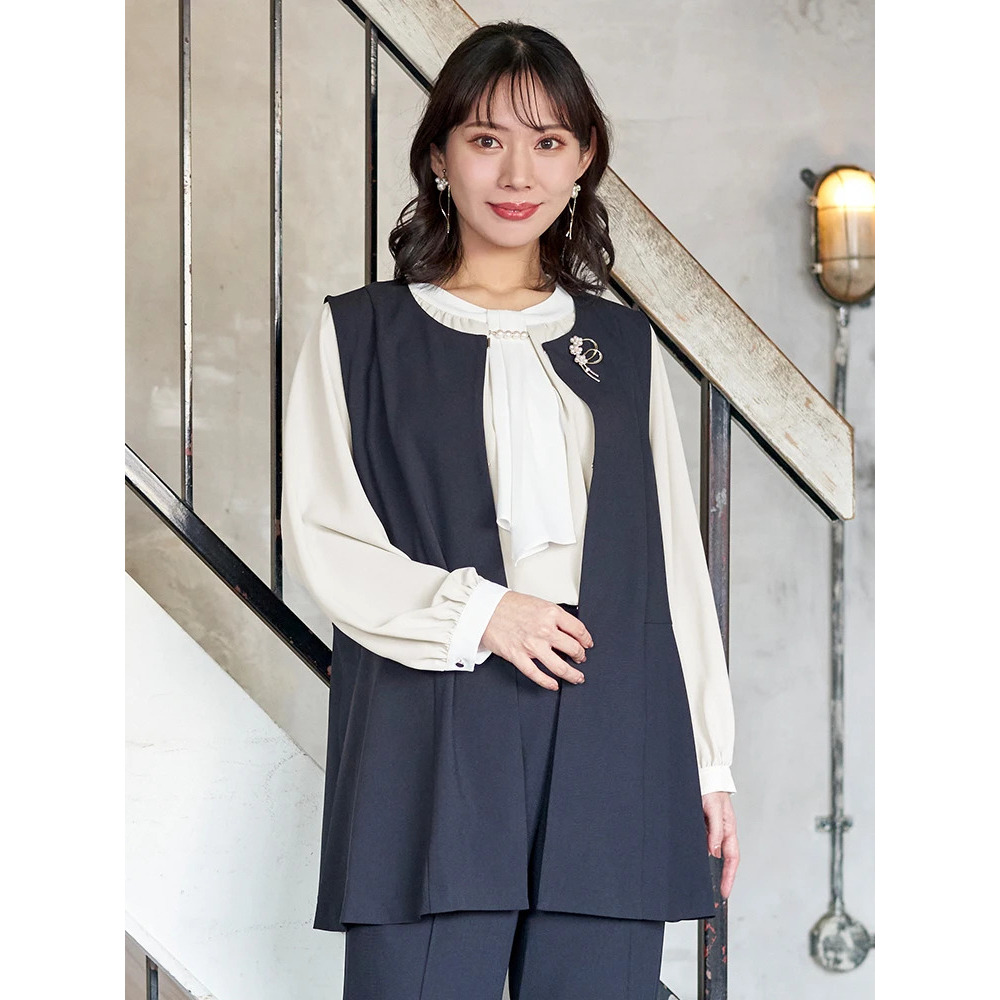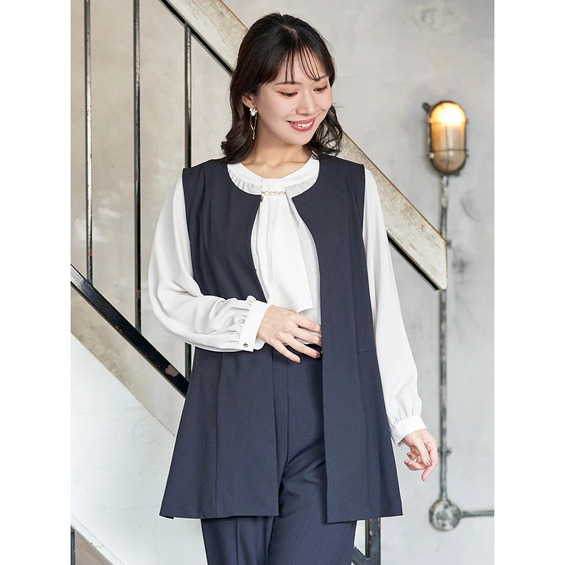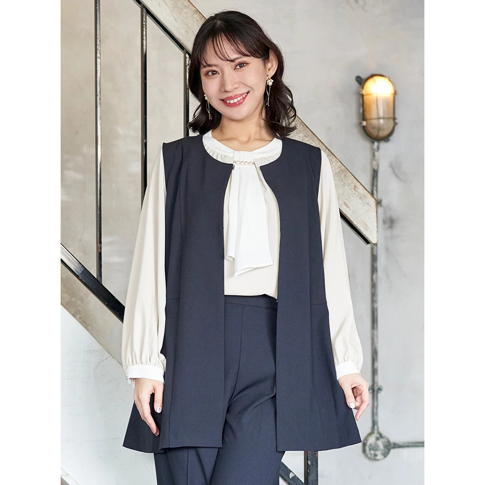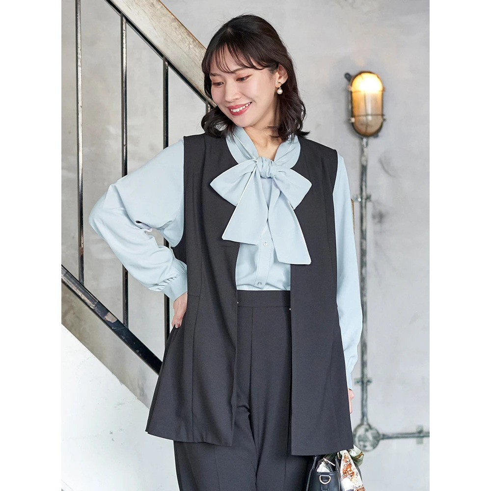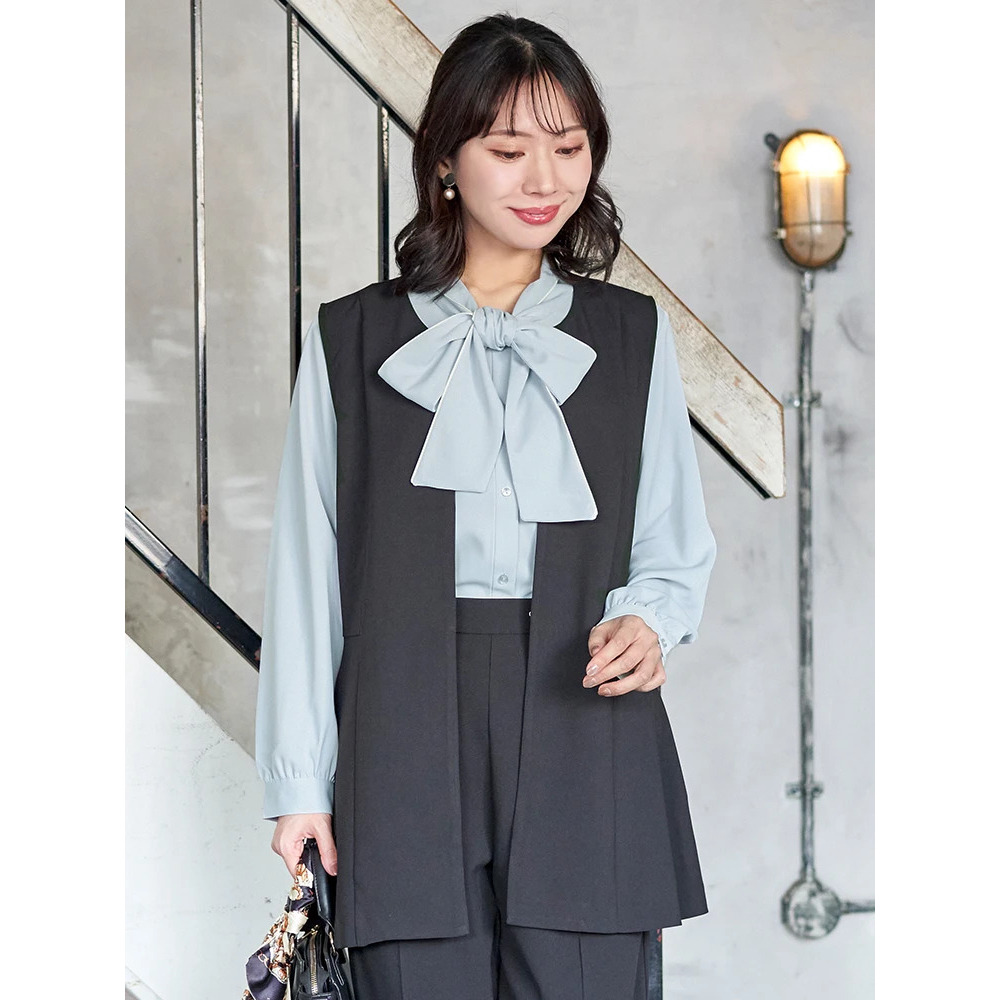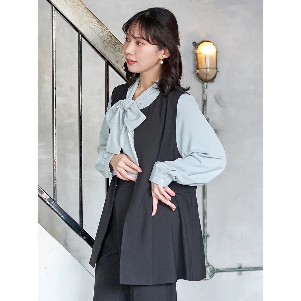 リボン結びをしたボウタイブラウスの上に重ねるとレディなムードがプラスされこなれた印象に仕上がるのでおすすめです。