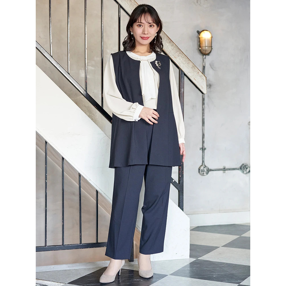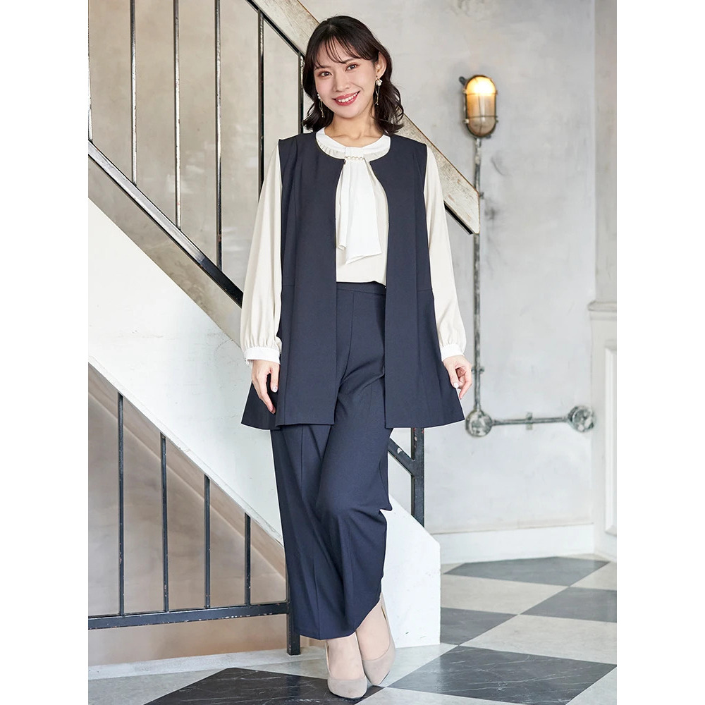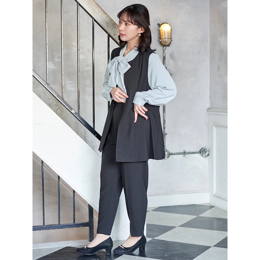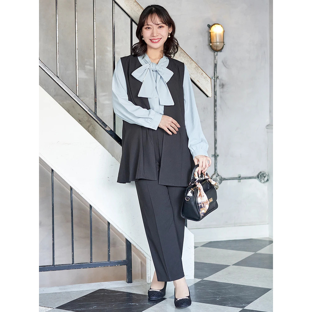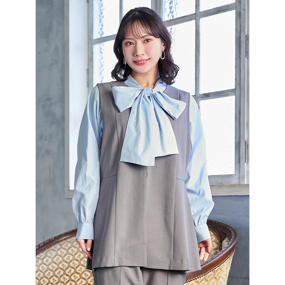 リボン結びをしたボウタイブラウスの上に重ねるとレディなムードがプラスされこなれた印象に仕上がるのでおすすめです。
