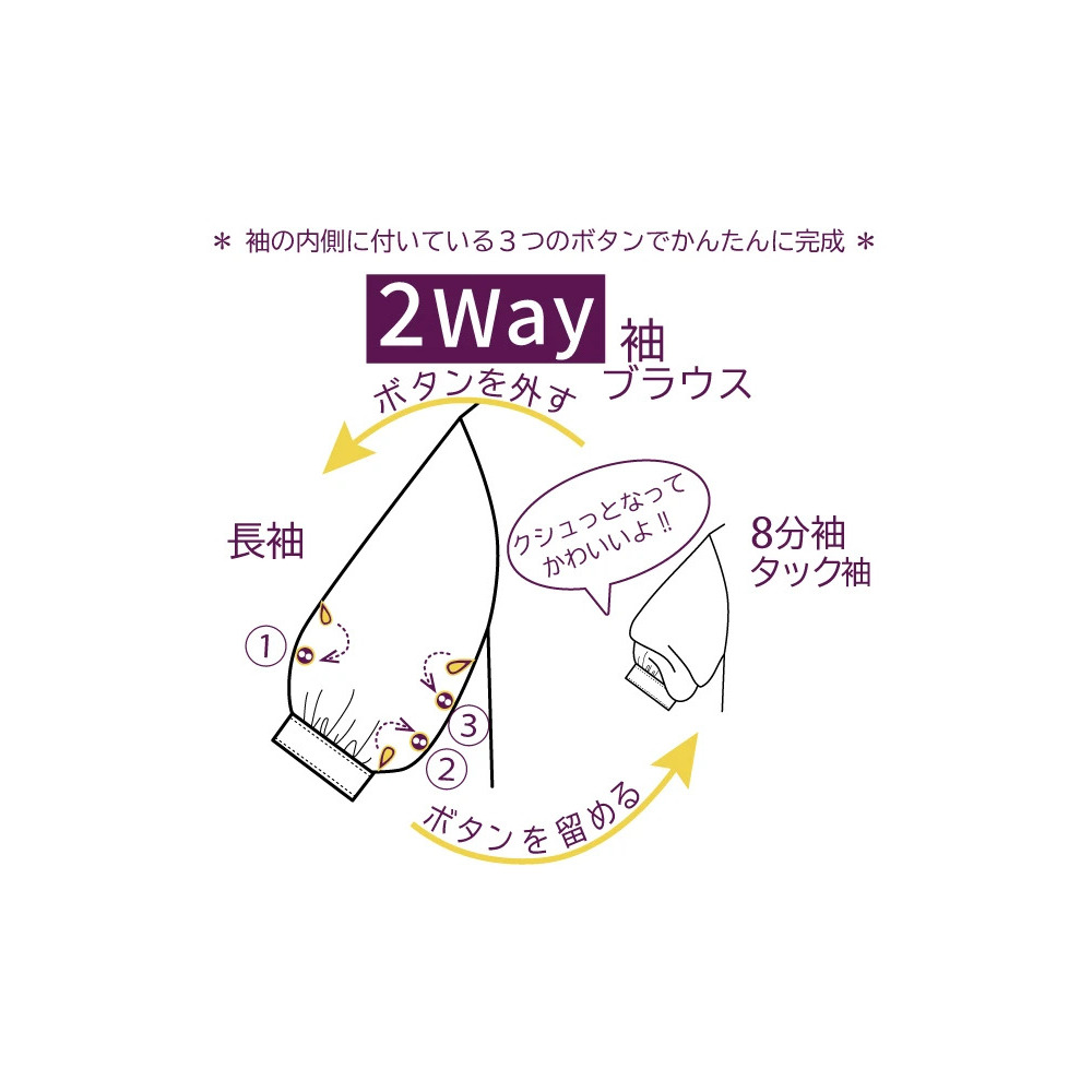 ・袖の内側についているボタンで8分袖のタックスリーブデザインに。