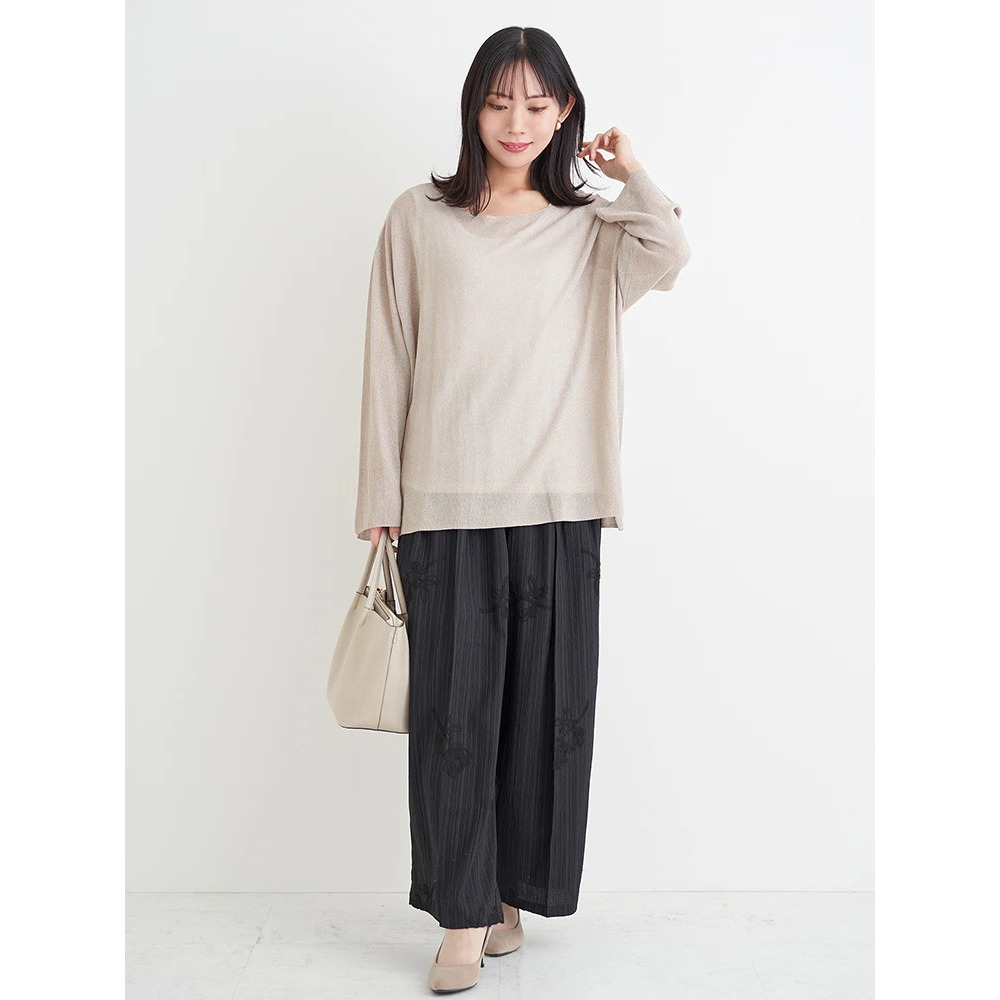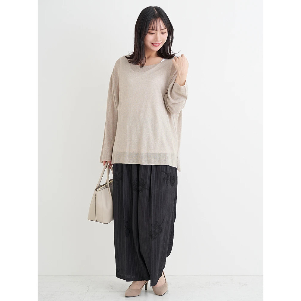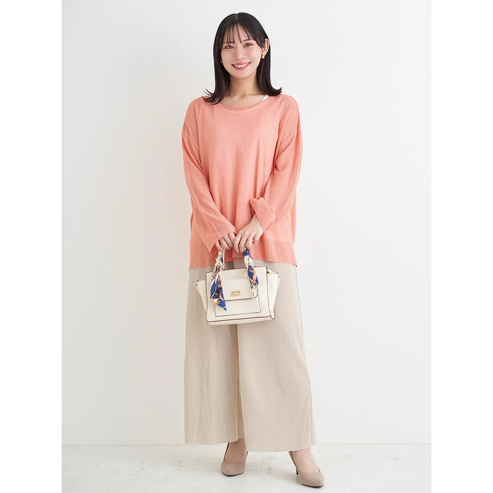 ・上品な輝きのラメ入りのニットはフェミニンな印象をプラス。
