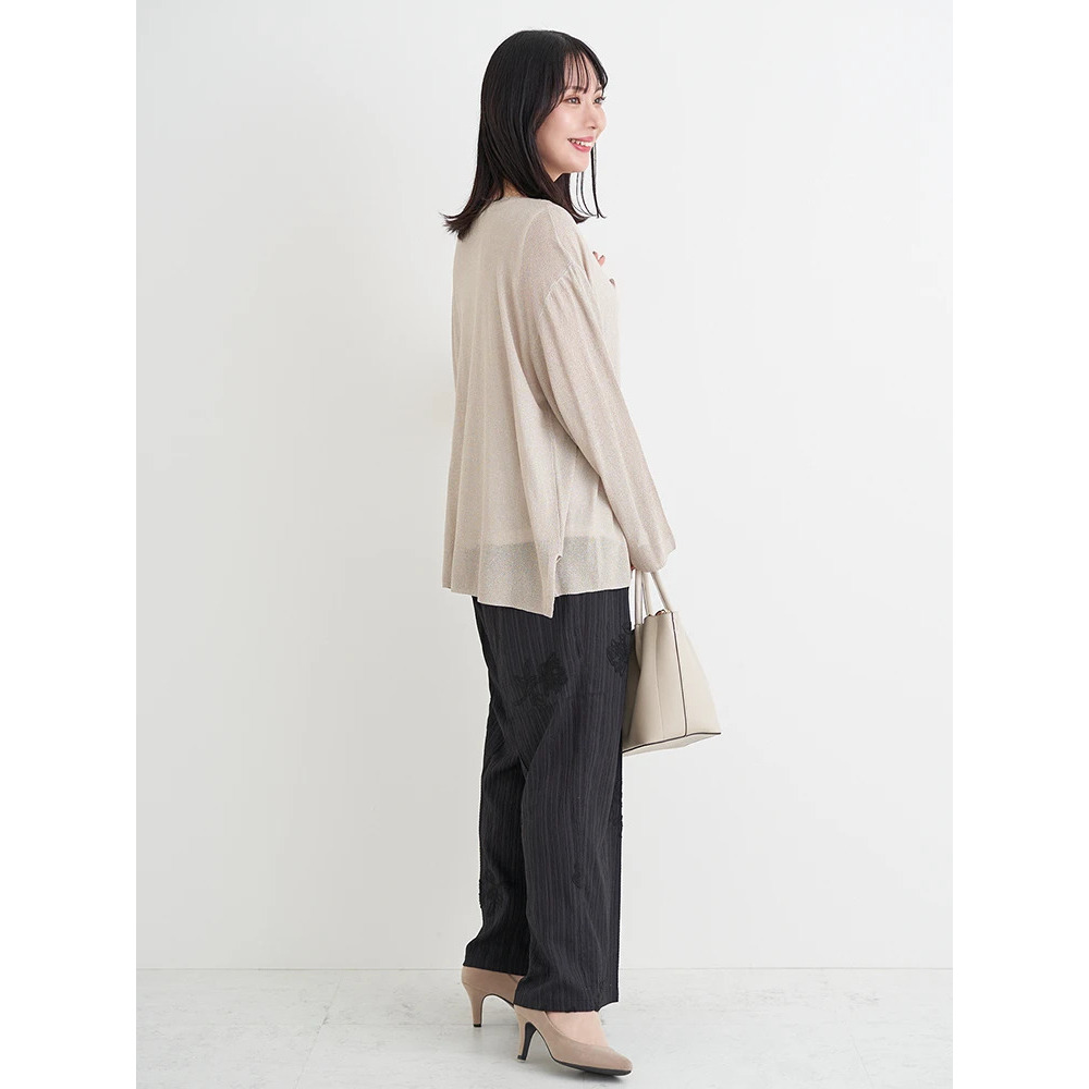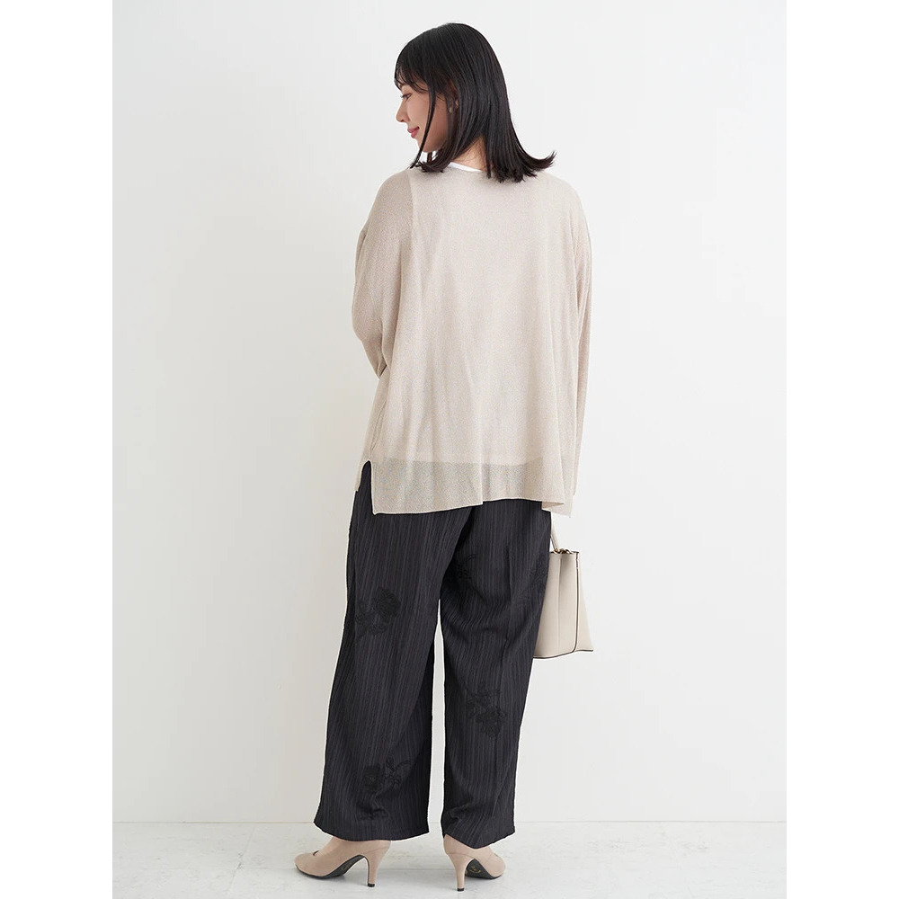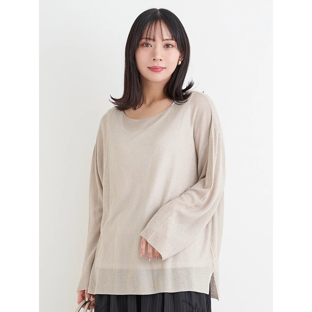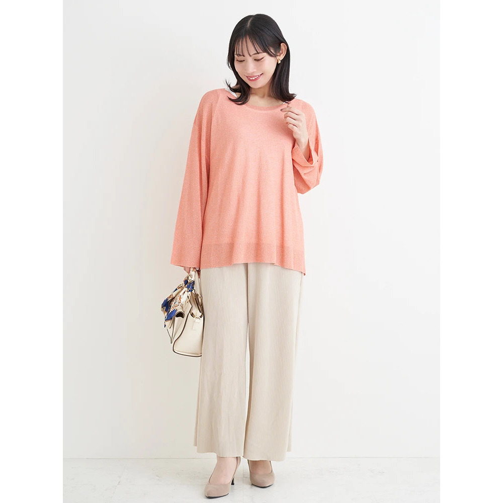 ・上品な輝きのラメ入りのニットはフェミニンな印象をプラス。