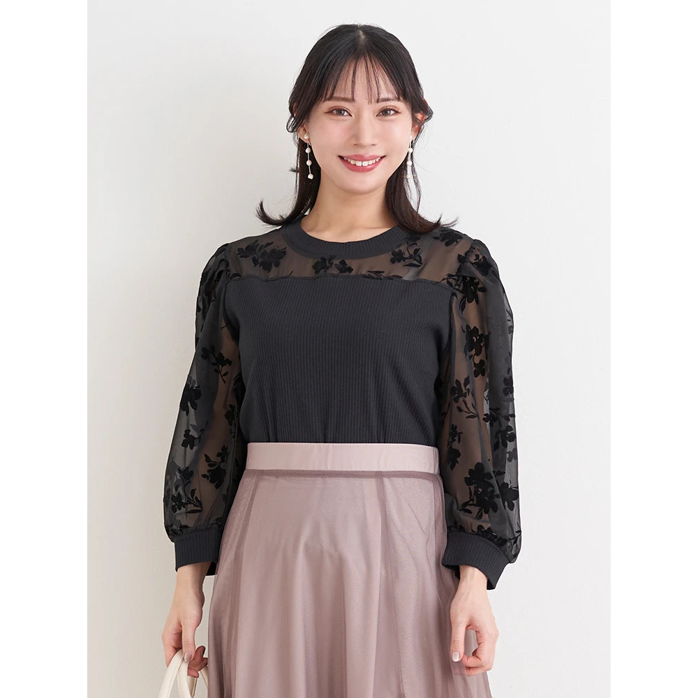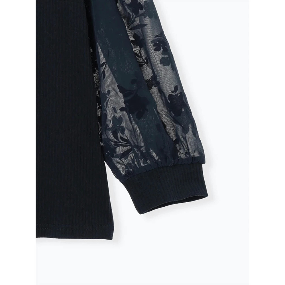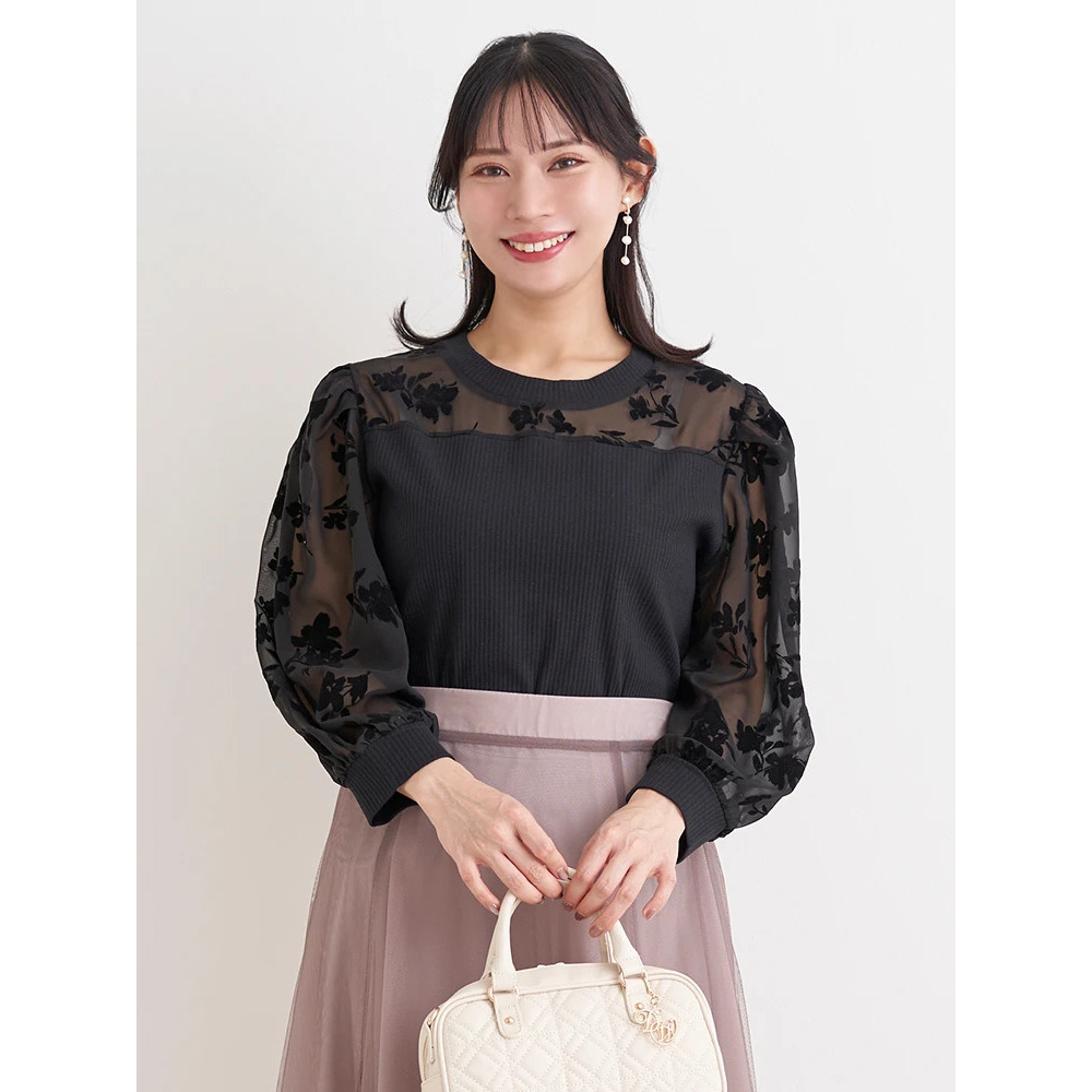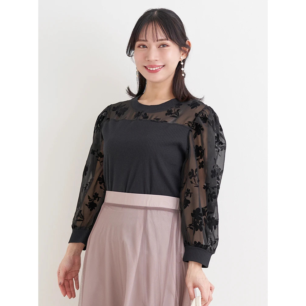 花柄のフロッキープリントを施したシアー素材と、伸縮性のあるテレコ素材を使用。
